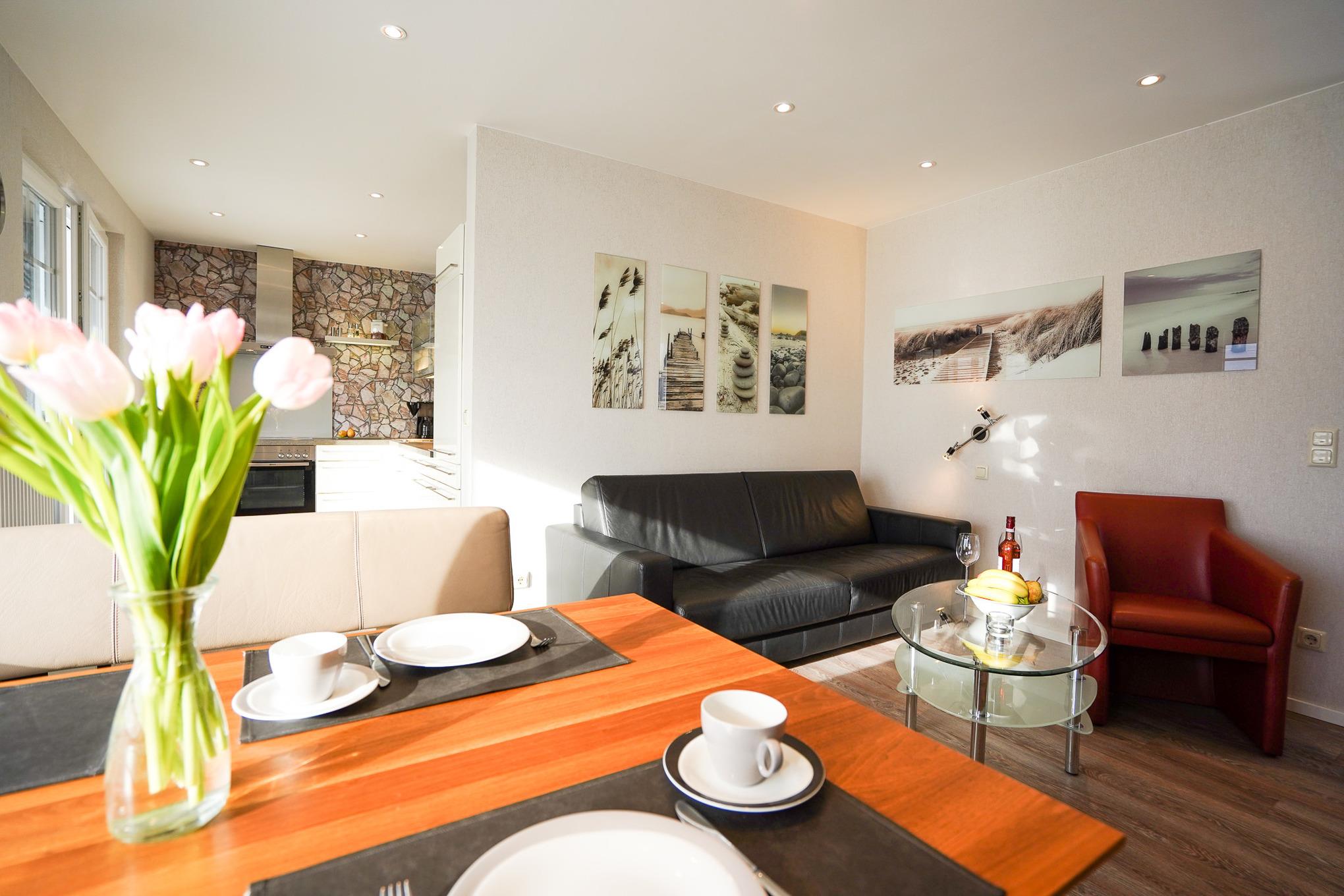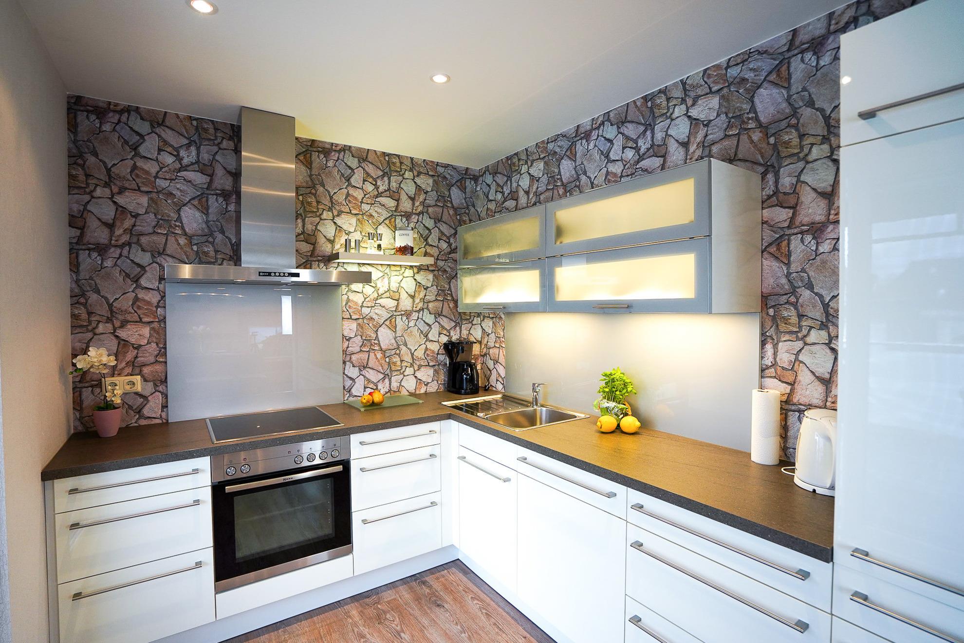 Im lichtdurchfluteten Wohnzimmer mit Sofa, Sessel und Essgruppe stehen Ihnen ein großer Flatscreen-TV, eine Stereoanlage mit ausgezeichnetem Klang und selbstverständlich WLAN zum Ausklingen des Tages zur Verfügung. Die stilvolle und offene Küche ist mit allen erforderlichen Geräten wie bsp. Backofen, Cerankochfeld, Spülmaschine und Kühlschrank mit Gefrierfach ausgestattet.