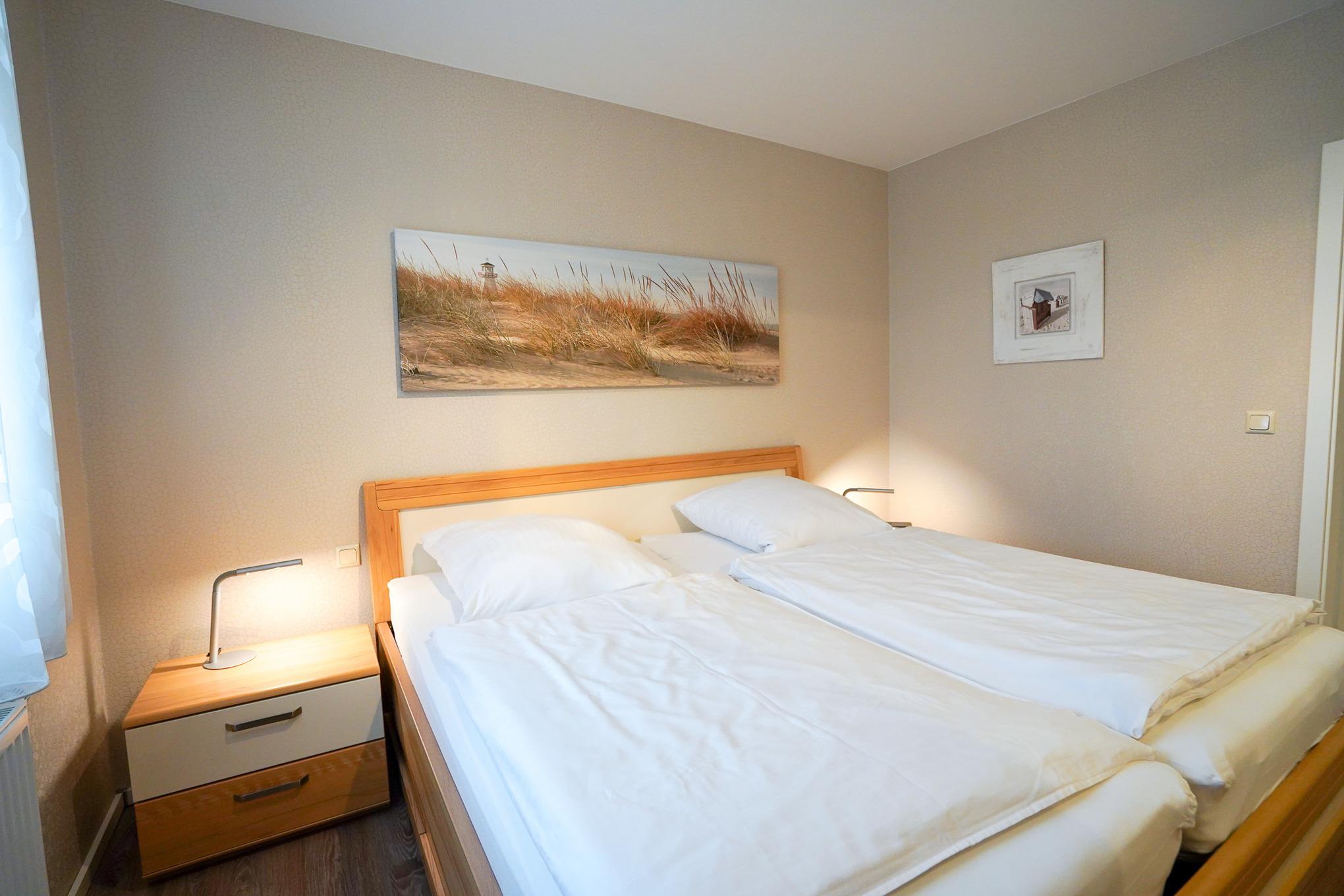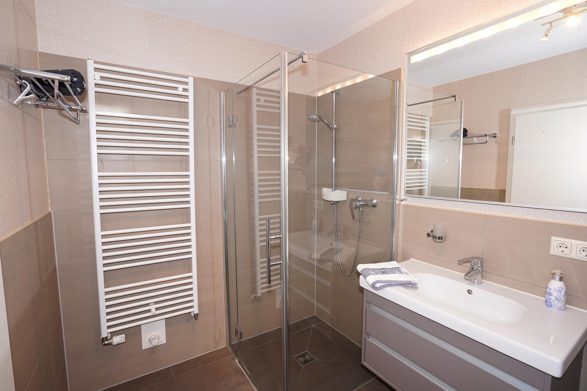 Das Schlafzimmer verfügt über ein großes Doppelbett (200 x 200 cm), eine kleine Schreibtischecke und einen weiteren Fernseher. Im modernen Badezimmer mit bodengleicher Dusche finden Sie zusätzlich eine Waschmaschine mit Trocknerfunktion vor.