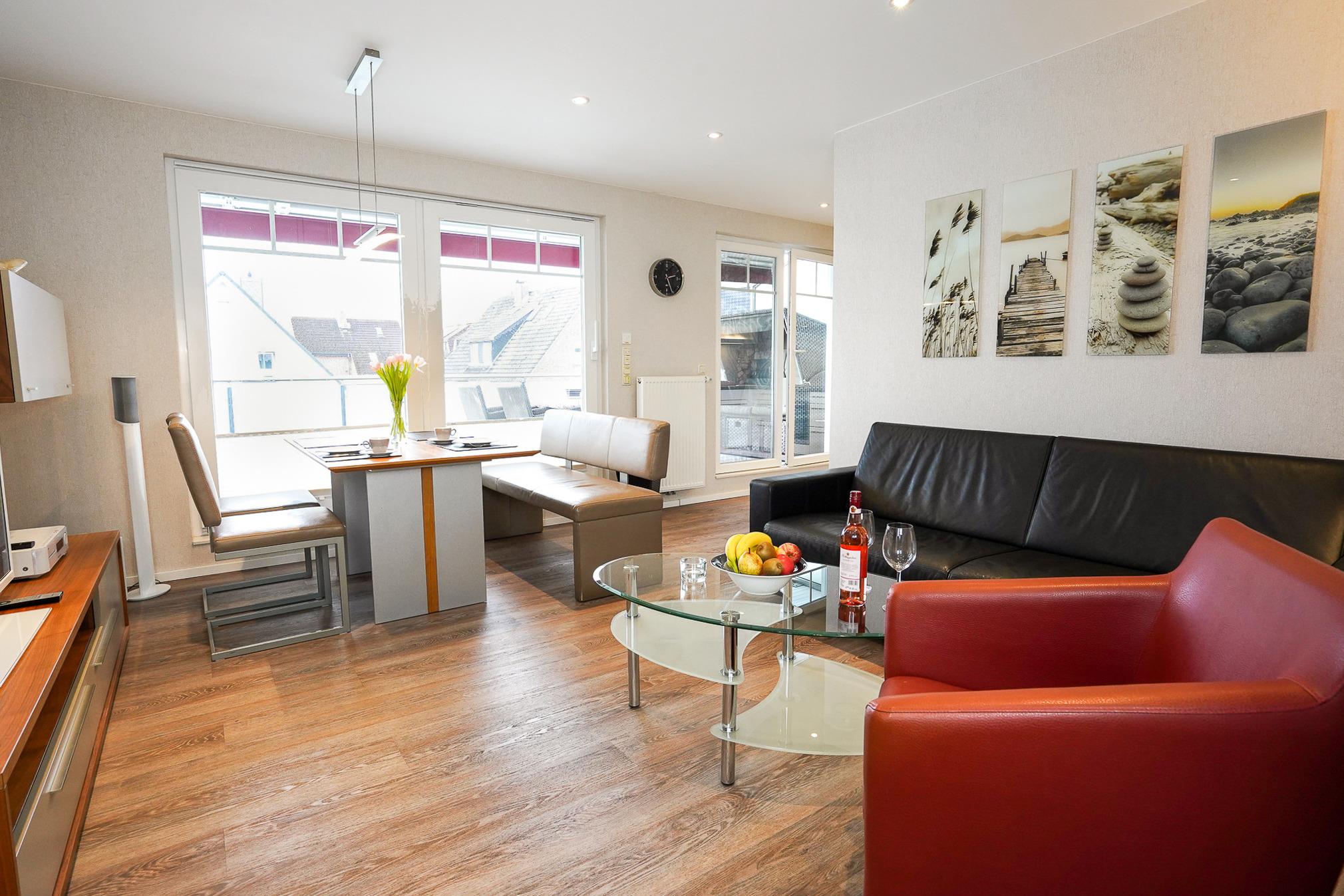 Diese Ferienwohnung lässt keine Wünsche offen. Das Herzstück bildet die große Dachterrasse, die sich in sonniger Südwestlage über den kompletten Wohn- und Küchenbereich erstreckt. Genießen Sie Ruhe und Entspannung in Ihrem gemütlichen Strandkorb, auf der vorhandenen Liege oder an Ihrem großzügigen Esstisch. Bei zu viel Sonnenschein steht Ihnen die elektrisch betriebene Markise zur Verfügung.