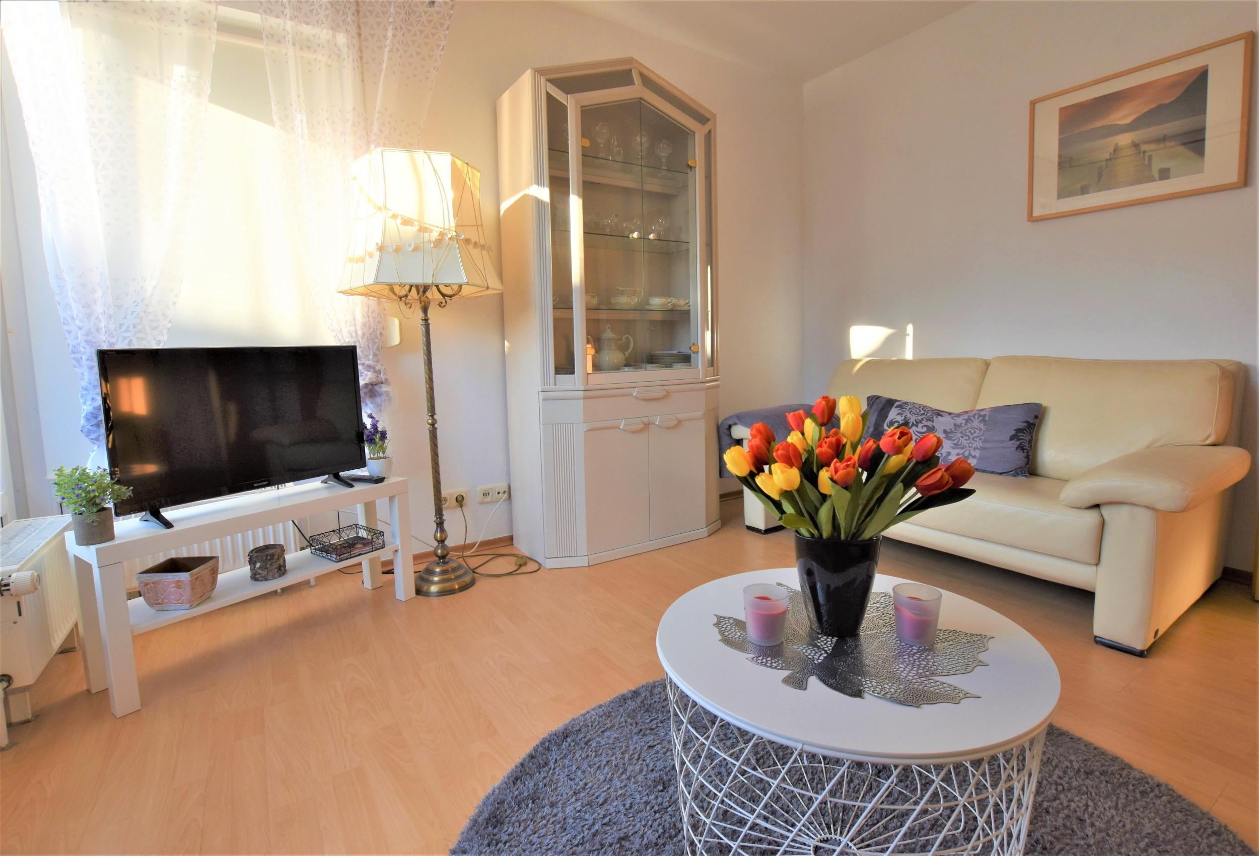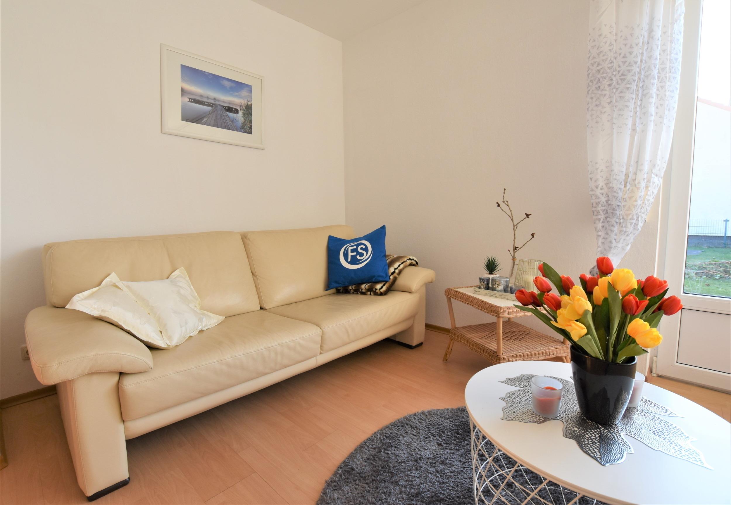 - Wohnzimmer: Der helle Wohnbereich lädt mit einem Sofabereich und einem TV zum Entspannen ein. Von hier aus gelangen Sie direkt auf die bestuhlte Terrasse, wo Sie die frische Ostseeluft genießen können.