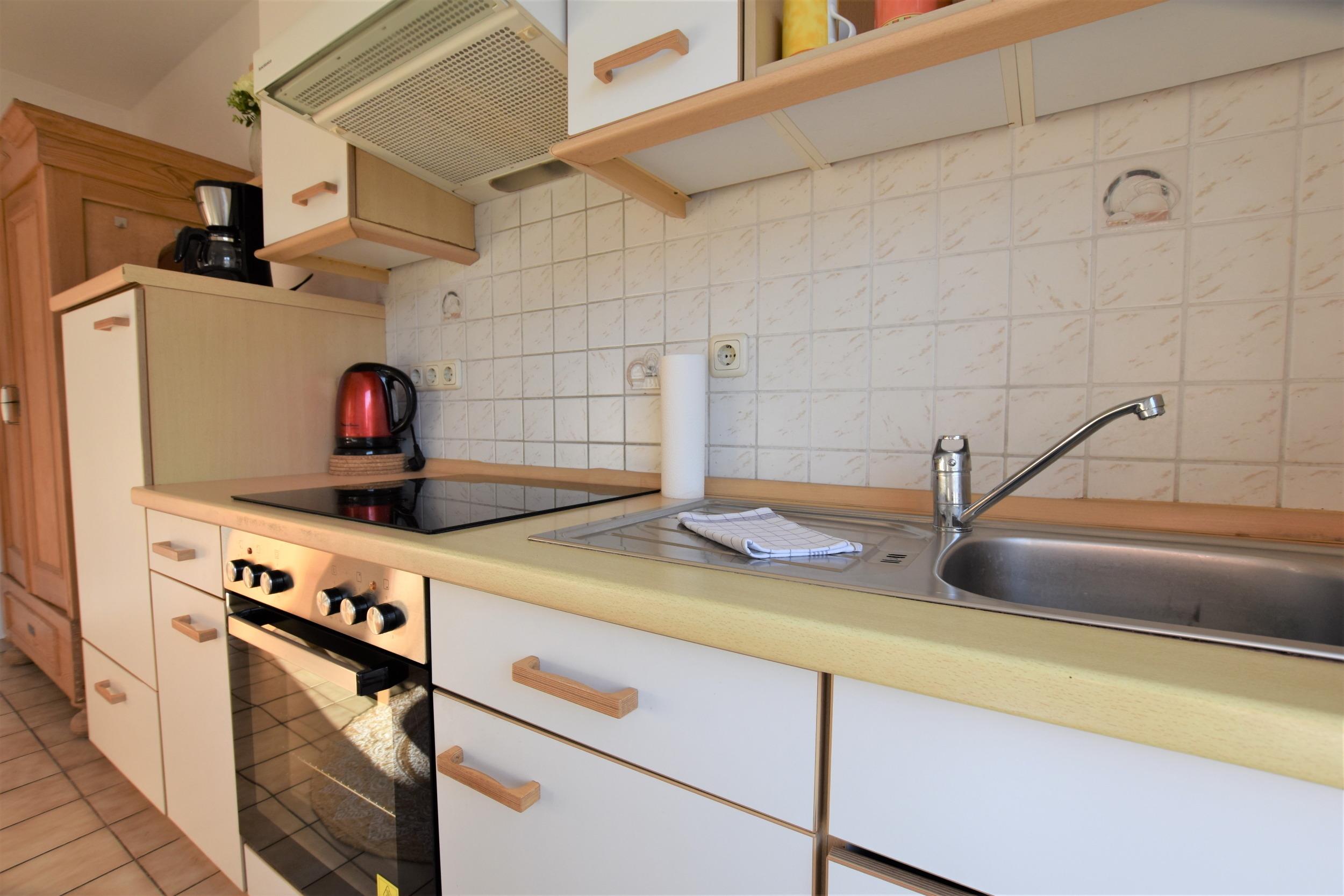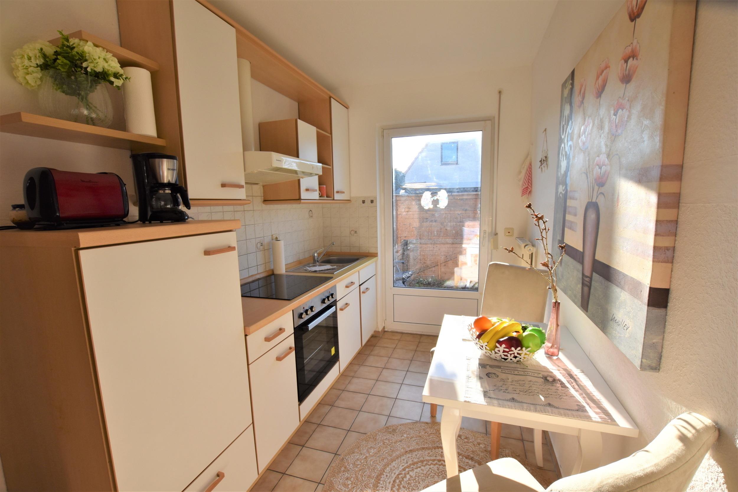 - Küche: Die gut ausgestattete Küche mit Esstisch, Wasserkocher, Backofen, Kaffeemaschine und Toaster bietet alles, was Sie für die Zubereitung Ihrer Mahlzeiten benötigen. Auch hier haben Sie Zugang zur Terrasse.