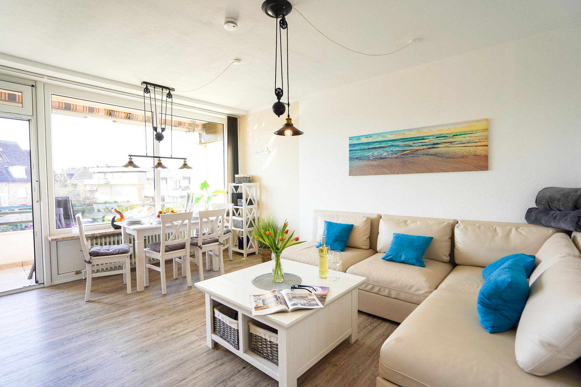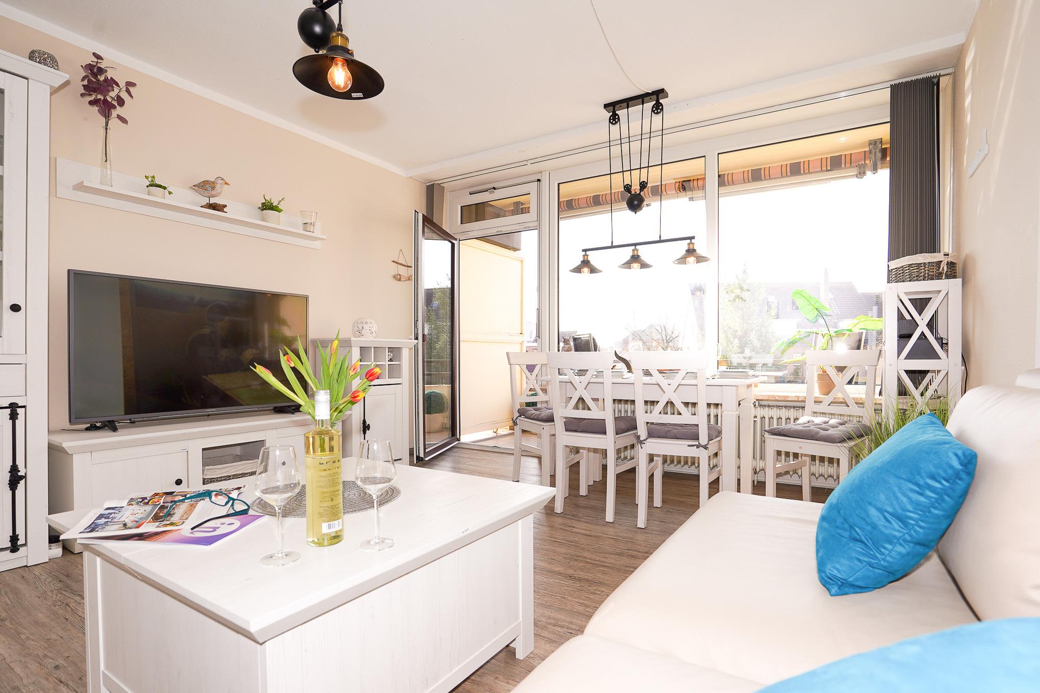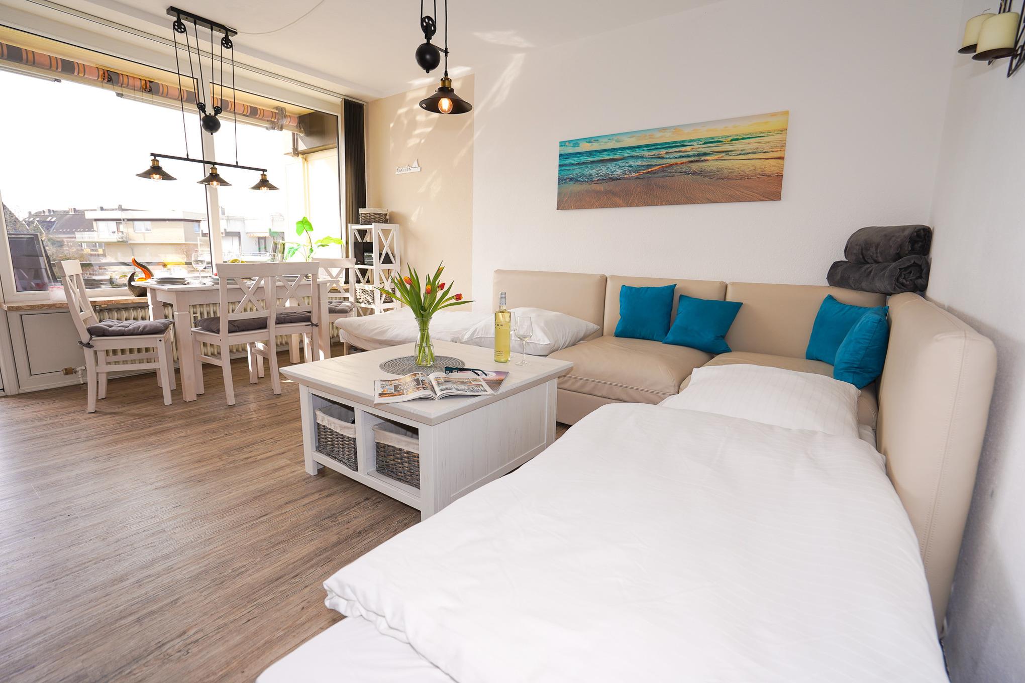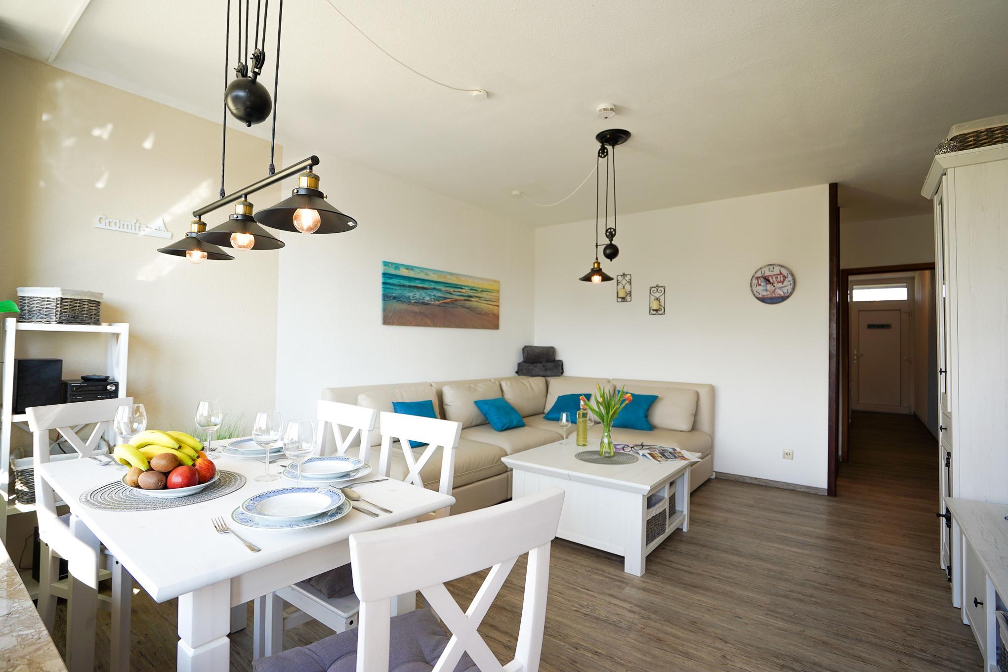 Den Mittelpunkt der Wohnung bildet der lichtdurchflutete, kombinierte Wohn-/Essbereich mit direktem Balkonzugang. Hier lässt es sich auf dem großzügigen Sofa auch an Regentagen gemütlich machen. Ein großer Flachbildfernseher, DVD-Player und eine Stereoanlage sorgen für Unterhaltung. W-LAN ist hier selbstverständlich kostenlos vorhanden. Das Sofa lässt sich abends bei Bedarf mit wenigen Handgriffen leicht in eine Schlafstätte verwandeln.