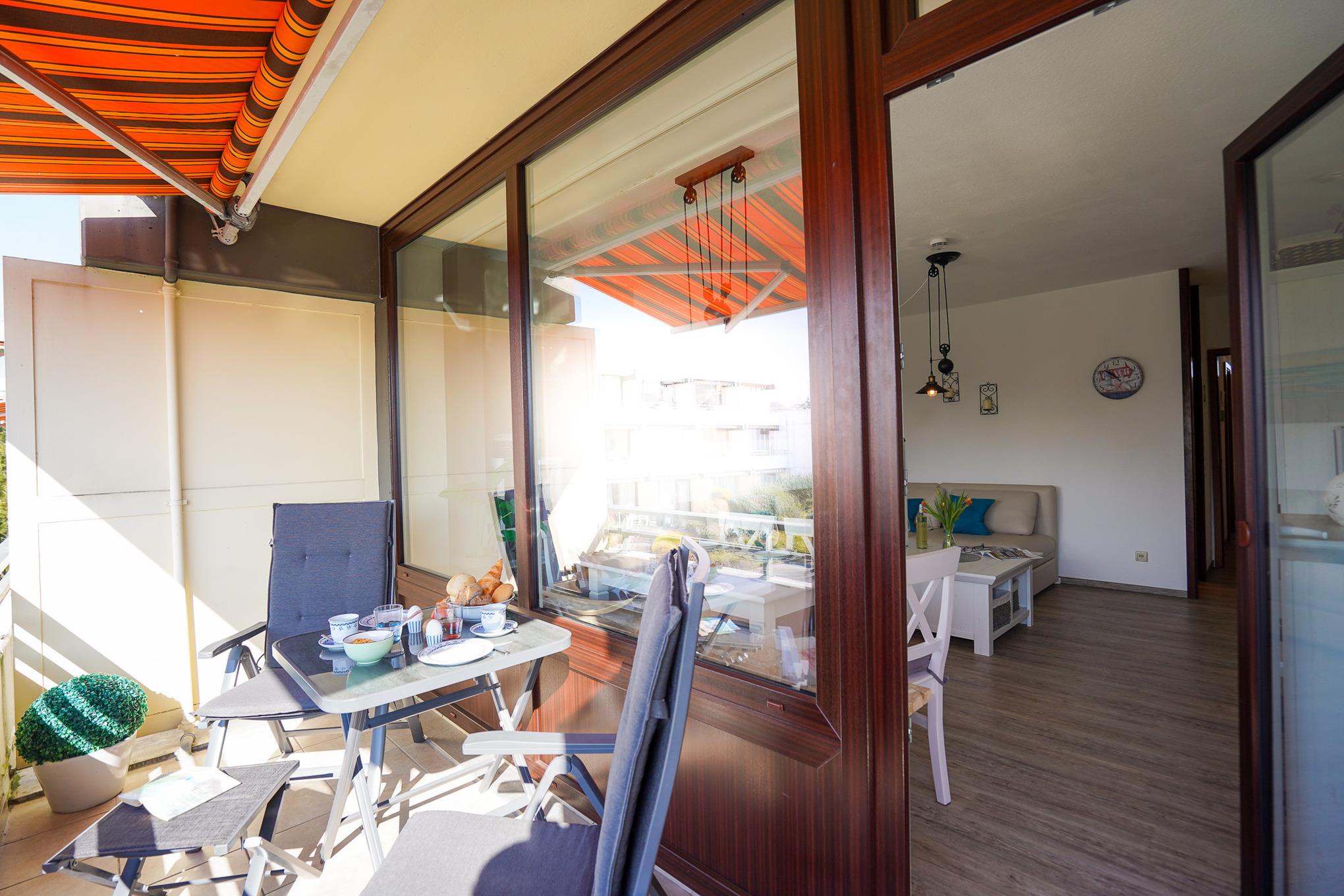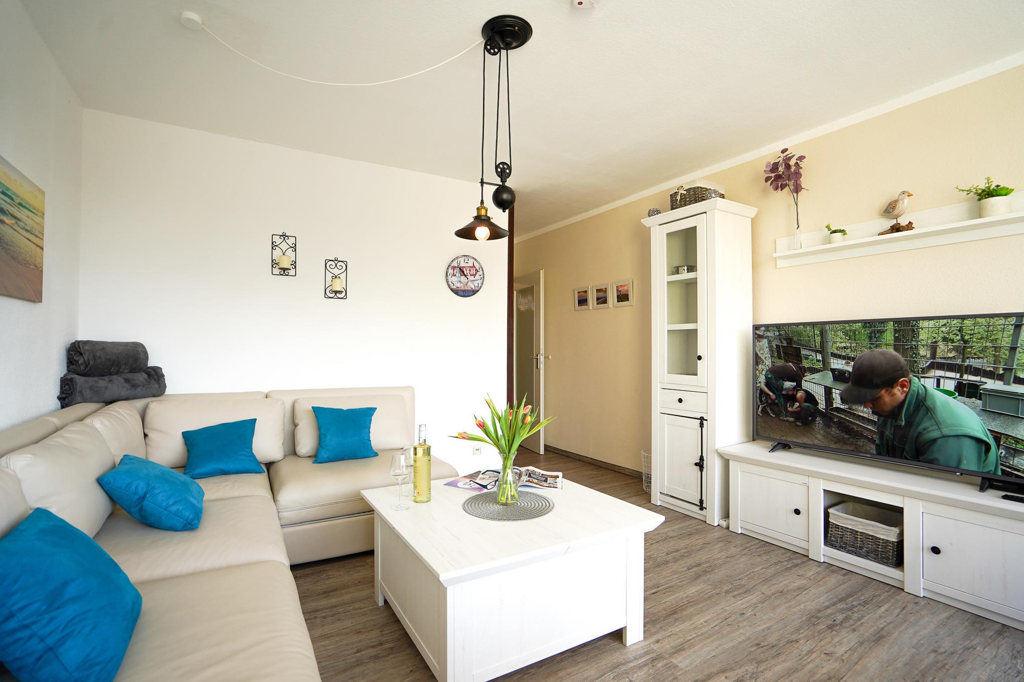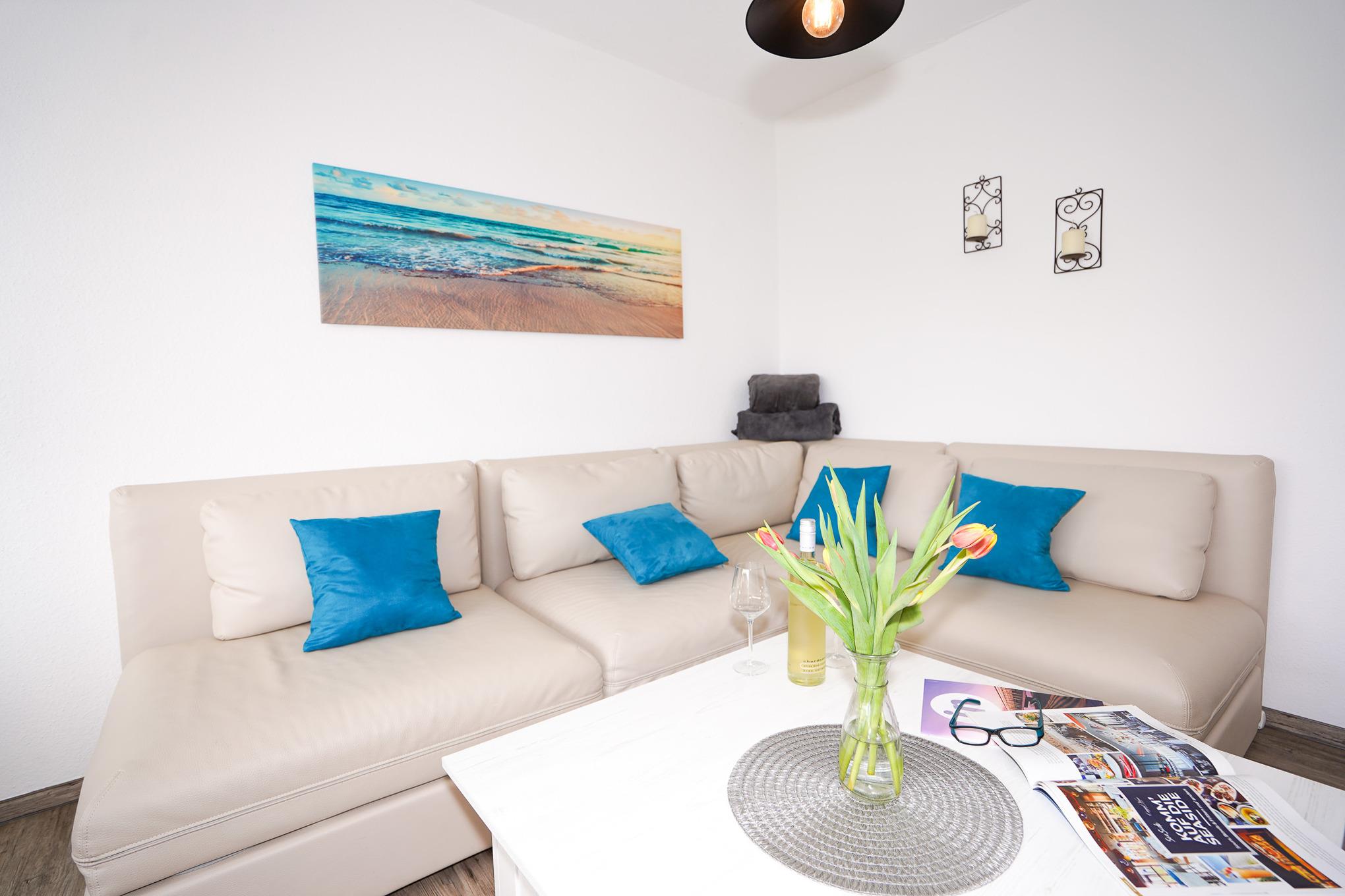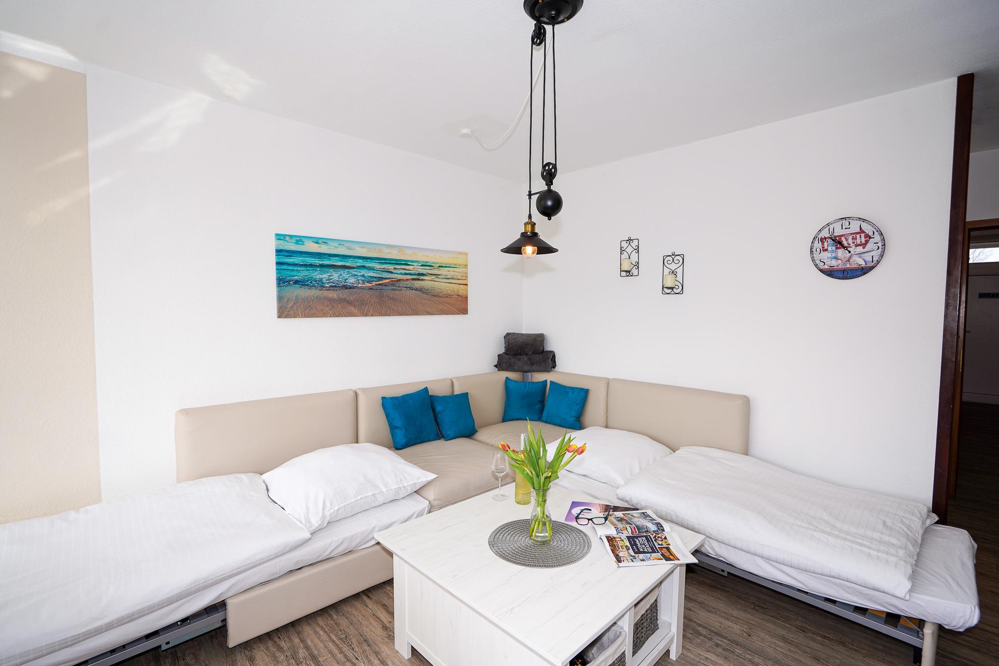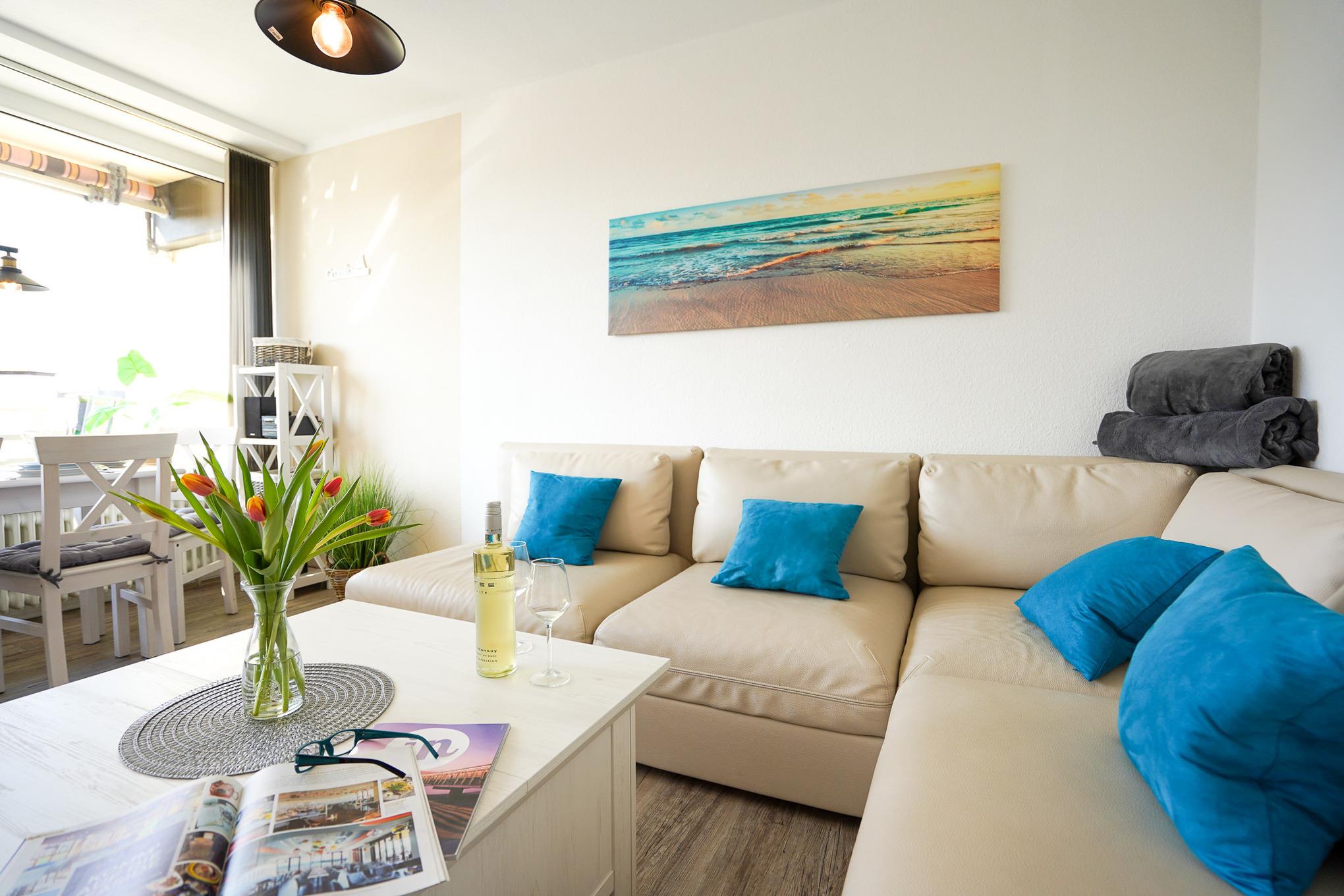 Den Mittelpunkt der Wohnung bildet der lichtdurchflutete, kombinierte Wohn-/Essbereich mit direktem Balkonzugang. Hier lässt es sich auf dem großzügigen Sofa auch an Regentagen gemütlich machen. Ein großer Flachbildfernseher, DVD-Player und eine Stereoanlage sorgen für Unterhaltung. W-LAN ist hier selbstverständlich kostenlos vorhanden. Das Sofa lässt sich abends bei Bedarf mit wenigen Handgriffen leicht in eine Schlafstätte verwandeln.