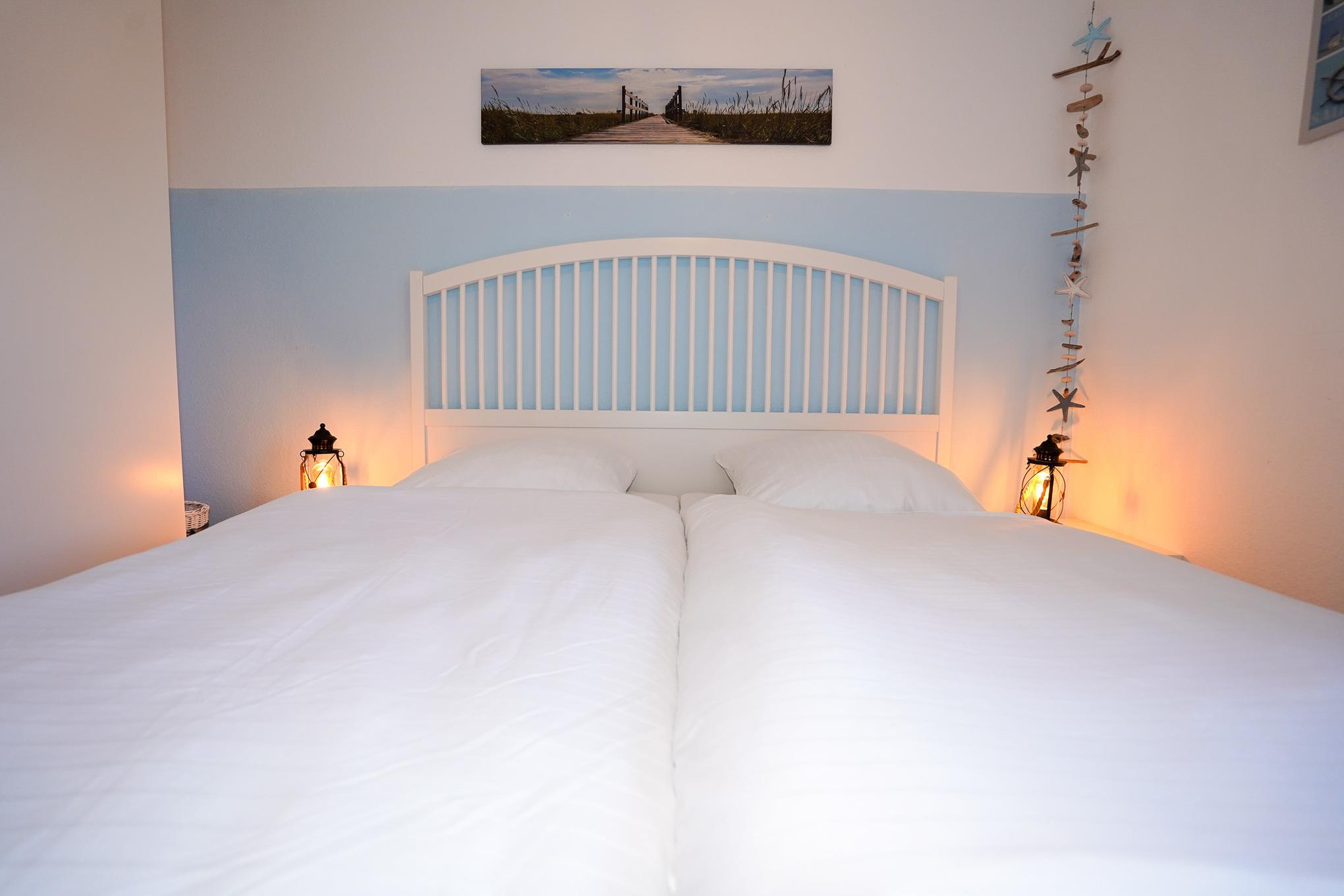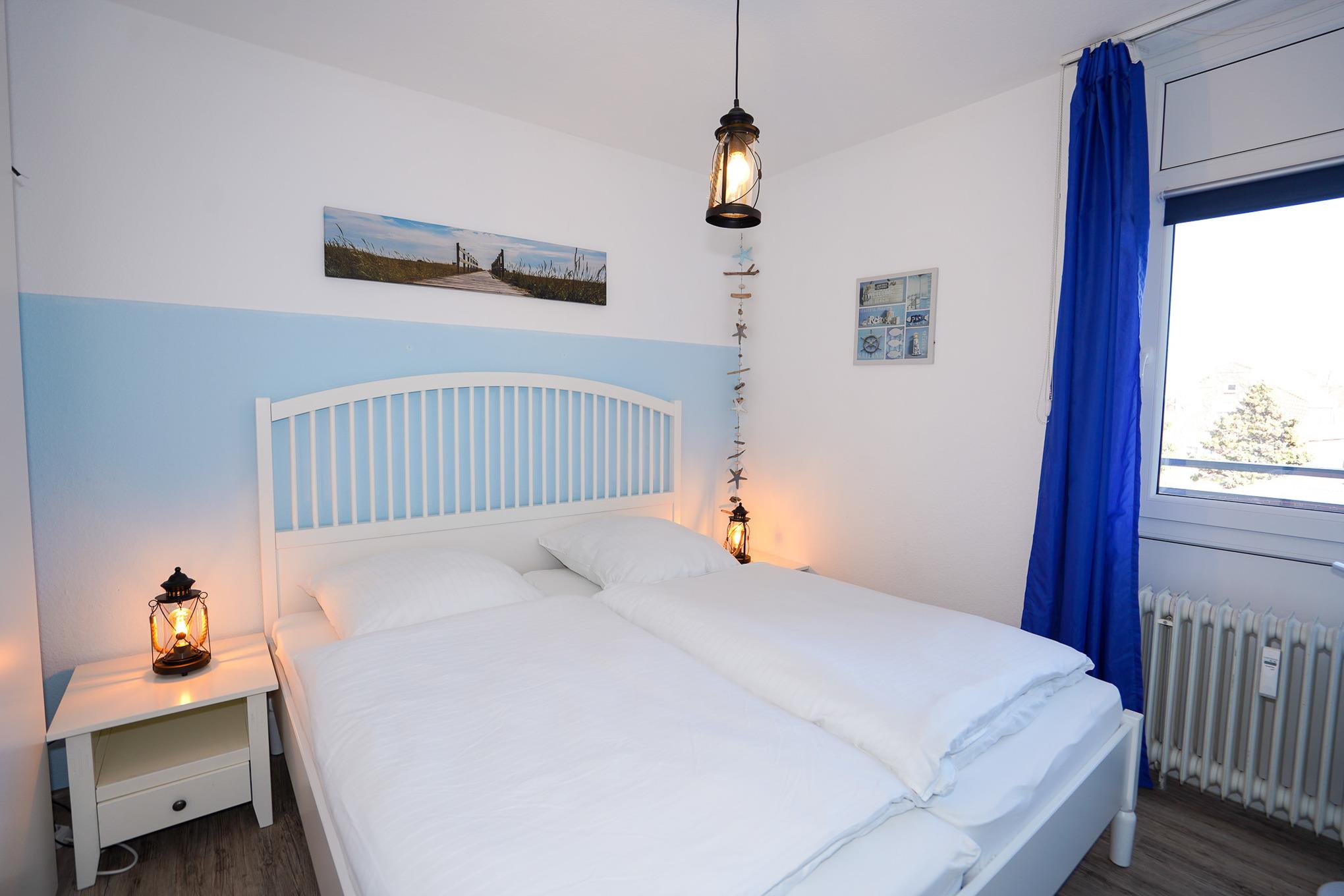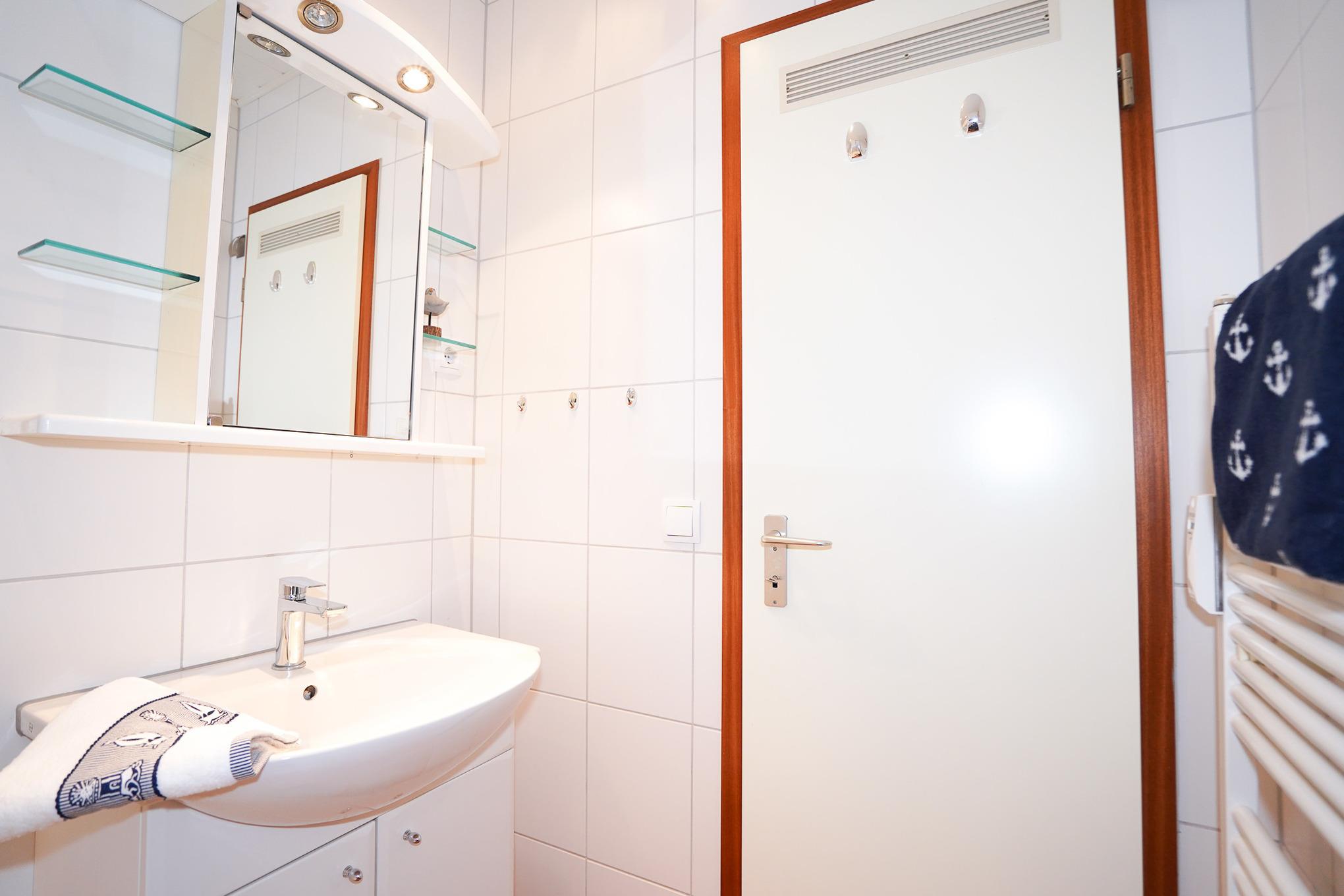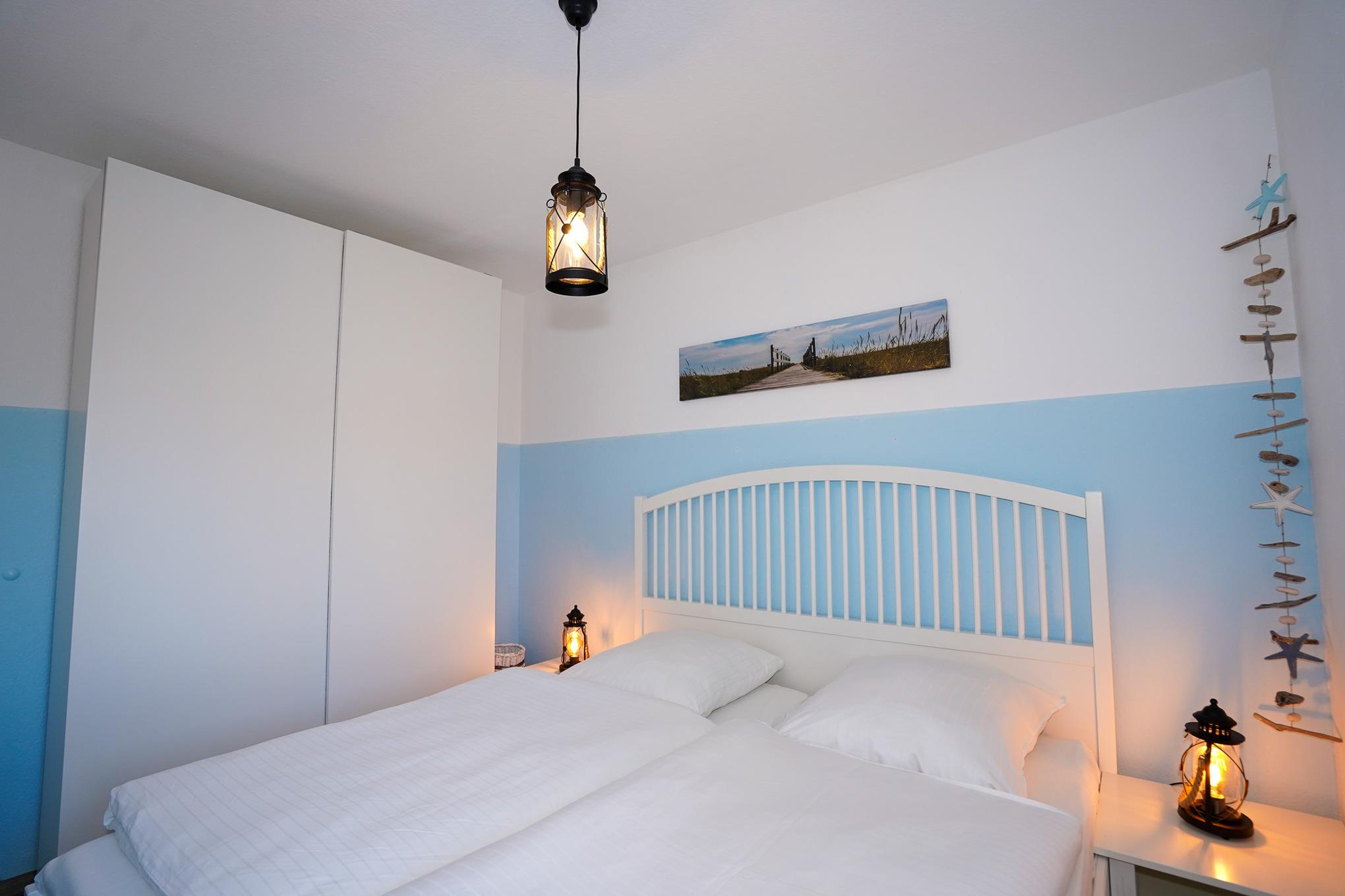 Im Schlafzimmer, welches mit einem bequemen Doppelbett ausgestattet ist, befindet sich durch einen großen Kleiderschrank ausreichend Staumöglichkeit für Ihre Urlaubskleidung. Das geschmackvolle Badezimmer ist hell gefliest und mit allem ausgestattet, was Sie für die körperliche Hygiene benötigen.