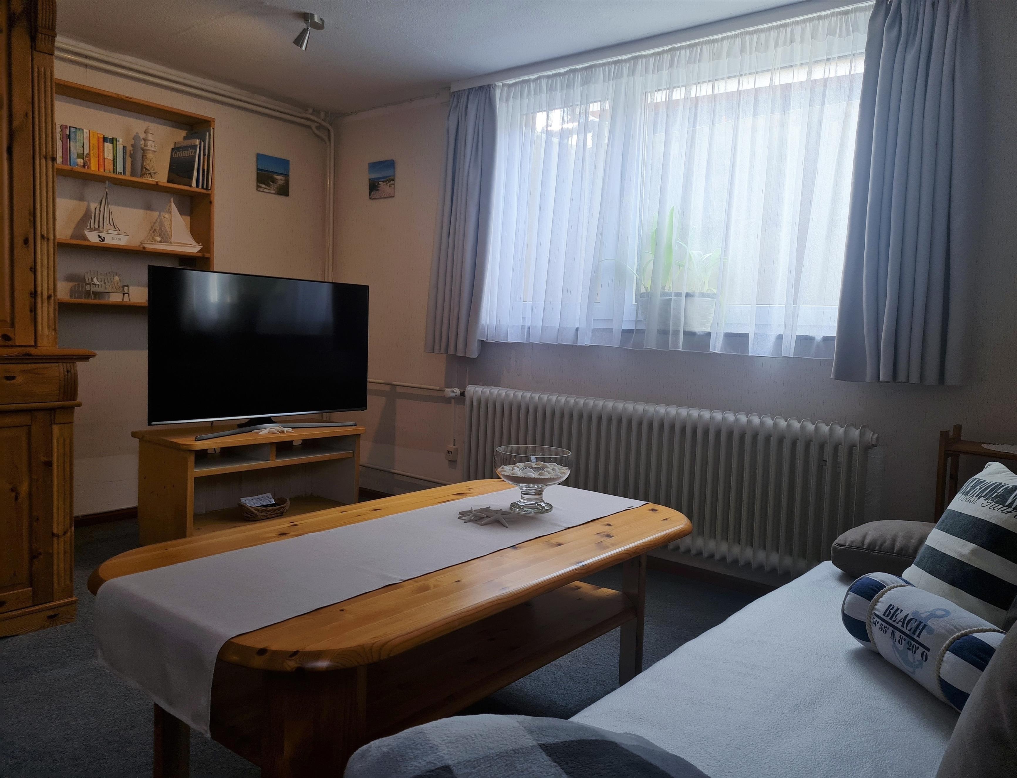 Die Wohnung verfügt über ein Wohnzimmer mit Essecke, 2 Schlafzimmer ( 1 Schlafzimmer mit Doppelbett, 1 Schlafzimmer mit zwei Einzelbetten je 90 x 200 cm, abdunkelbare Fenster durch Außenrolläden ), Küche, Flur und Bad.