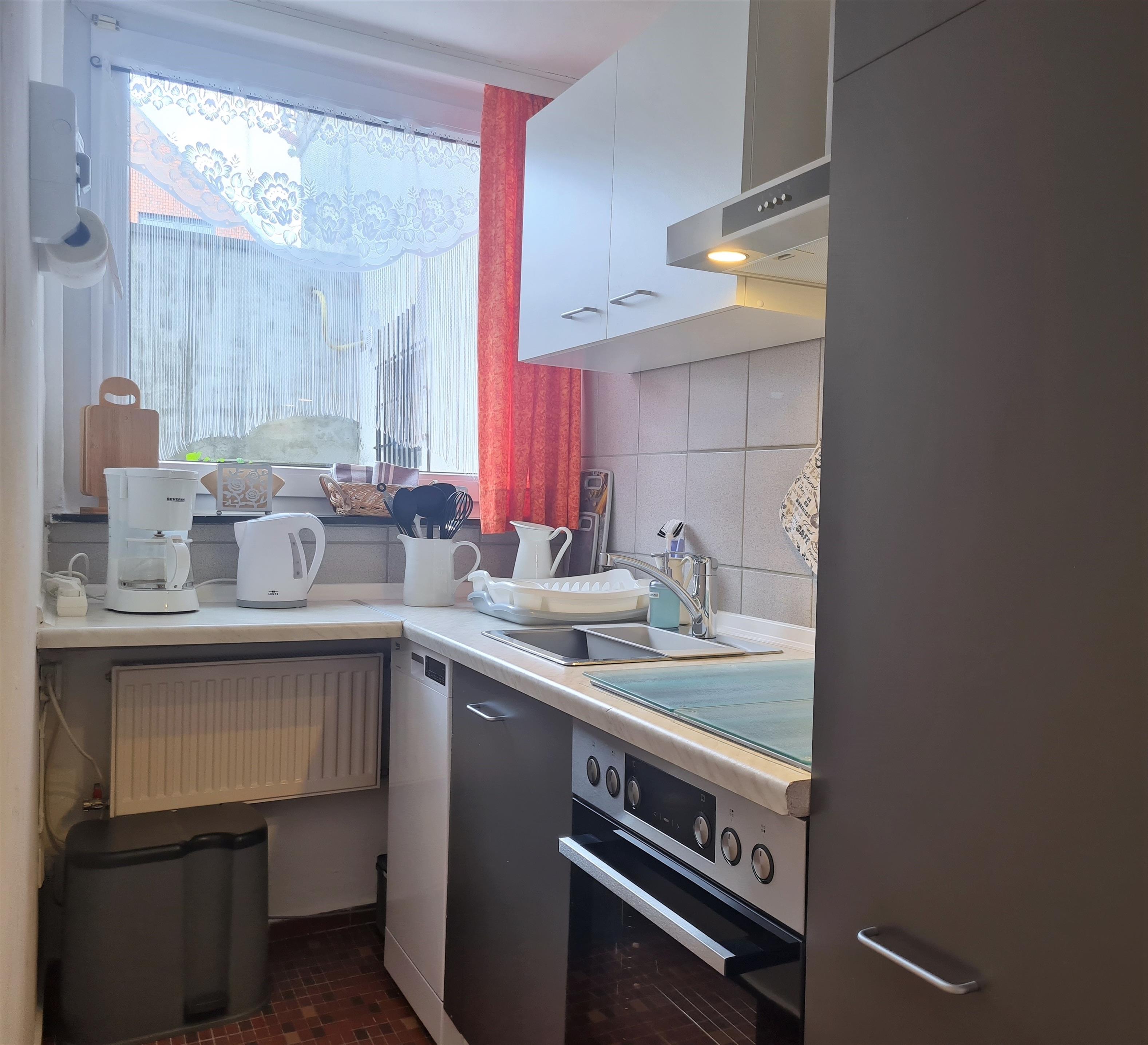 Die Küche ist mit einem Cerankochfeld mit Dunstabzugshaube, Backofen, Kühlschrank mit Gefrierfach, Mikrowelle, Kaffeemaschine, Geschirrspüler sowie weiteren Kleingeräten und Kochutensilien ausgestattet.