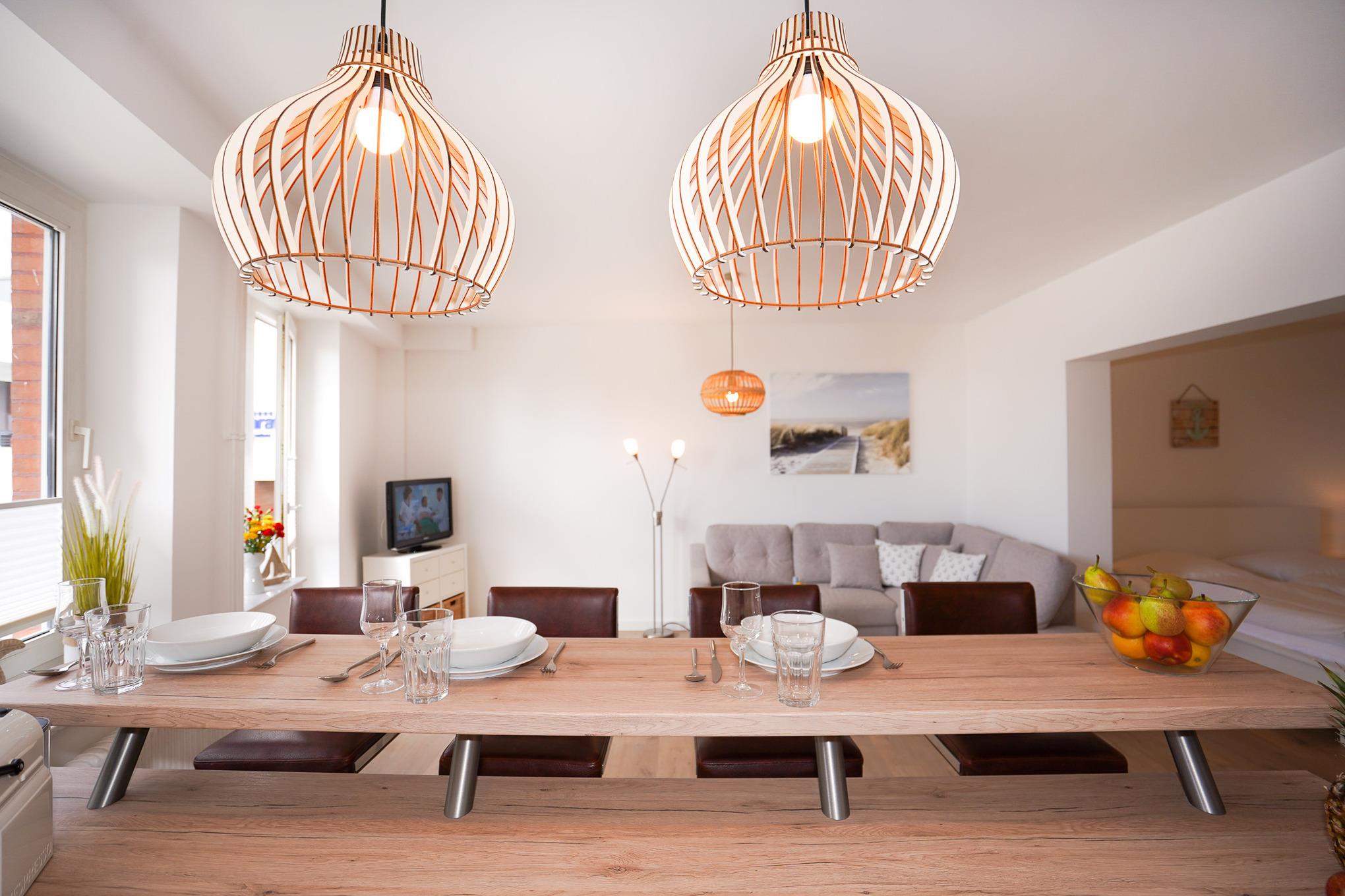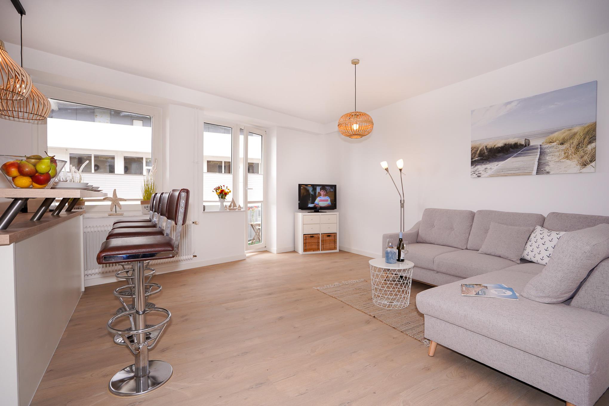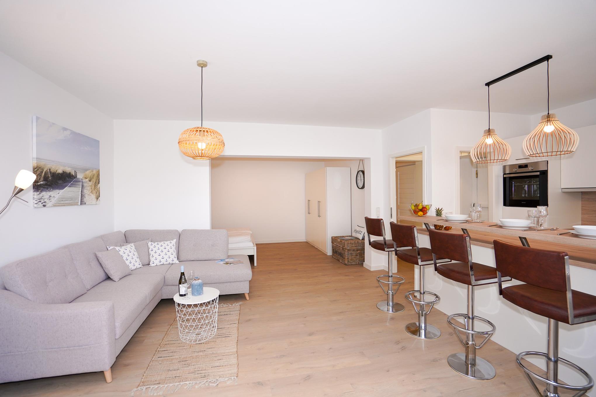 Die hochwertige und neue Küchenzeile ist sehr gut ausgestattet. Sie finden hier selbstverständlich eine Geschirrspülmaschine, einen Backofen, Kühlschrank mit Gefrierfach und diverse Elektrokleingeräte. Ihre Mahlzeiten nehmen Sie an dem gemütlichen Tresen zu sich. Abgerundet wird die Wohnung mit einem funktionalen und weiß gefliesten Badezimmer. Kostenloses W-LAN ist in dieser Ferienwohnung selbstverständlich vorhanden