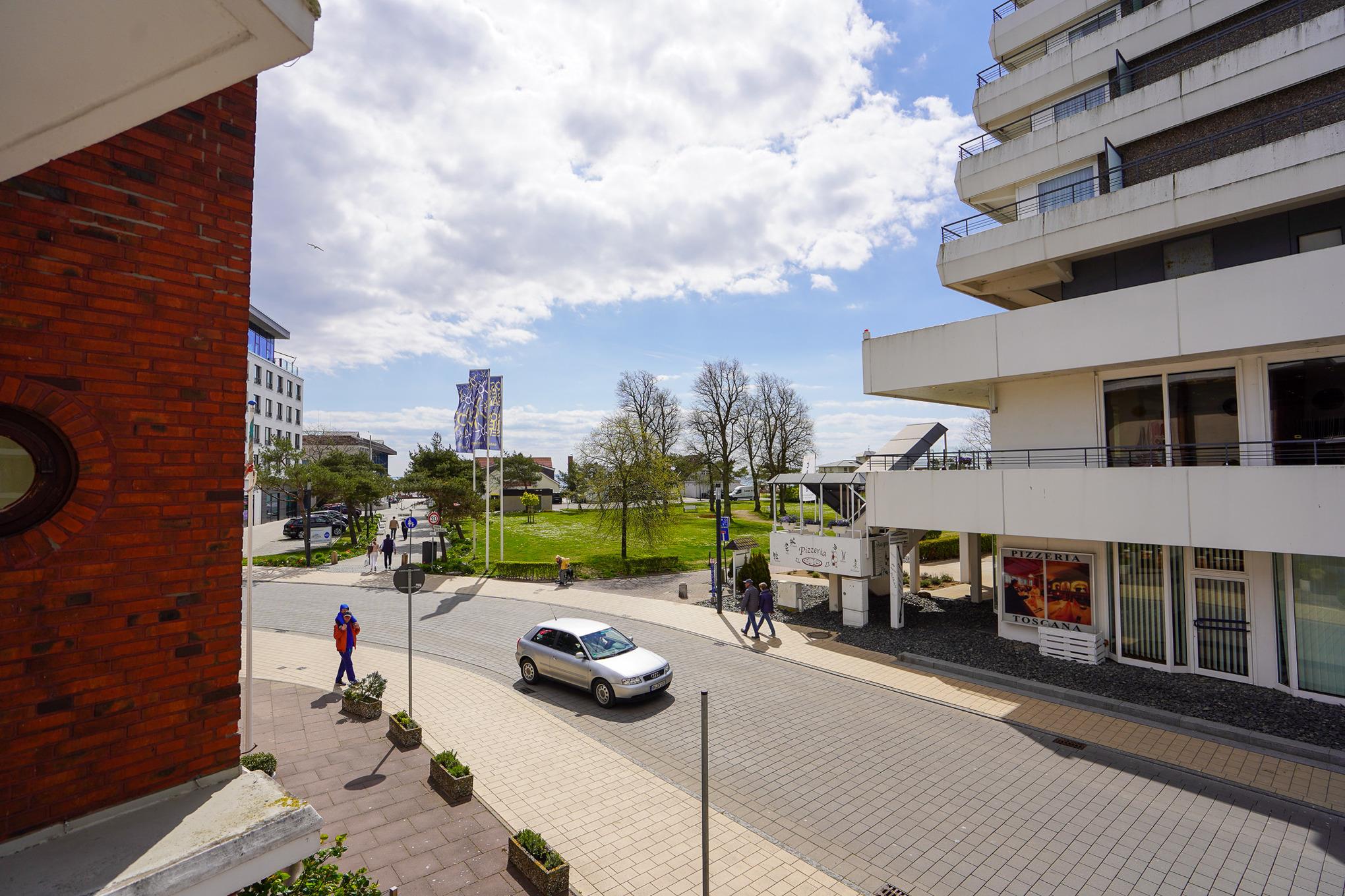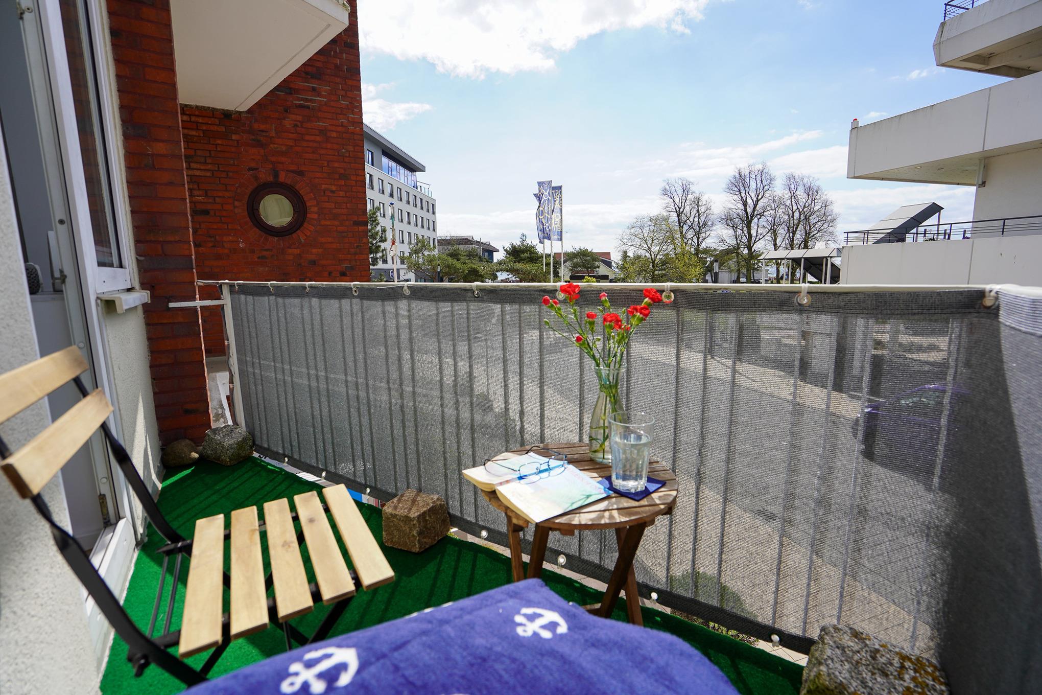 Entspannen Sie nach einem ausgiebigen Tag am Strand auf Ihrem gemütlichen kleinen Balkon mit seitlichem Teilmeerblick bei einem Glas Wein.