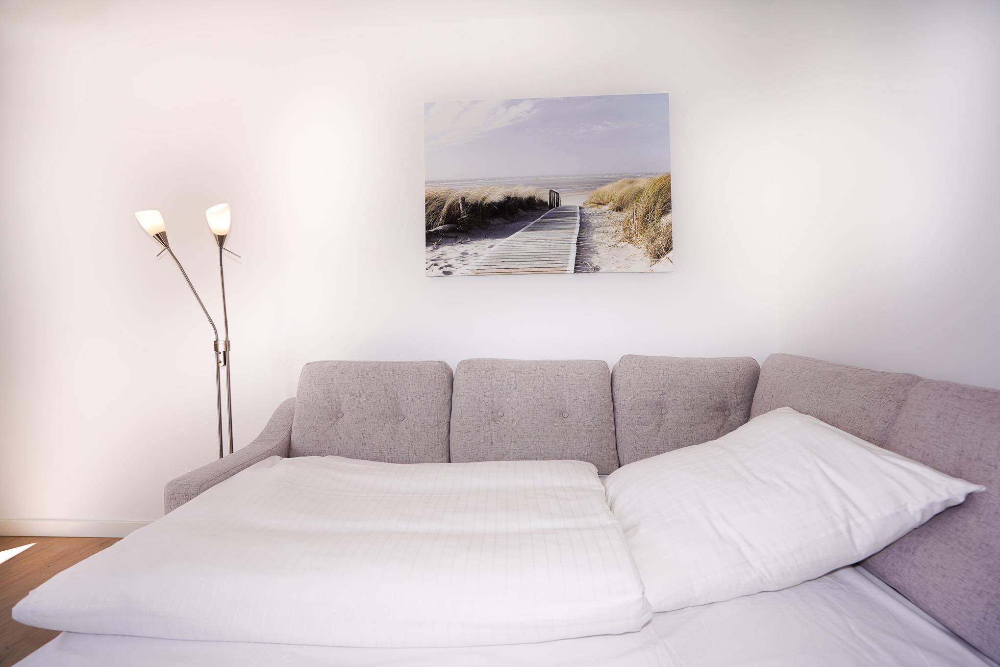 Der Wohnraum ist ausgestattet mit einem Eckschlafsofa, einem kleinen Couchtisch und einem Fernseher. Im Schlafbereich finden Sie ein bequemes Bett (durchgehende Matratze) und einen Kleiderschrank vor.
