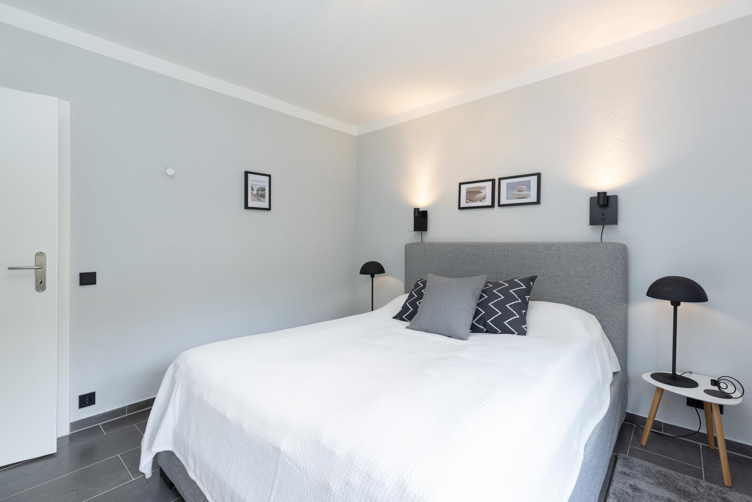 Das große 1. Schlafzimmer ist mit einem Doppelbett (Matratze 160x200), Nachttischen und Kleiderschrank ausgestattet.