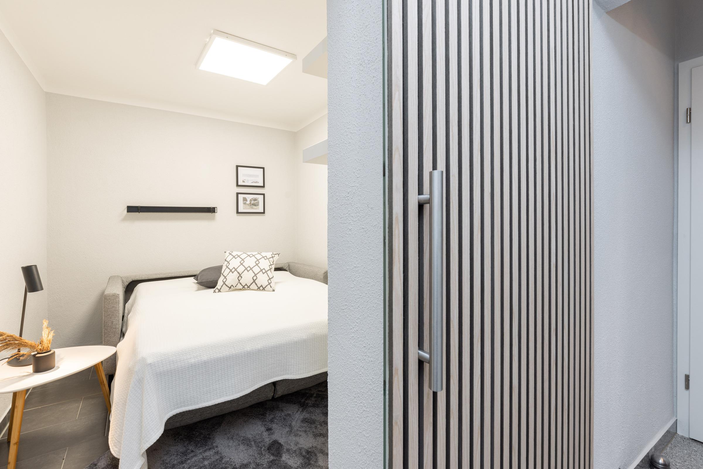 Der 2. Schlafraum ist innenliegend und mit einer komfortablen Schlafcouch (Matratze 140x200) ausgestattet. Wandborde und -haken sowie moderne Flechtkörbchen bieten Platz für die mitgebrachten Reiseutensilien. Die große Tageslicht-Flächenleuchte, die wie ein Oberlicht wirkt, lässt fast vergessen, dass der Raum über kein Fenster verfügt.