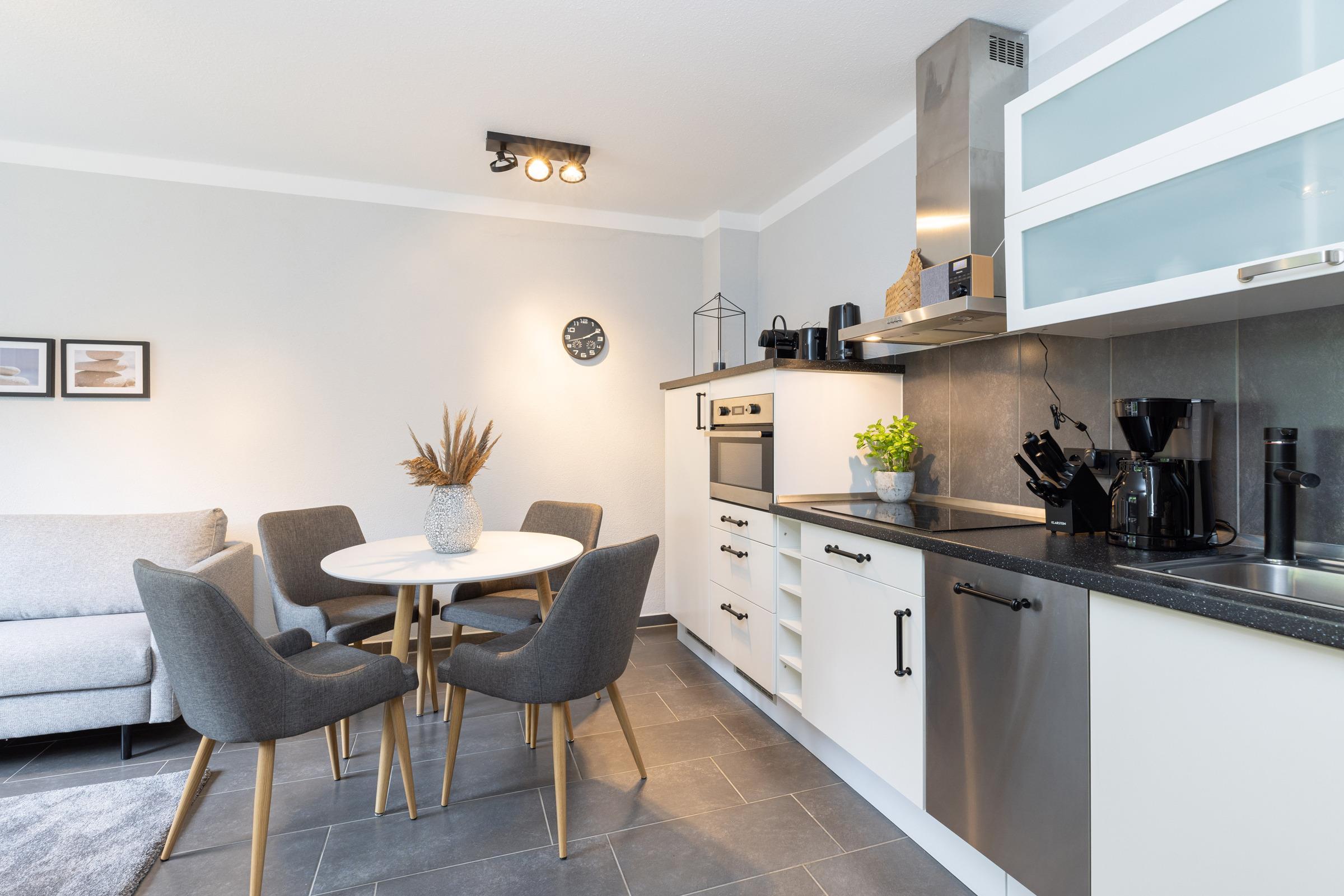 Der einladende, kombinierte Wohn-Essbereich mit offener Küche bietet modernes Wohlfühlklima und beste Ausstattung. Insbesondere der gut ausgestattete Kochbereich lässt nichts vermissen.