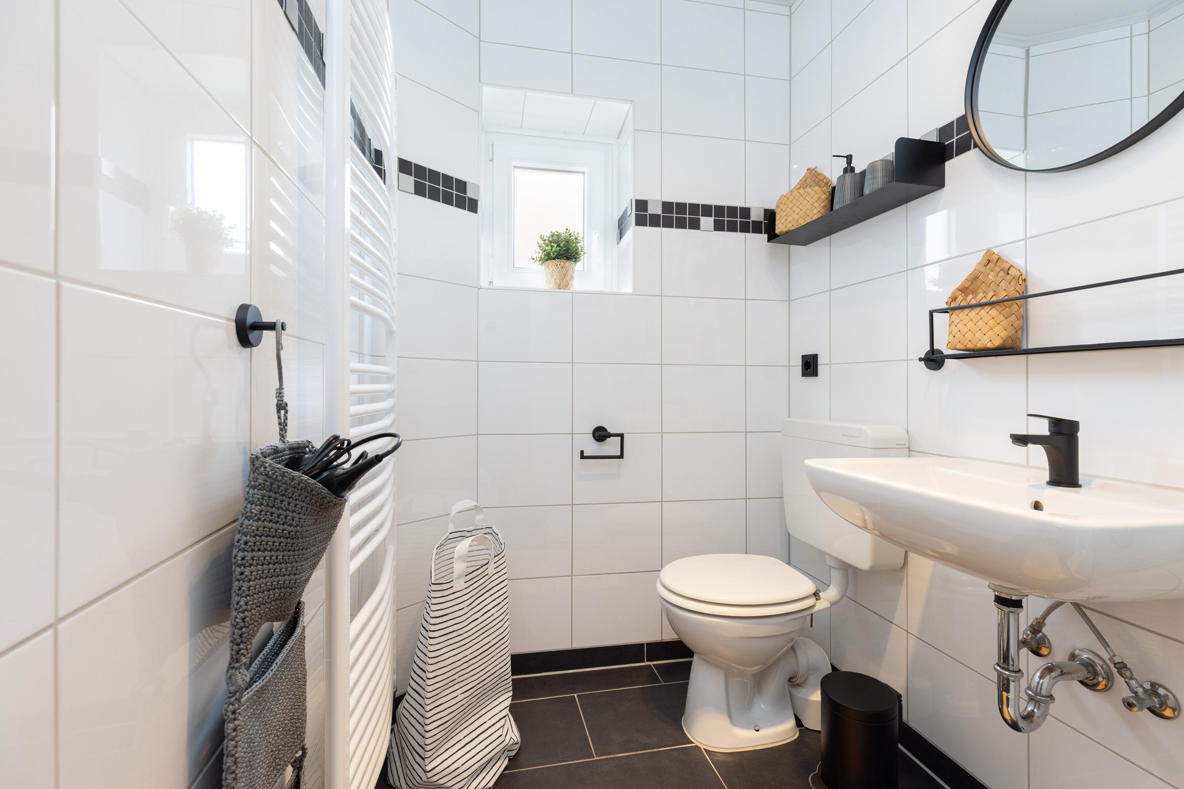 Das Duschbad mit modernen Design-Armaturen in Schwarz befindet sich am Ende des Flures zwischen den beiden Schlafräumen.