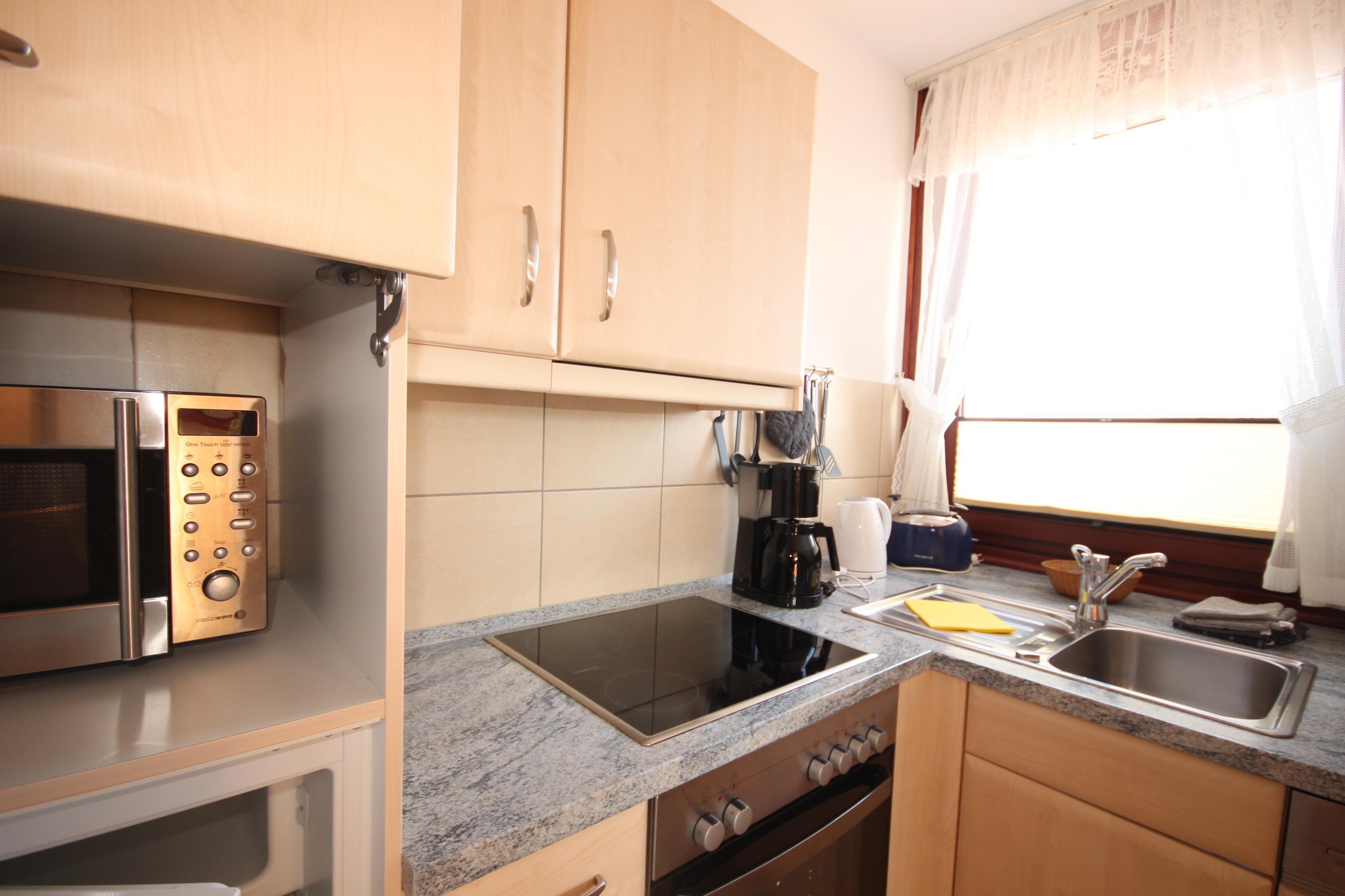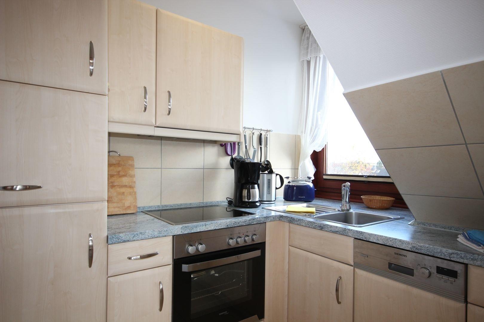 Die Küche ist mit einem Cerankochfeld, Backofen, Kühlschrank mit Gefrierfach, Geschirrspüler sowie den üblichen Küchengeräten sehr gut ausgestattet.