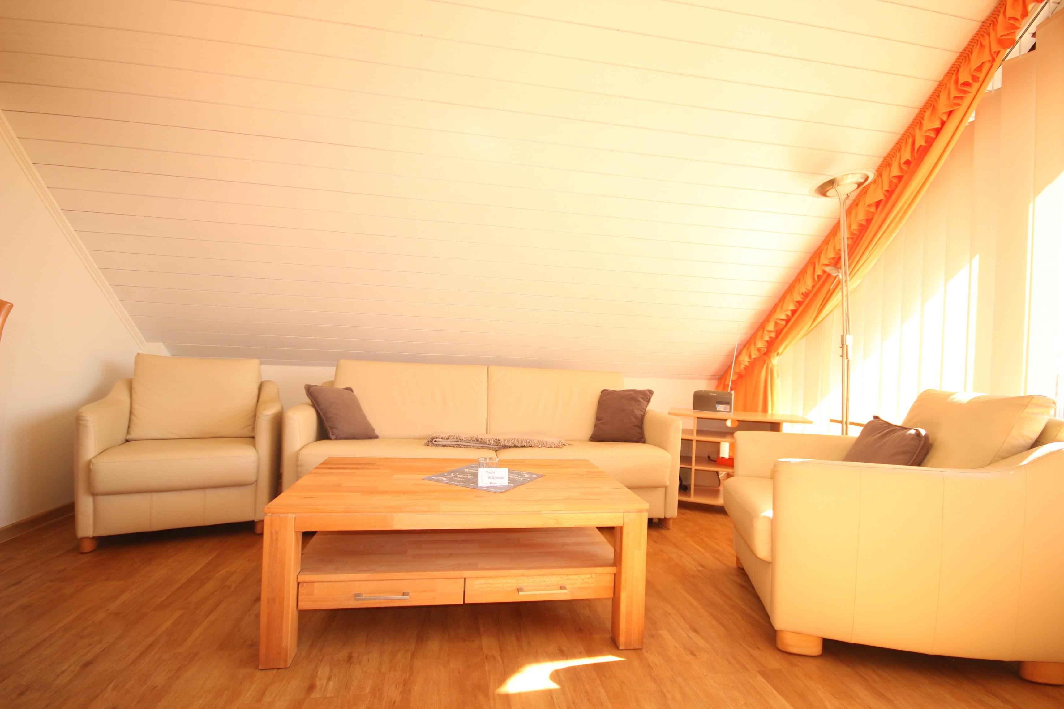 Das geschmackvolle Wohn-/Esszimmer verfügt über eine gemütliche Couch, TV, CD-Radio, Essplatz & Zugang zum Süd-West-Balkon mit Markise.