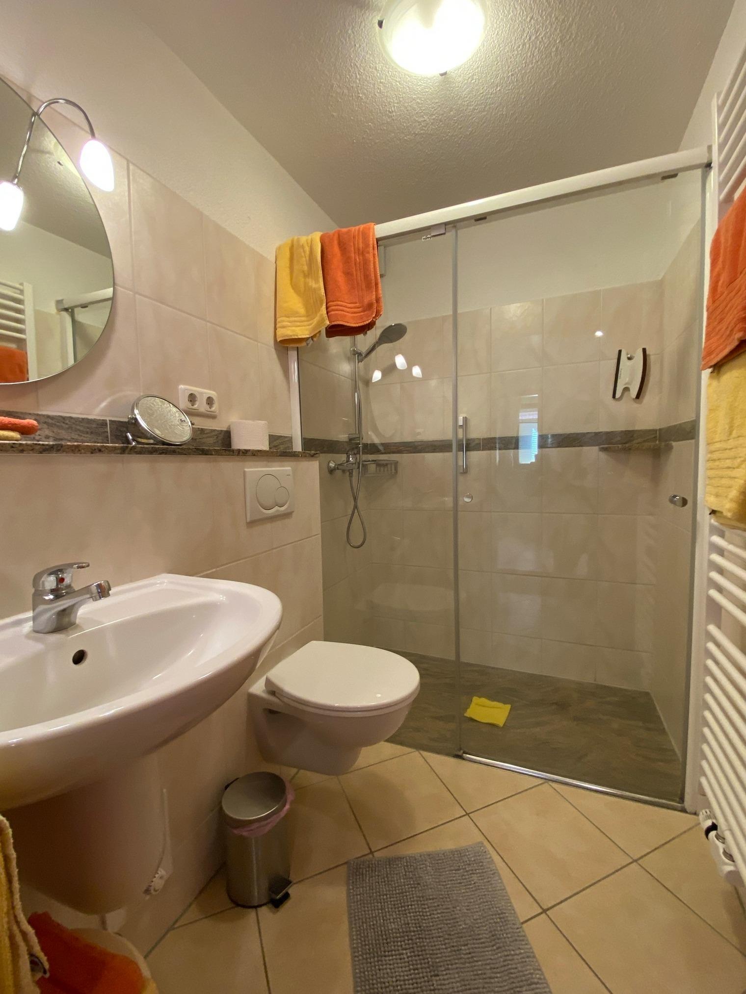 Im hell gefliesten Bad ist eine begehbare Dusche mit Glasschiebetür, Waschbecken und WC.