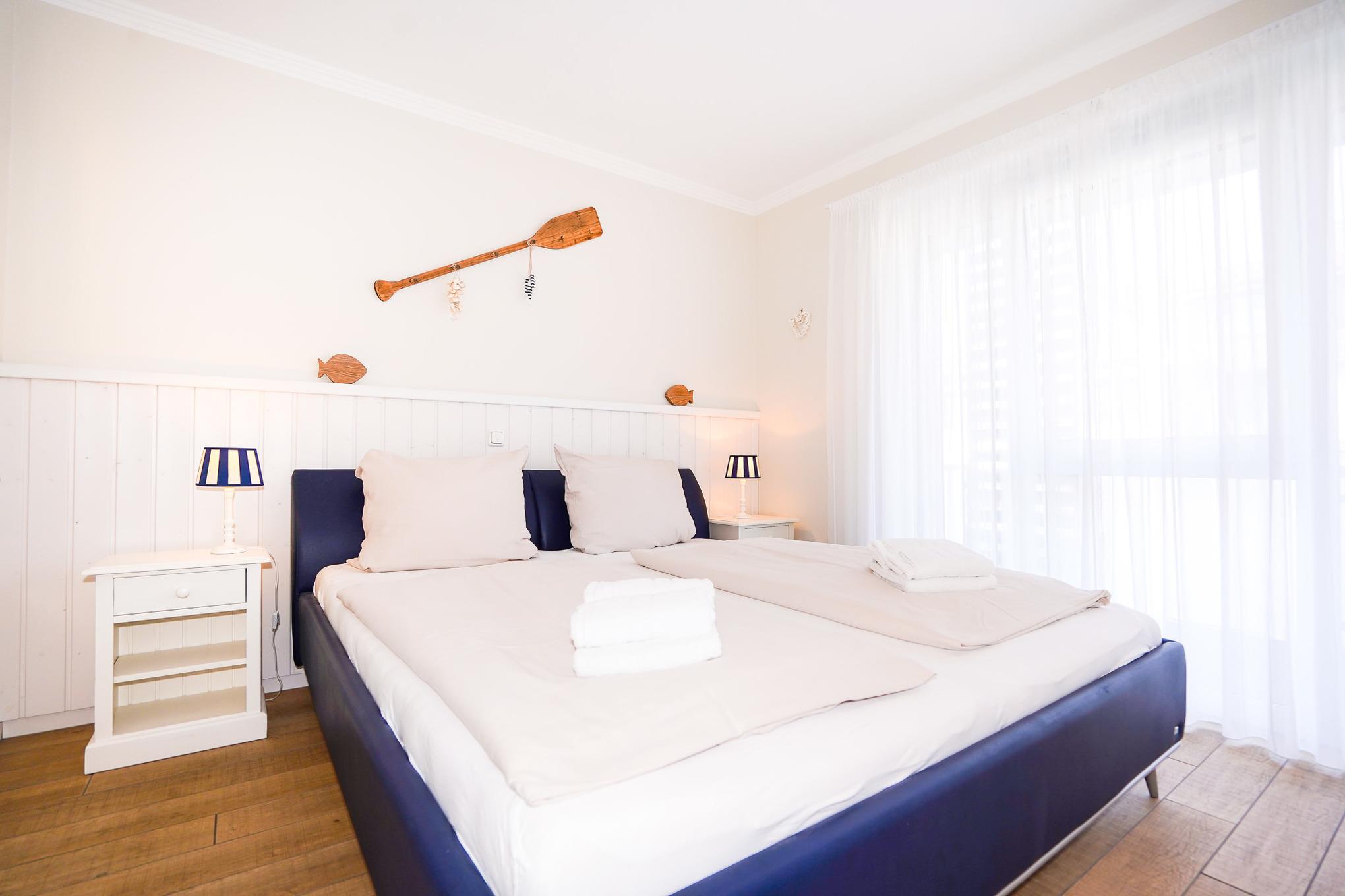 Die ca. 56 qm große Ferienwohnung besteht aus einem Wohnbereich mit Essecke und angrenzender Küche, einem Schlafzimmer und einem modernen Duschbad. Vom Wohnzimmer gelangen Sie auf den großen, möblierten Balkon mit Markise. Alle Fenster lassen sich bequem durch elektrische Jalousien verdunkeln.