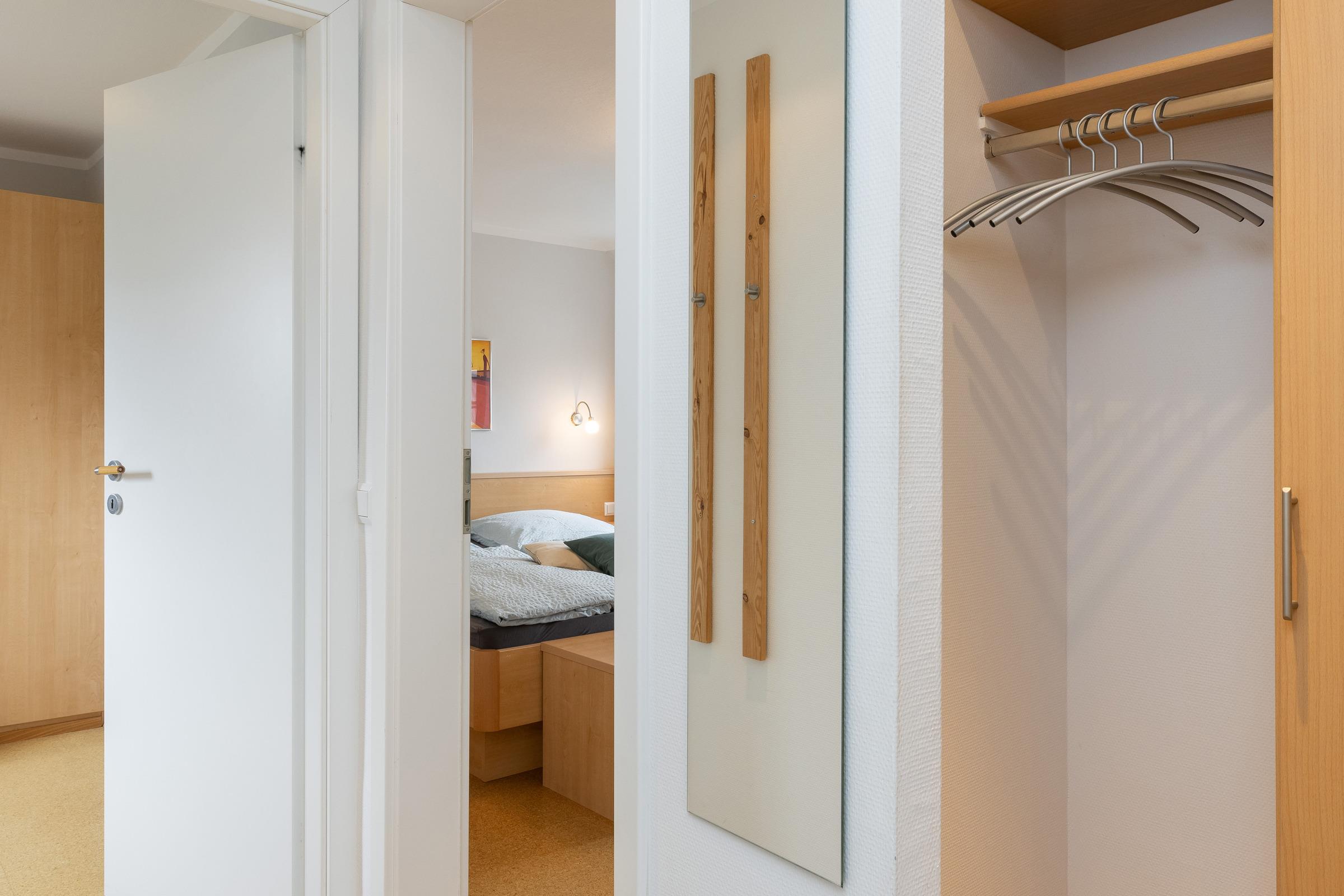 Das kleinere Schlafzimmer ist mit Einzelbett (90 x 200 cm) ohne Fußteil und Kleiderschrank sowie Stuhl und Ablagemöglichkeiten ausgestattet. Die Fußböden sind ausgelegt mit Kork – allergikerfreundlich.