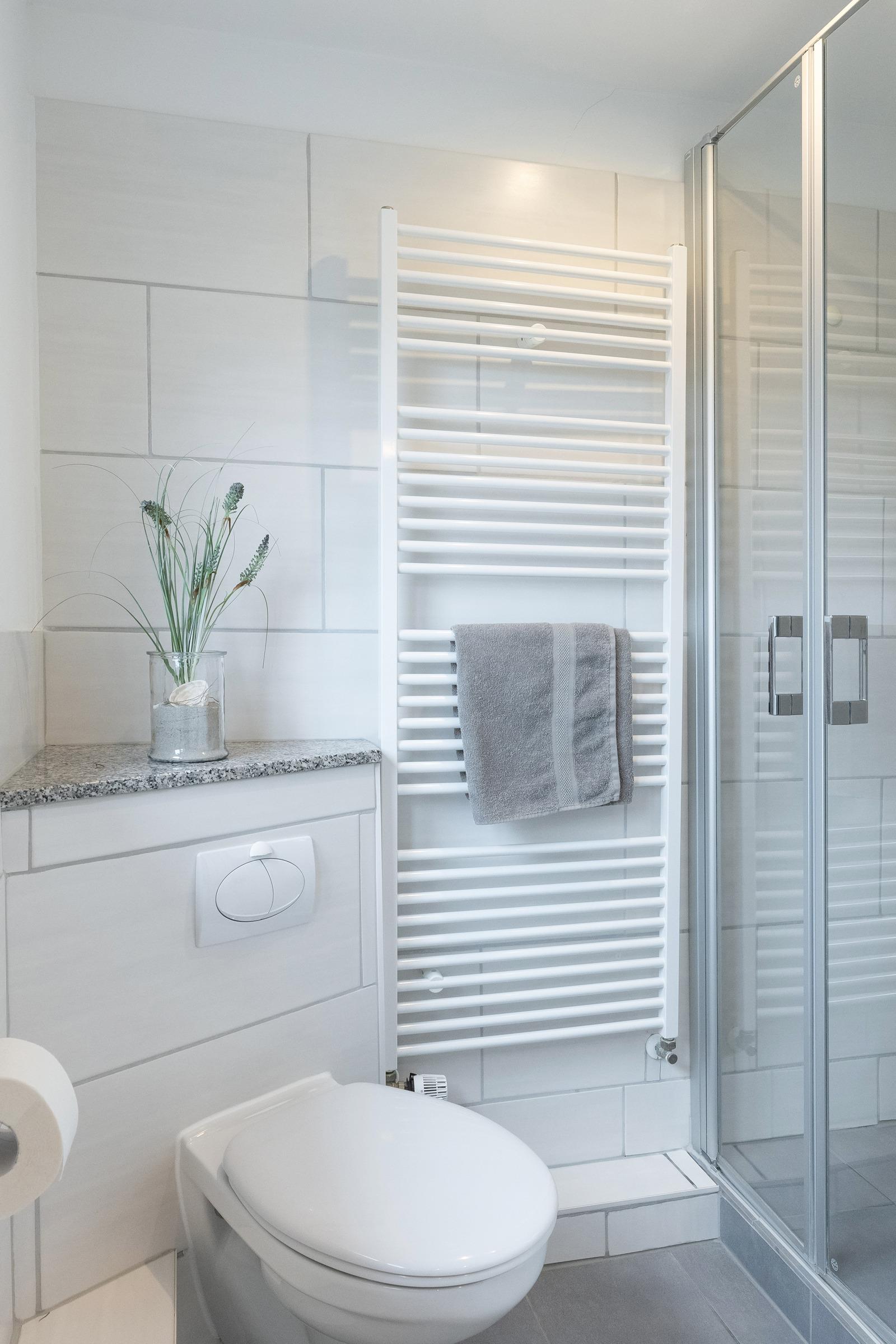Das renovierte Bad hat eine große Bodendusche und ist ansprechend modern gestaltet.