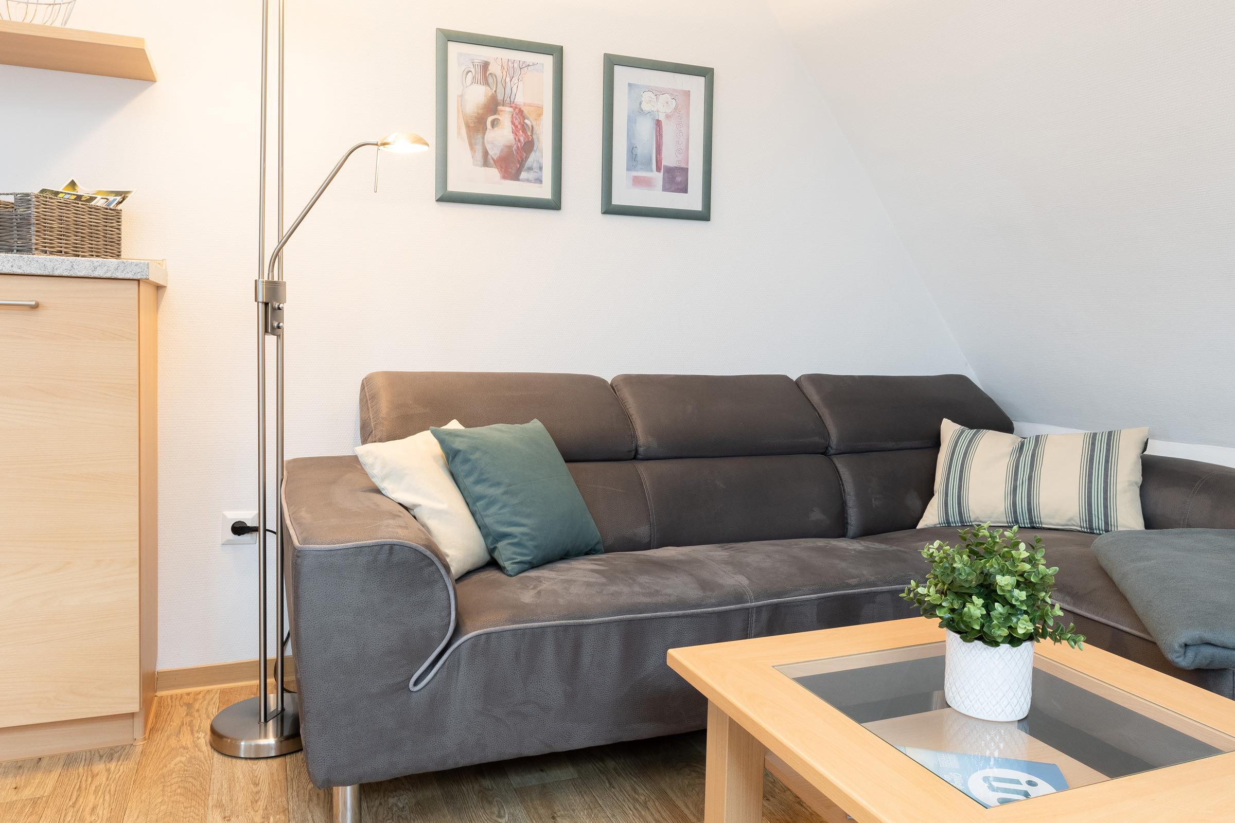 Vom hellen Wohnraum – ausgelegt mit Design-Fußboden in Holzoptik – hast du Zugang zur Dachterrasse, auf der du von morgens bis abends die Ostsee-Sonne im eigenen Strandkorb genießen kannst. Die Winkel-Couch lädt zum Relaxen ein und der Flachbildschirm mit DVD-Player sorgt für Unterhaltung, wenn das Wetter nicht mitspielt oder der Tag zu Ende geht.