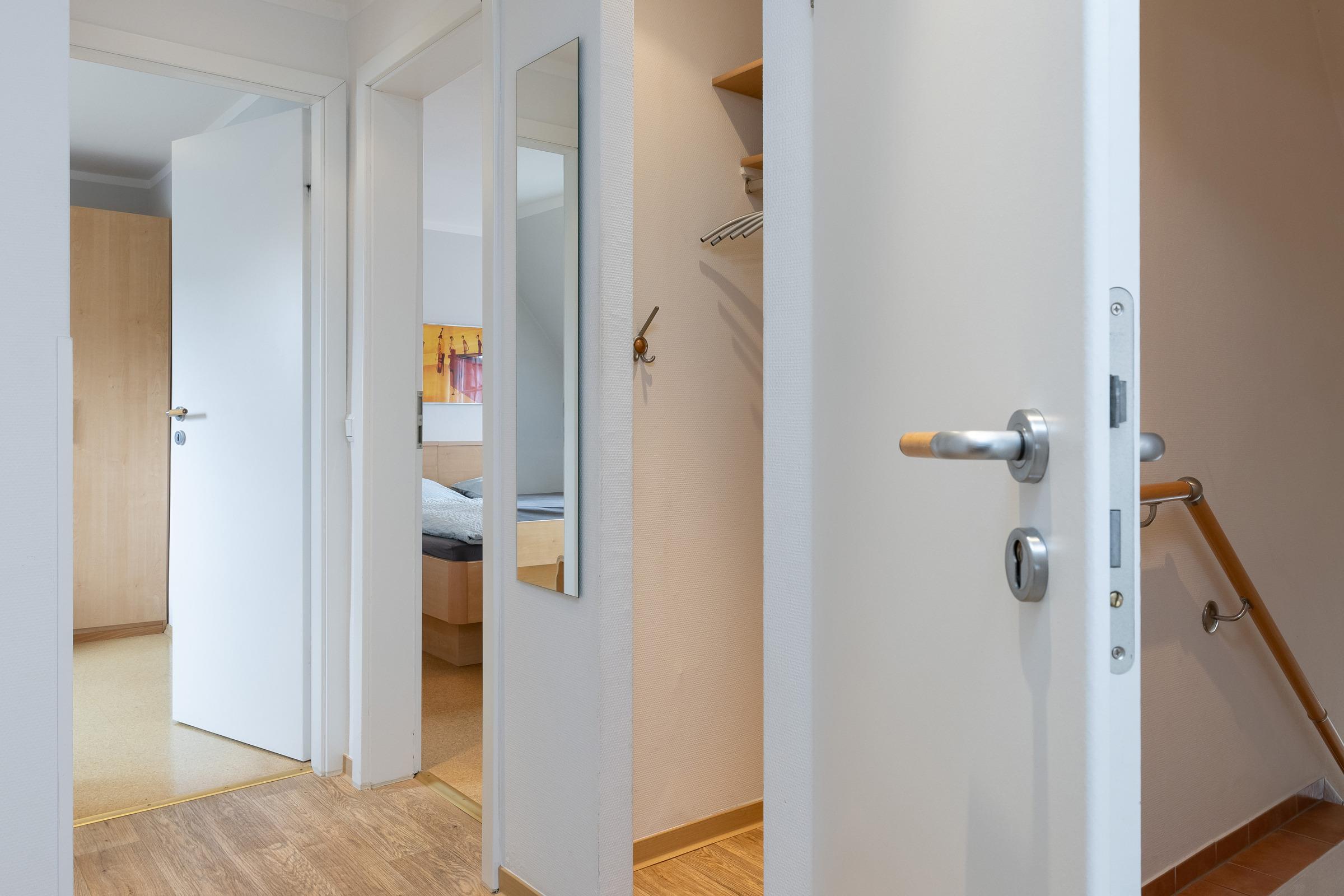 Die 3-Zimmer-Wohnung (55 qm) in der ersten Etage mit 16 qm Dachterrasse erlaubt sogar einen kleinen Blick über den Deich auf die Ostsee. Mit den 2 Schlafräumen ideal für die kleine Familie oder auch 2 Erwachsene, die getrennte Schlafmöglichkeiten suchen – bis zu 3 Personen fühlen sich hier gleichermaßen wohl.