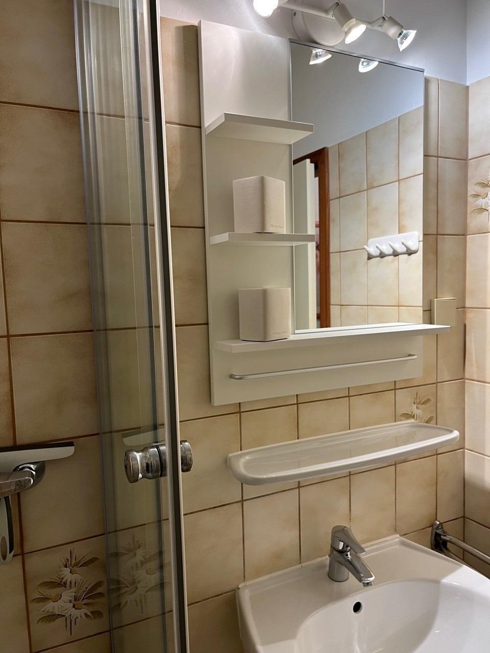 Ein innenliegendes Bad mit Dusch-Kabine, WC und Waschbecken ist vorhanden.