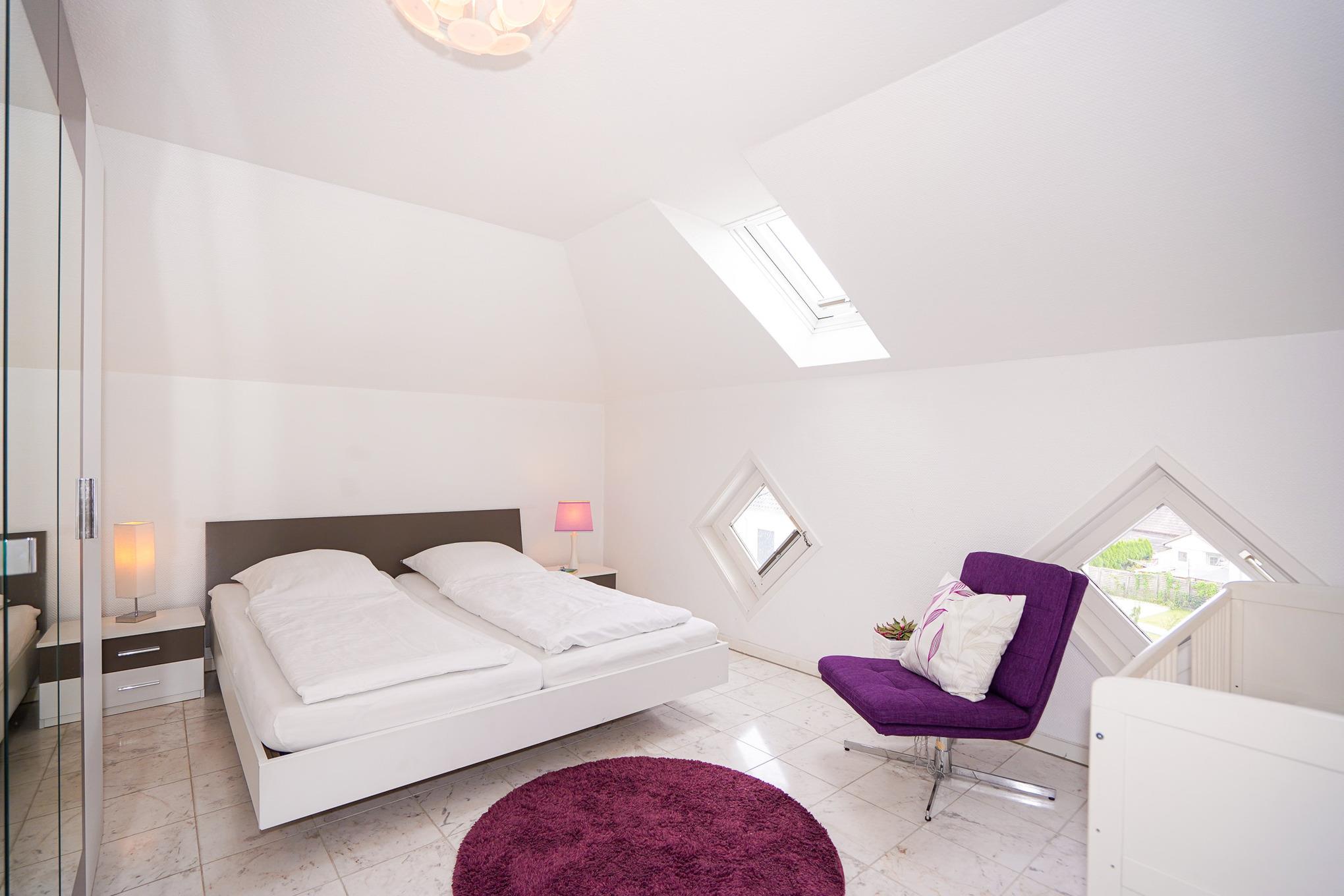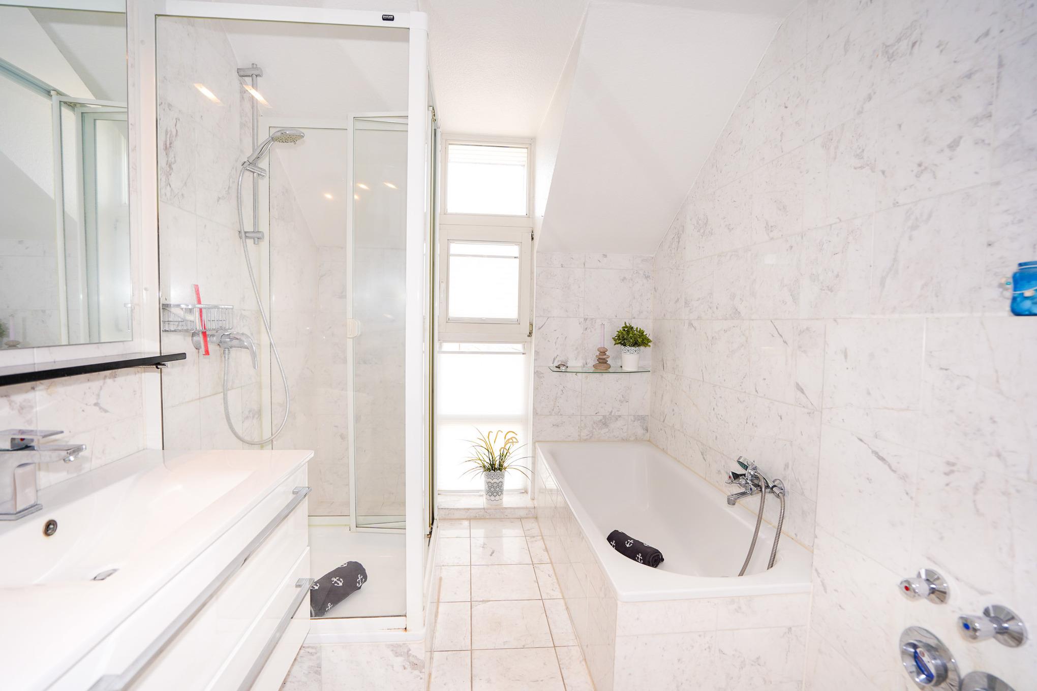 Beide Schlafzimmer verfügen über große Doppelbetten, Kleiderschränke und jeweils einen Sessel. In einem Schlafzimmer ist zusätzlich ein weiterer Fernseher vorhanden. Das in Marmor gehaltene Badezimmer ist mit einer Dusche und einer Badewanne ausgestattet. Zusätzlich ist ein Gäste-WC vorhanden.