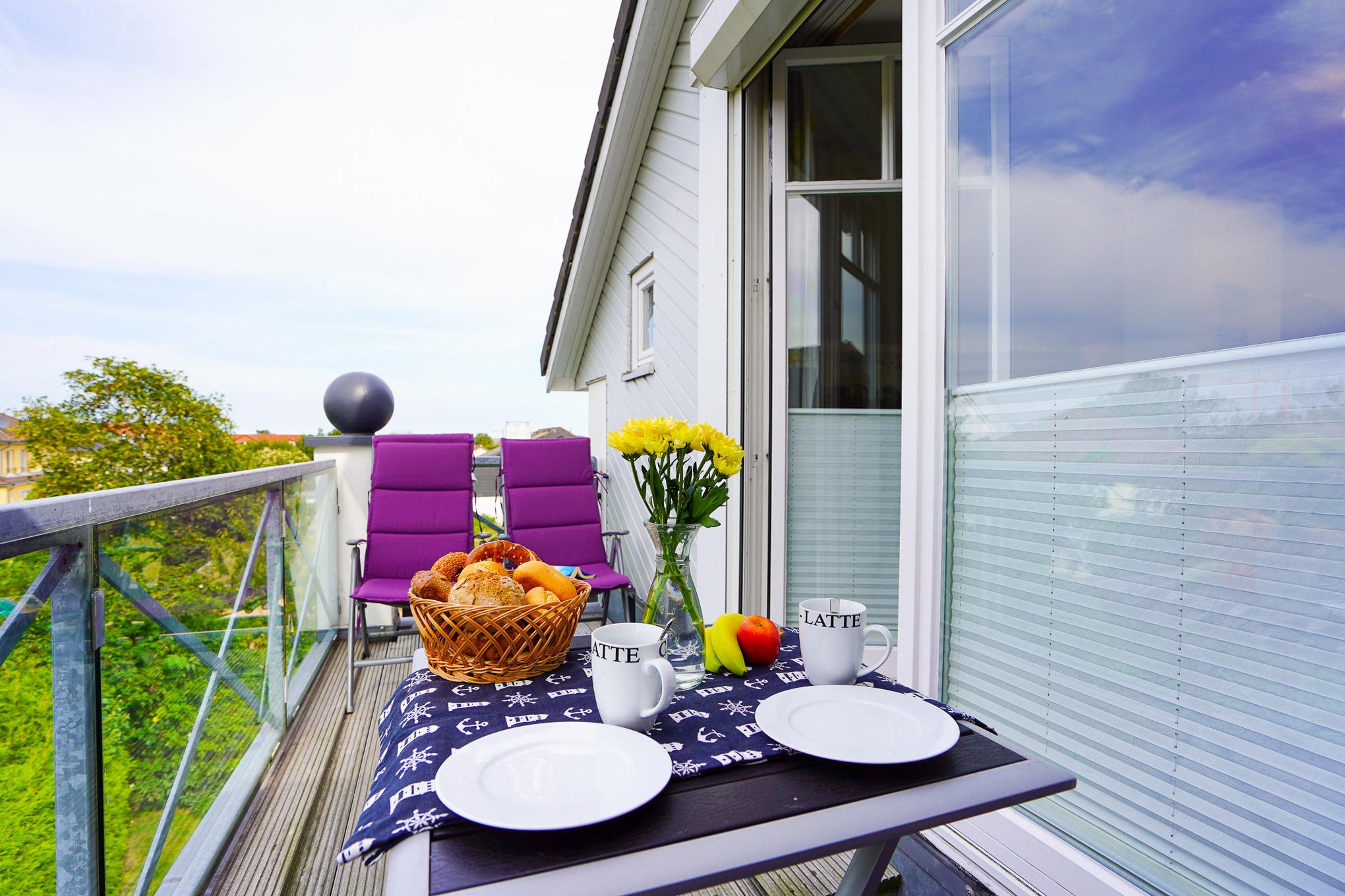 Das Wohnzimmer ist mit einem Ecksofa, einem Beistelltisch und einem großen Esstisch ausgestattet. Zur Unterhaltung stehen im Wohnbereich ein Flachbild TV und eine Musikanlage mit CD/Blu-Ray zur Verfügung. Angrenzend erreichen Sie den mit einem Strandkorb, Tisch und Stühlen möblierten Balkon in Süd-West Ausrichtung.
