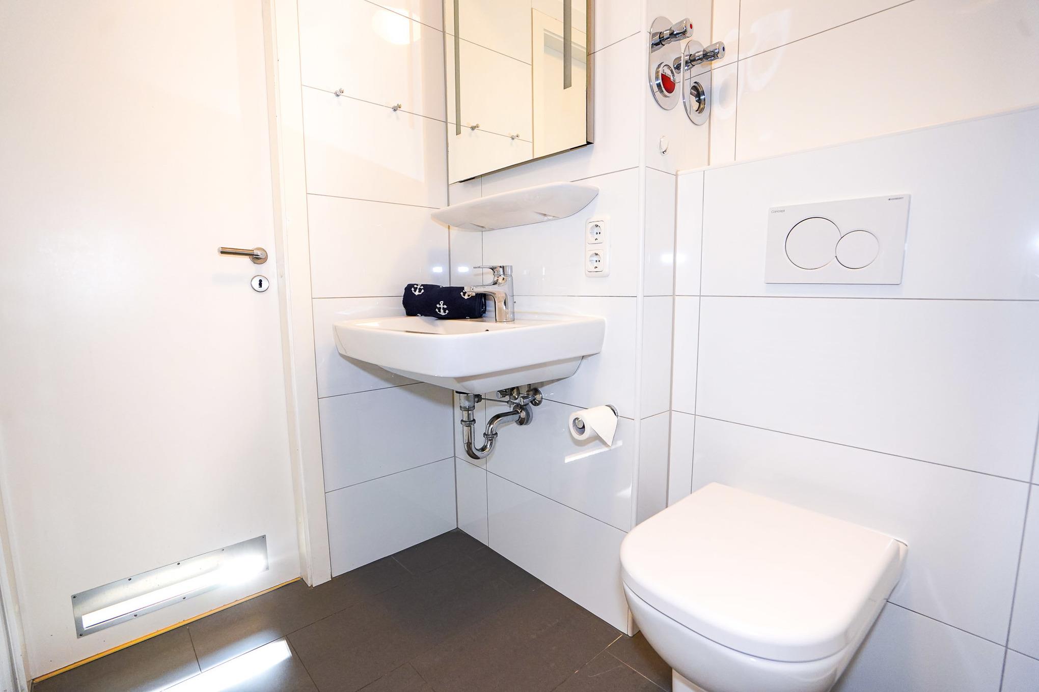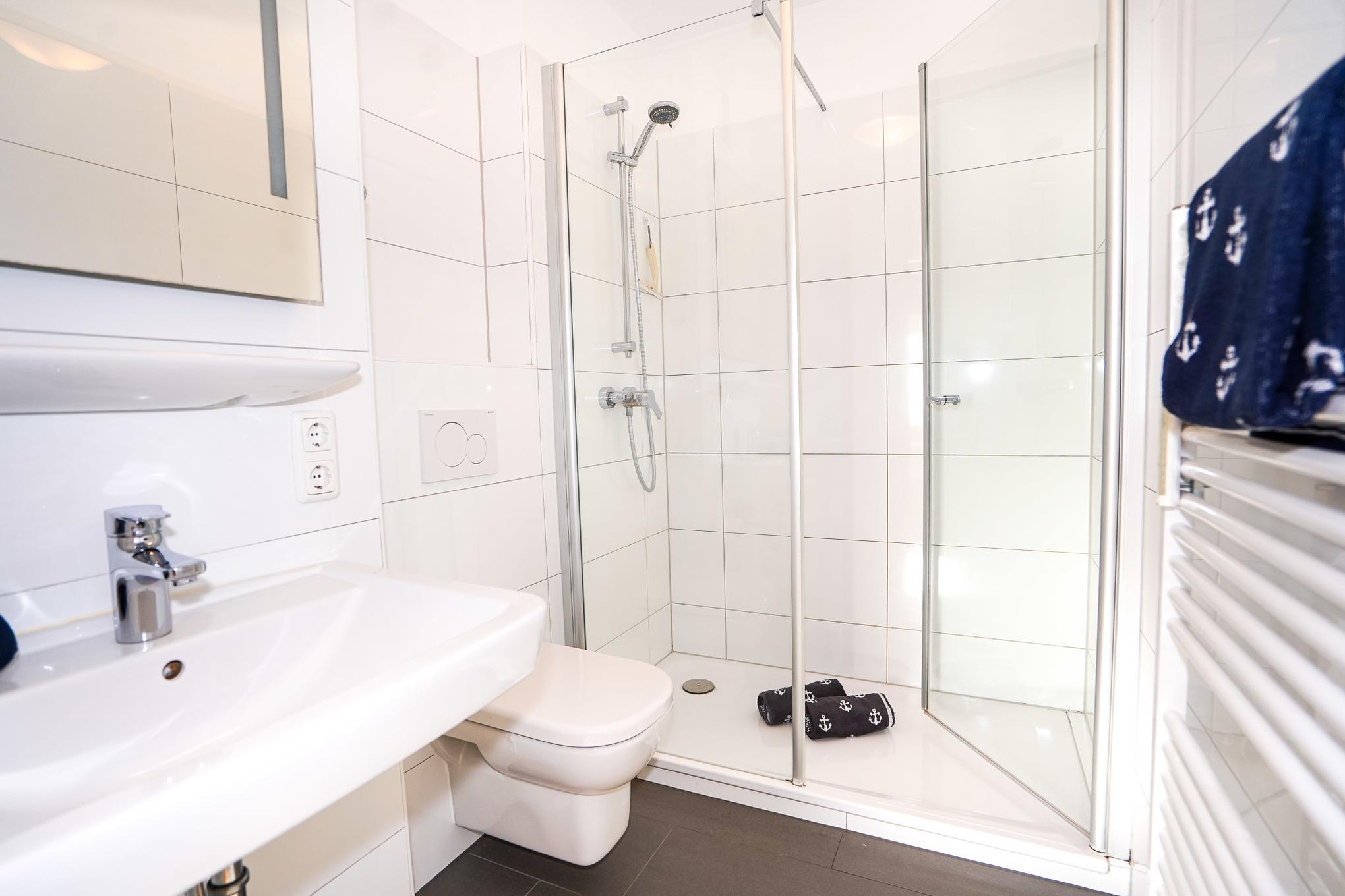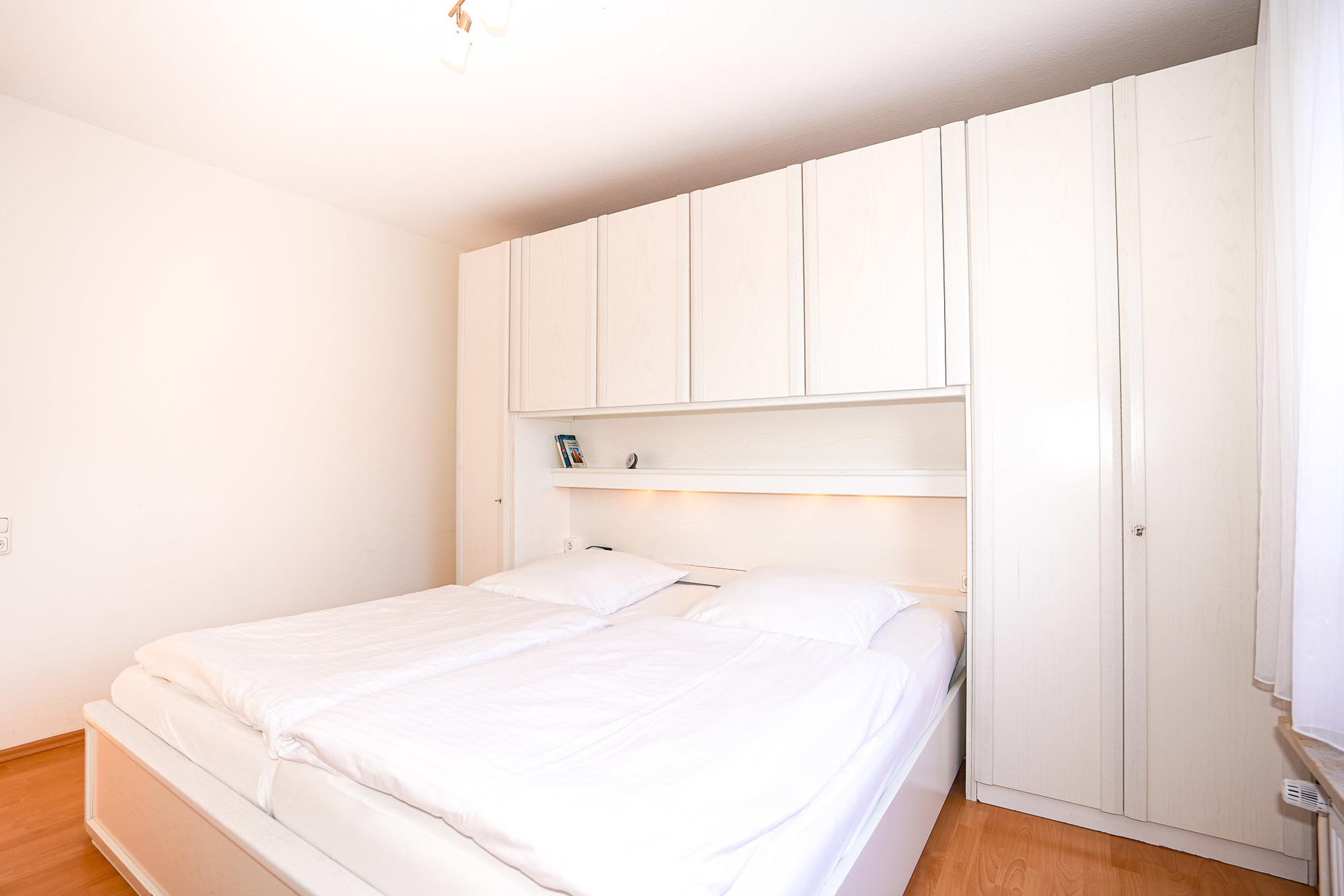 Das Schlafzimmer überzeugt durch ein großes Doppelbett (200 x 200) und einen Kleiderschrank. Im Badezimmer finden Sie eine ebenerdige Dusche, Waschbecken, WC und Handtuchheizkörper vor.