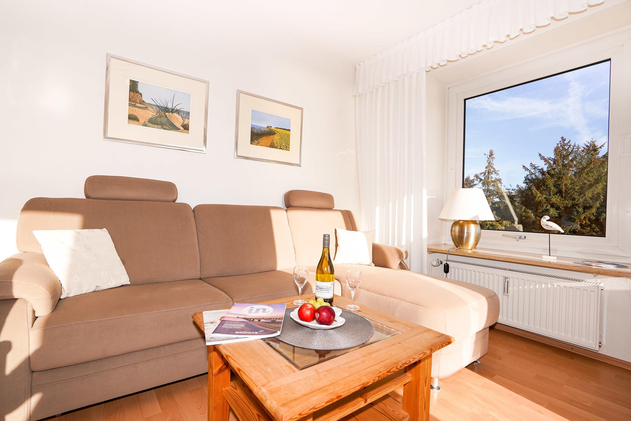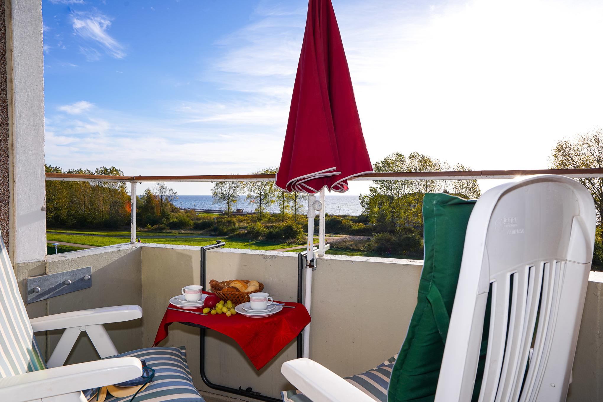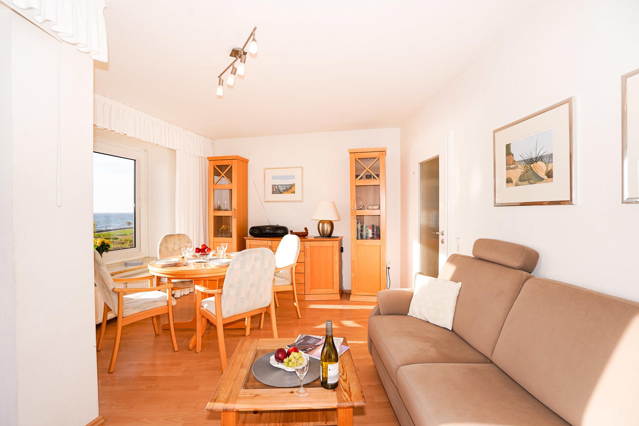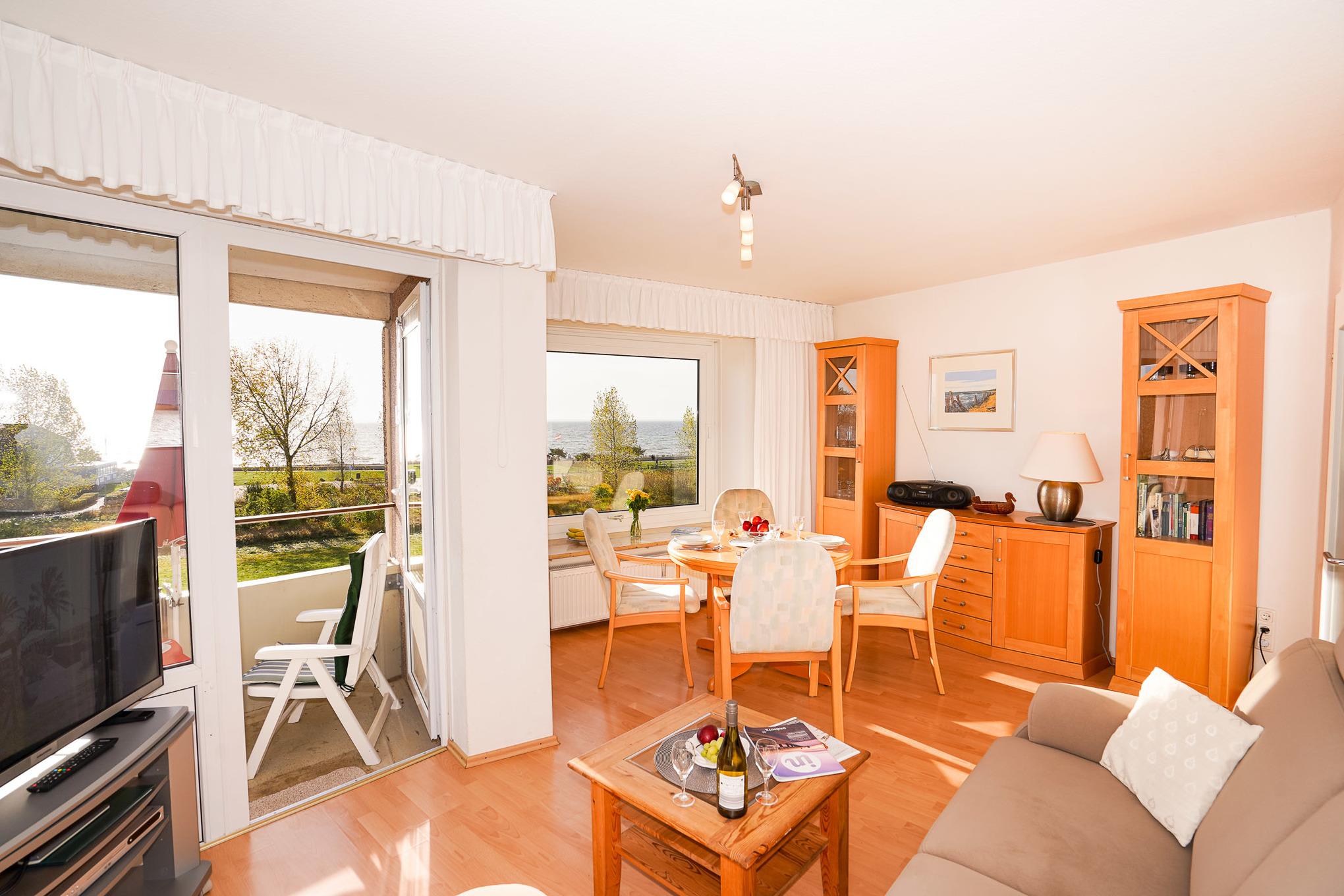 Das gemütlich eingerichtete Wohnzimmer verfügt über eine Schlafcouch für zwei Personen, eine Schrankwand und einen großen SAT-Flat-TV, der zu entspannten Abenden einlädt. Von Ihrem Esstisch mit vier Stühlen blicken Sie bereits beim Frühstück auf die Ostsee. Erholen Sie sich nach einem aufregenden Urlaubstag auf dem eigenen Balkon, mit direktem Ostseeblick.