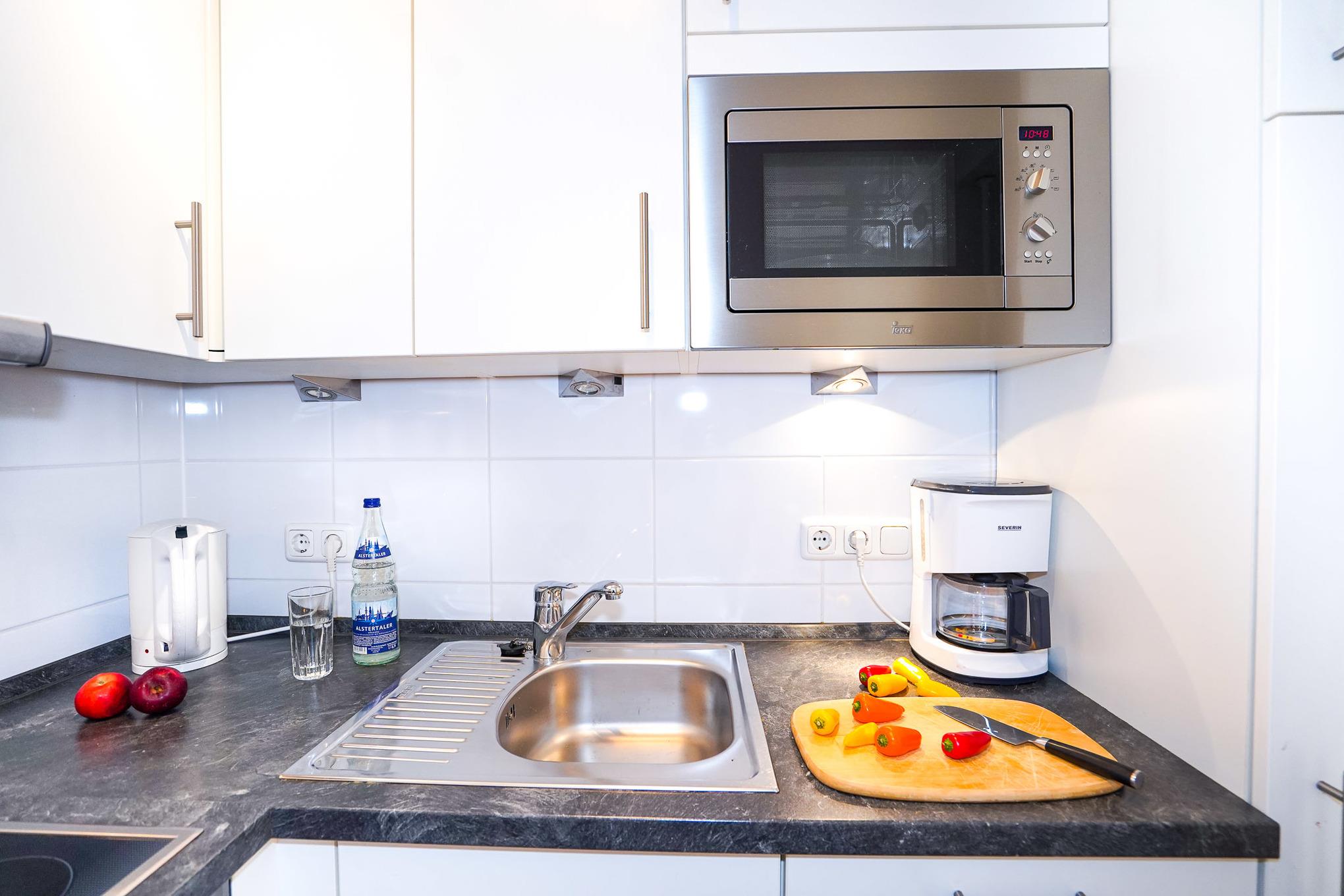 Die separate Küche ist voll ausgestattet und bietet unter anderem ein 4 Plattenkochfeld, Backofen, Spülmaschine, Kühlschrank mit Gefrierfach, Mikrowelle und weitere kleine Küchenhelfer wie Kaffeemaschine, Wasserkocher und Toaster.
