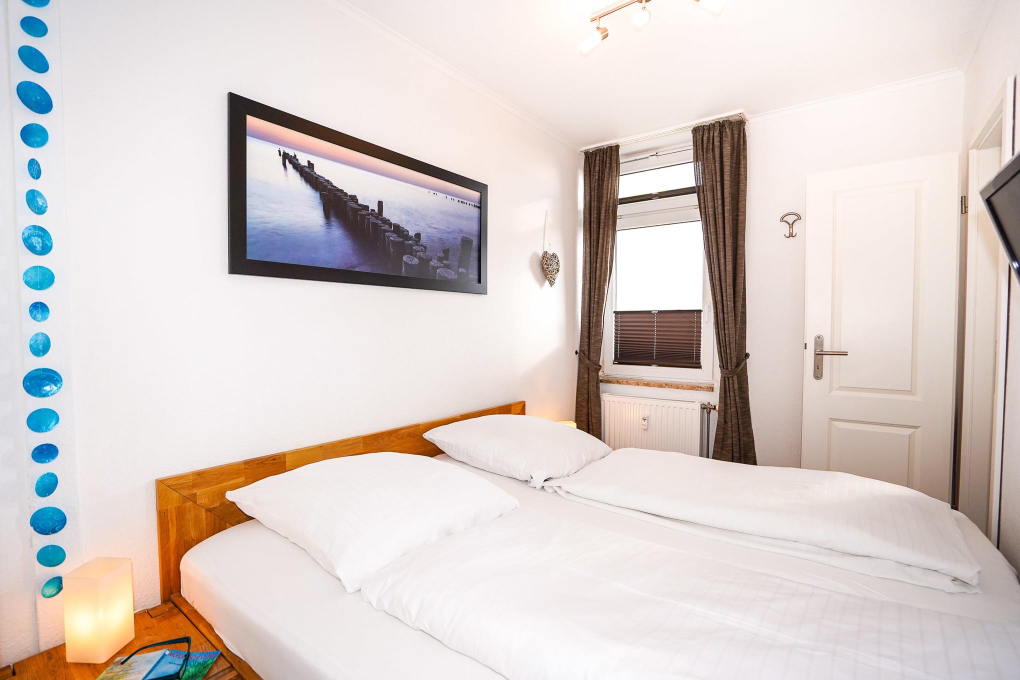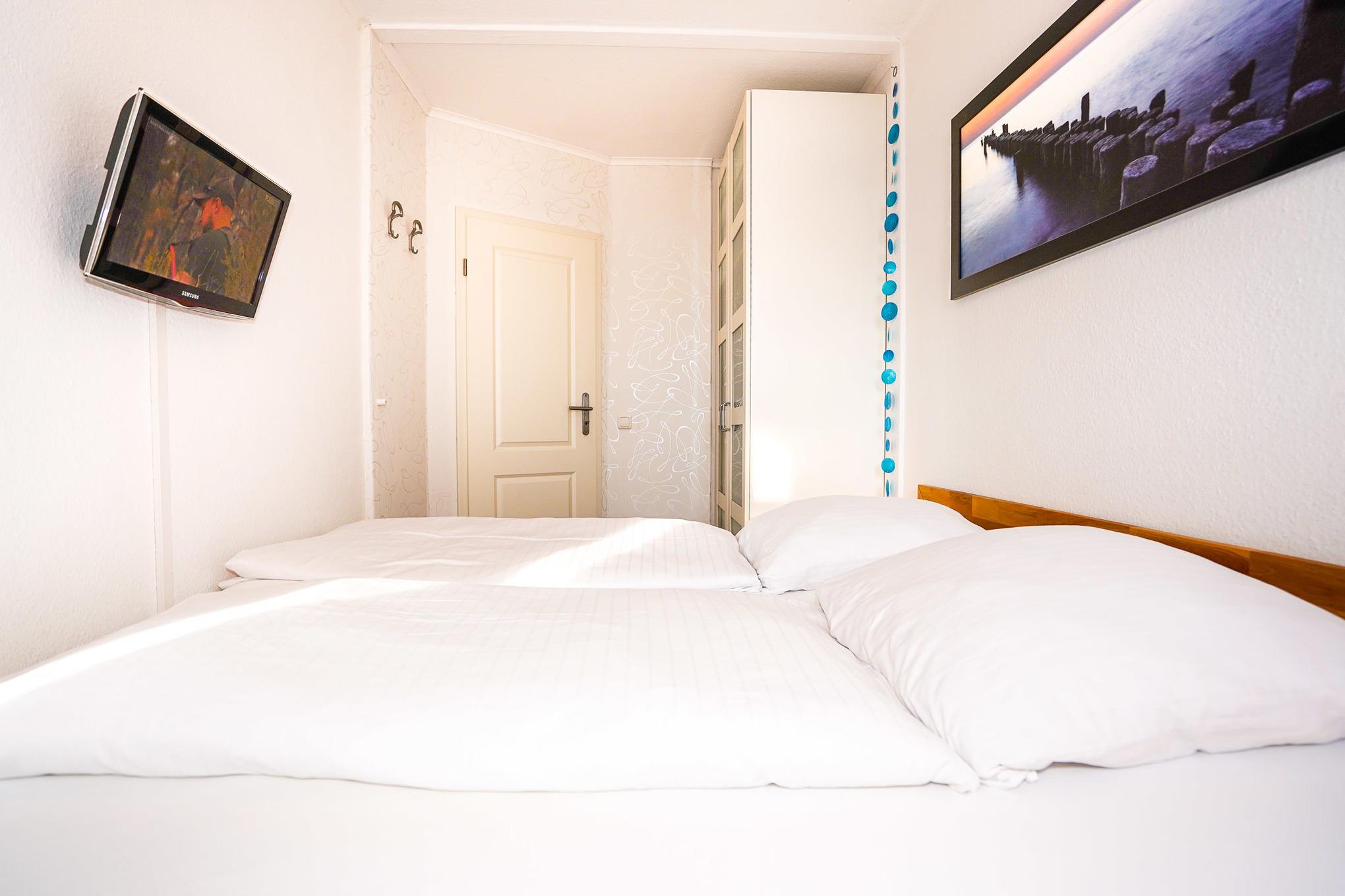 Im separaten Schlafzimmer befinden sich ein Doppelbett (180x200), ein Kleiderschrank und ein weiterer Fernseher. Zwei Türen sorgen für den optimalen Zugang zu beiden Seiten des Bettes.
