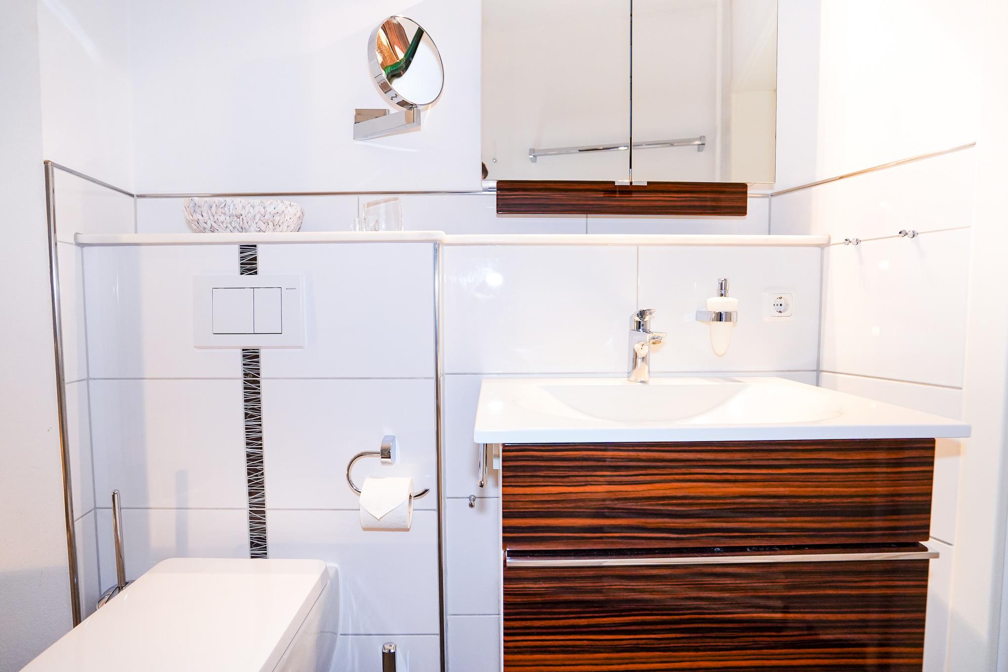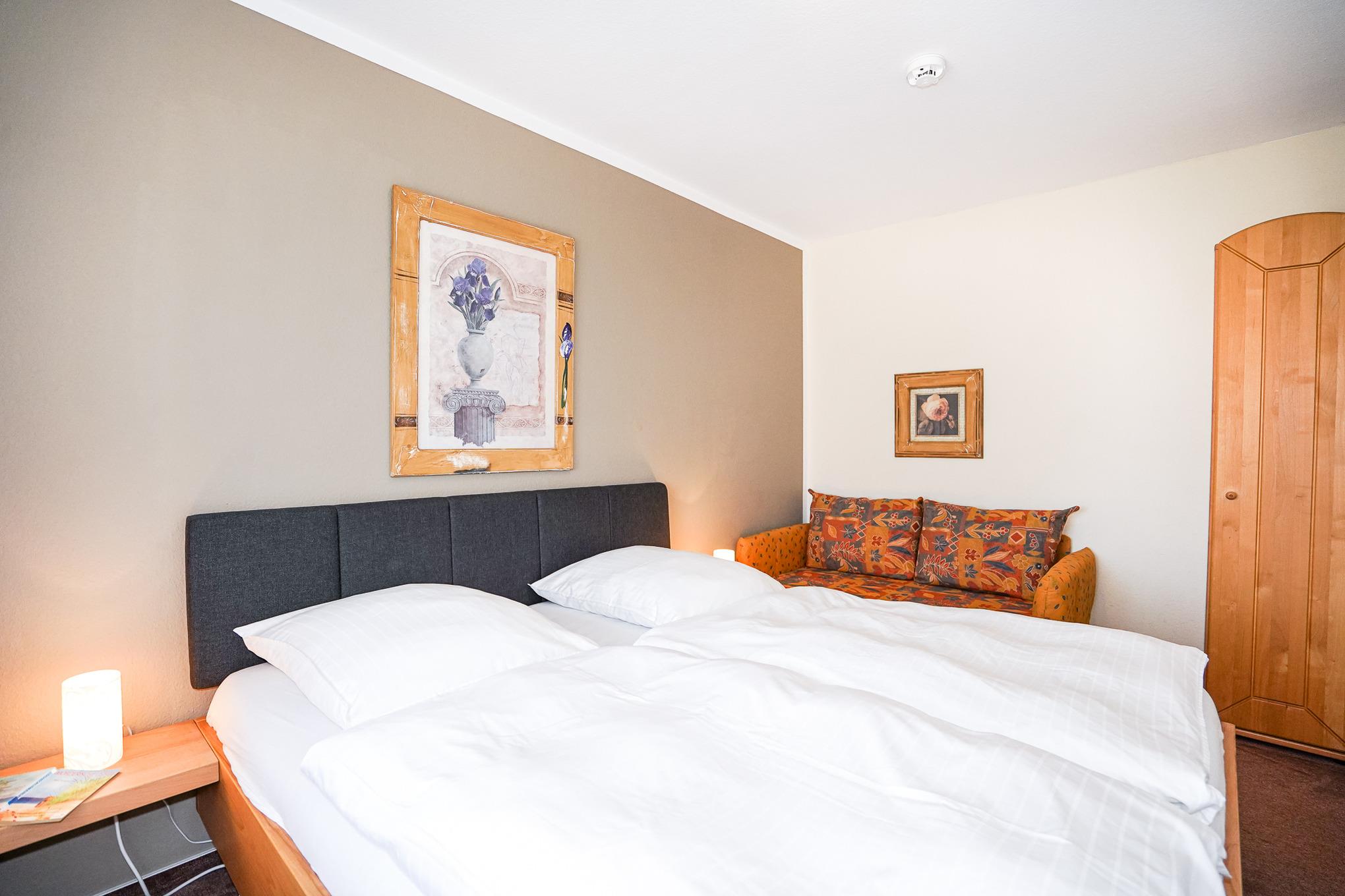 Im Schlafzimmer finden Sie ein großes und bequemes Doppelbett (180 x 200cm), einen Schrank und ein Schlafsofa (90 x 200cm) vor. Im Flur steht Ihnen ein weiterer großzügiger Schrank für Ihre Urlaubsgarderobe zur Verfügung. Das sehr hochwertige Badezimmer mit Dusche zeichnet sich durch sein angenehmes Lichtkonzept aus.