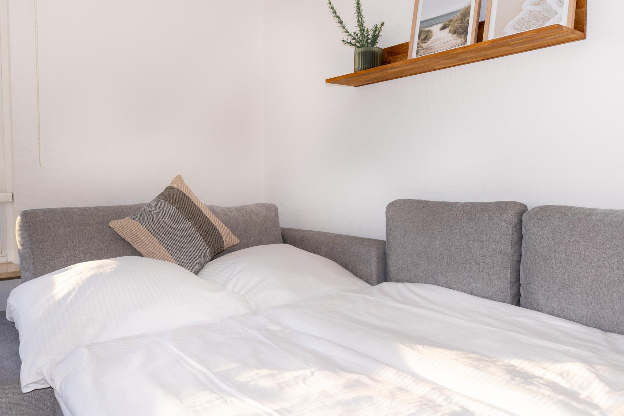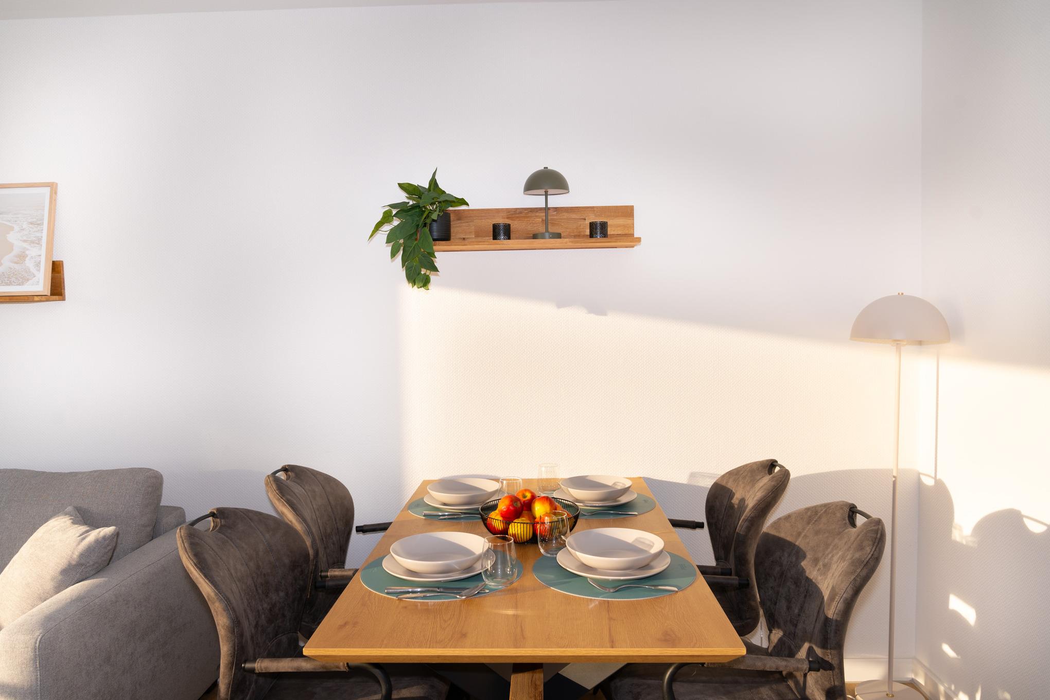 Das lichtdurchflutete Wohnzimmer wurde vollständig mit neuen Möbeln und einem neuen Fussboden ausgestattet. Es verfügt über eine große Eckschlafcouch, einen Esstisch für fünf Personen und einen großen Fernseher. Im ebenfalls neu möblierten Schlafzimmer finden Sie ein Doppelbett mit hochwertigen Matratzen (180 x 200cm), zwei Nachttische und einen Kleiderschrank vor. Weitere Ablagemöglichkeiten befinden sich in den geräumigen Wandschränken im Flur der Wohnung.
