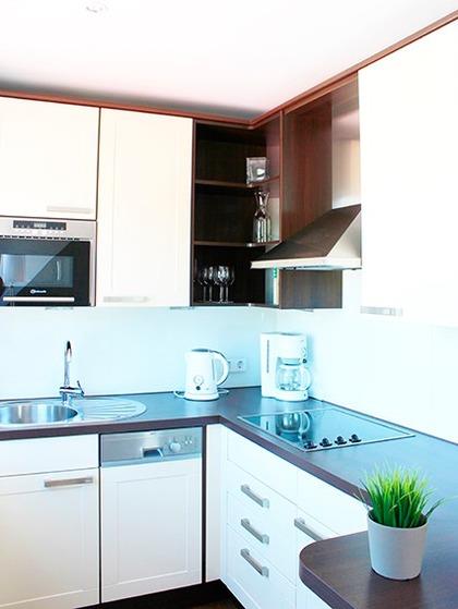 Der Flatscreen ist an einem Schwenkarm befestigt, sodass Sie vom Sofa aus TV schauen können oder von der Esstheke. Die Pantryküche ist voll ausgestattet und die Esstheke mit ihren Sitzgelegenheiten lassen den modernen Stil der Wohnung erkennen.