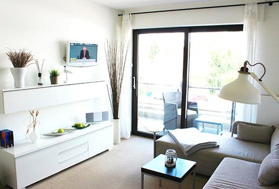 Der Flatscreen ist an einem Schwenkarm befestigt, sodass Sie vom Sofa aus TV schauen können oder von der Esstheke. Die voll ausgestattete Pantryküche und die Esstheke mit ihren Sitzgelegenheiten lassen den modernen Stil der Wohnung erkennen.