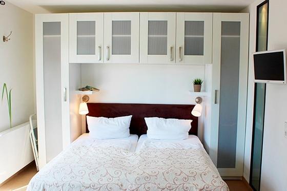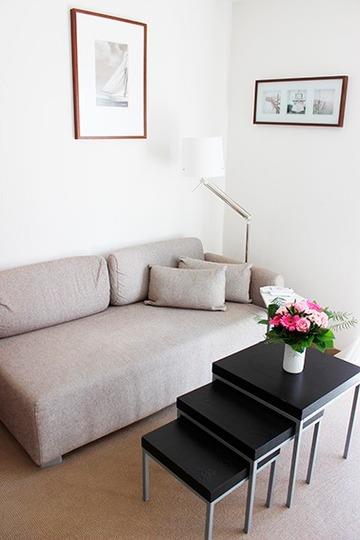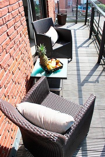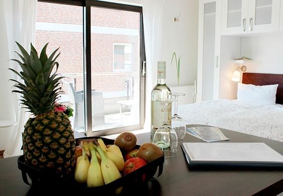 Ausstattung: ca. 25 m², Doppelbett, Bad mit Regenkopfdusche und WC, Balkon mit Sitzmöbeln, voll ausgestattete Pantryküche mit 2 Herdplatten, Esstheke mit Sitzgelegenheiten, kostenloses W-LAN, Flat-TV, Waschmaschinen- und Trocknernutzung (gegen Gebühr).
