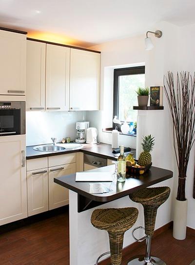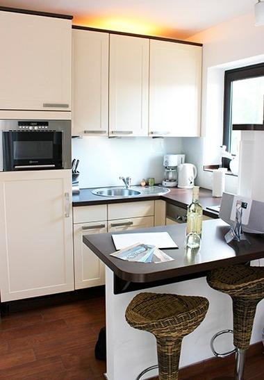Der Flatscreen ist an einem Schwenkarm befestigt, sodass Sie aus dem Bett oder vom Sofa aus TV schauen könne oder von der Esstheke. Die Pantryküche ist voll ausgestattet und die Esstheke mit ihren Sitzgelegenheiten lassen den modernen Stil der Wohnung erkennen.