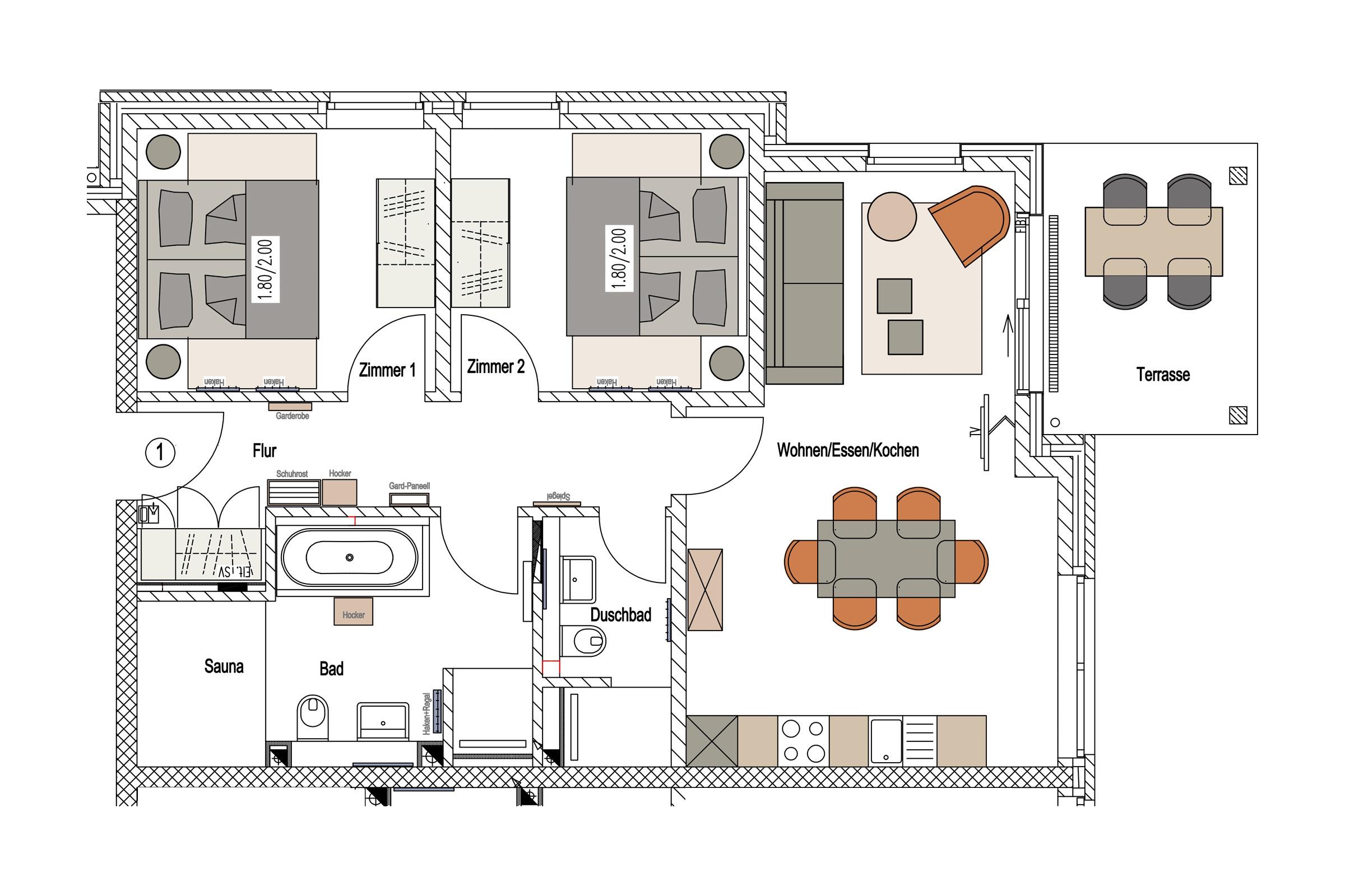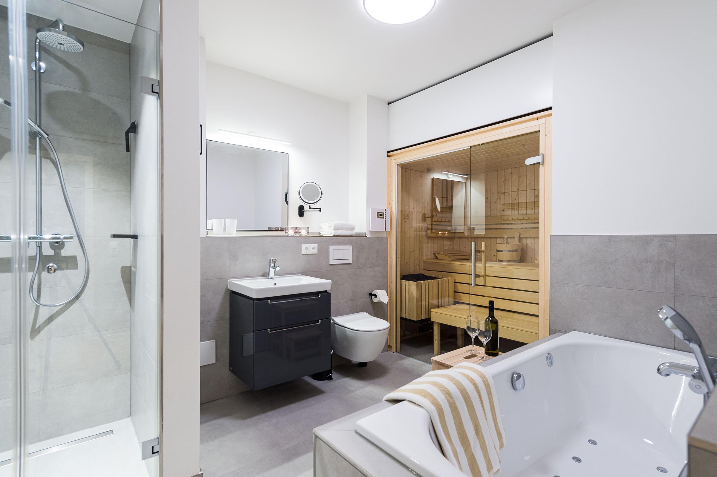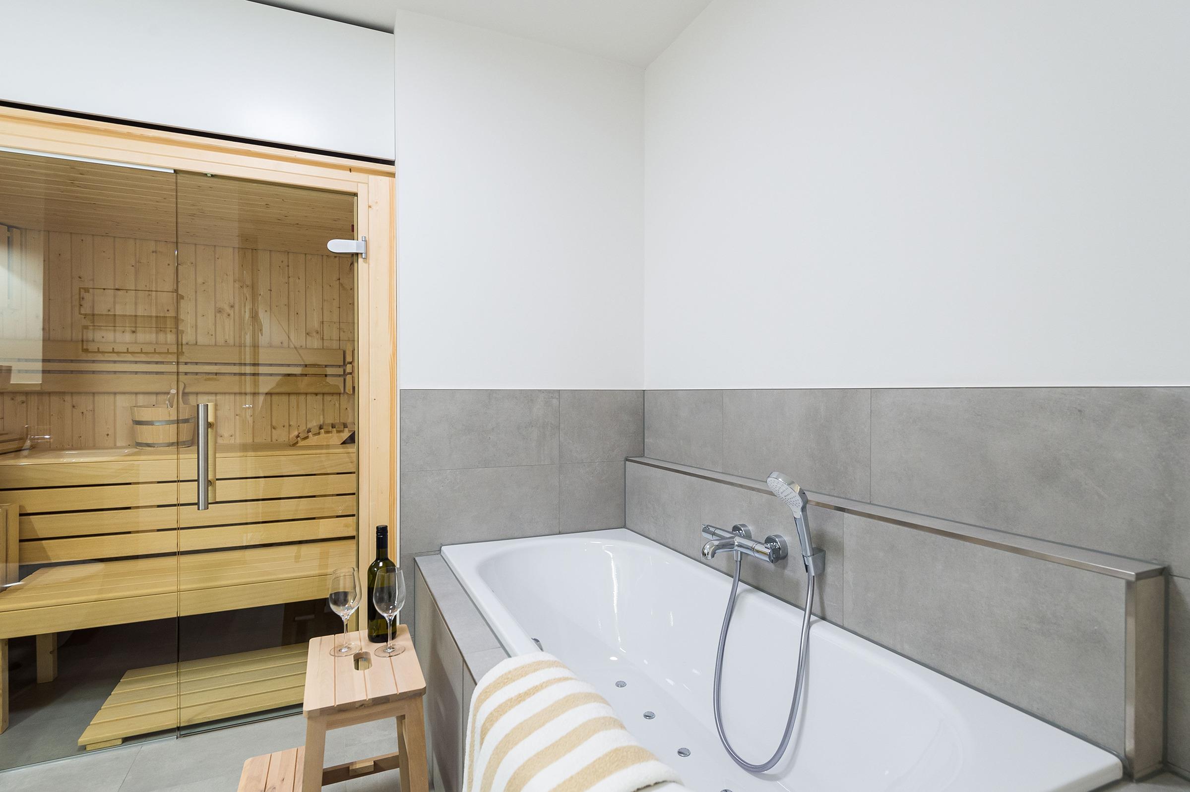 Sie ist für bis zu 4 Personen buchbar (2 Schlafzimmer mit Doppelbetten 180 x 200 cm) (der angegebene Preis bezieht sich immer auf 2 Erwachsene und 2 Kinder, extra Personen können ggf. auf Anfrage dazu gebucht werden) und verfügt über eine gehobene 5-Sterne-Ausstattung: 2 Badezimmer, 1 Sauna, 1 Whirlwanne sowie 1 Terrasse. Die Küche ist komplett ausgestattet und bietet einen großen Esstisch für bis zu 6 Personen. Zudem gibt es einen Geschirrspüler, einen Kühlschrank inkl. Gefrierfach, eine Mikrowelle sowie einen Waschtrockner. Im Wohnbereich erwartet Sie ein 50-Zoll-Smart-TV sowie der Zugang zur großzügigen Terrasse. Die Terrasse ist ebenfalls mit einem Esstisch ausgestattet. Selbstverständlich bieten wir schnelles und kostenfreies WLAN sowie einen PKW-Stellplatz direkt am Haus.