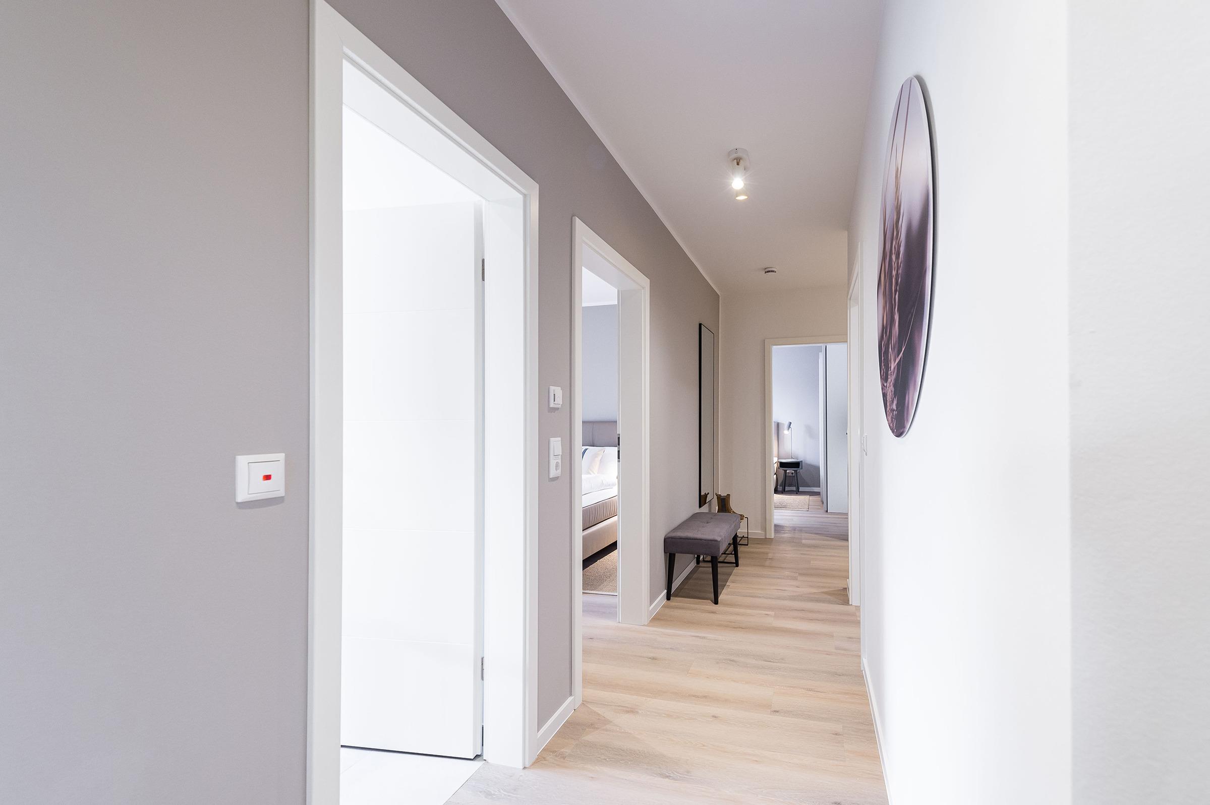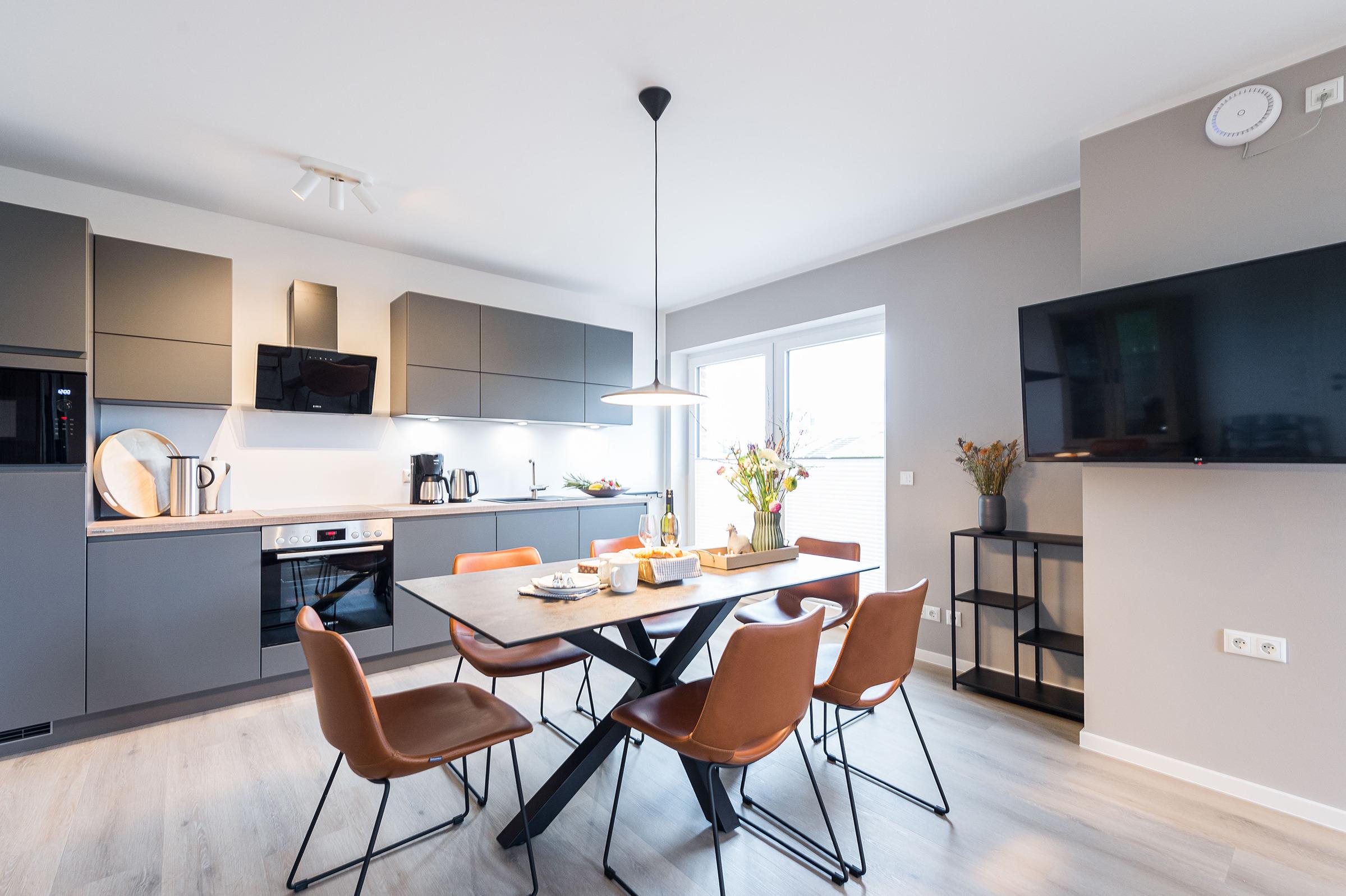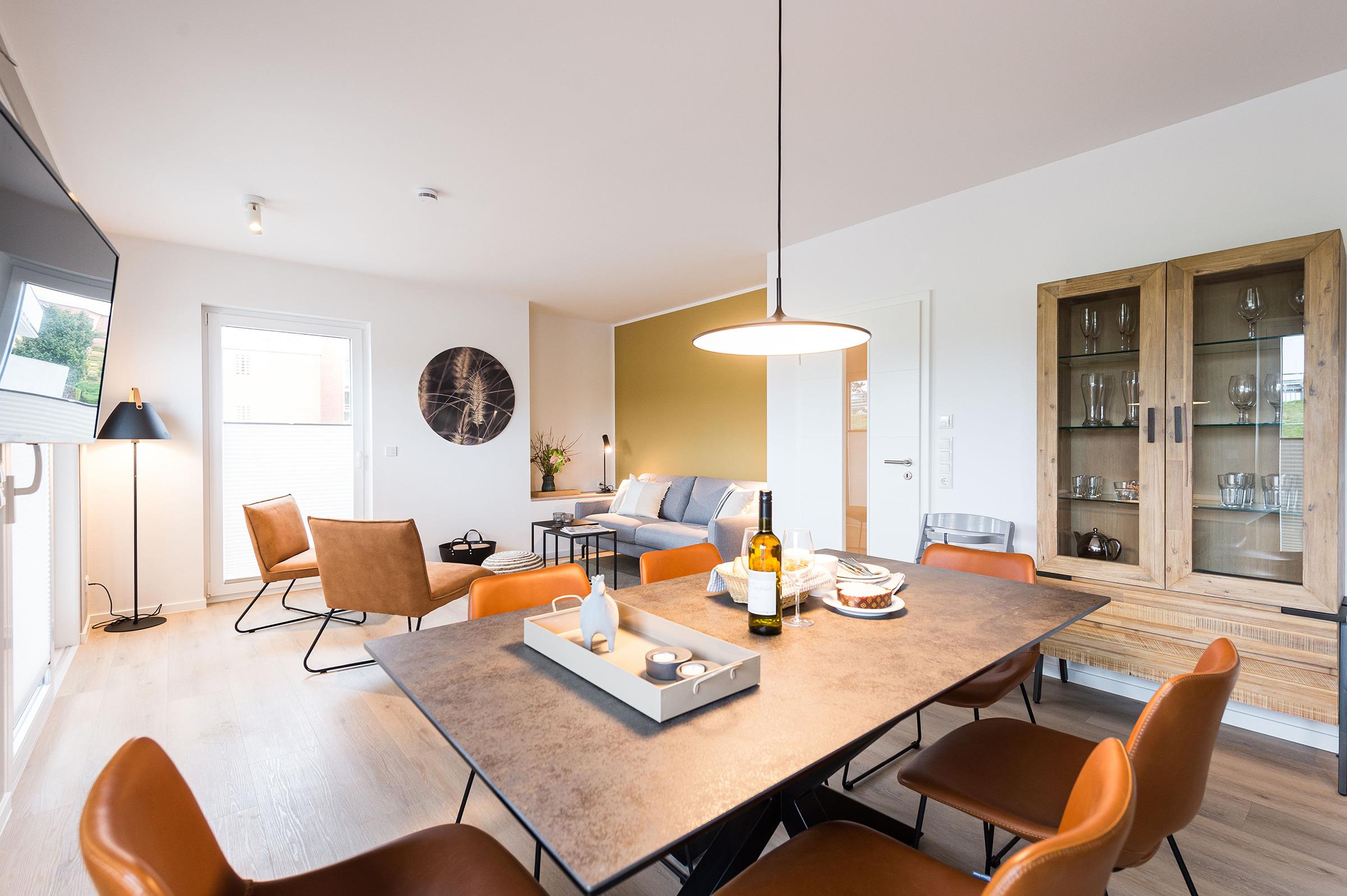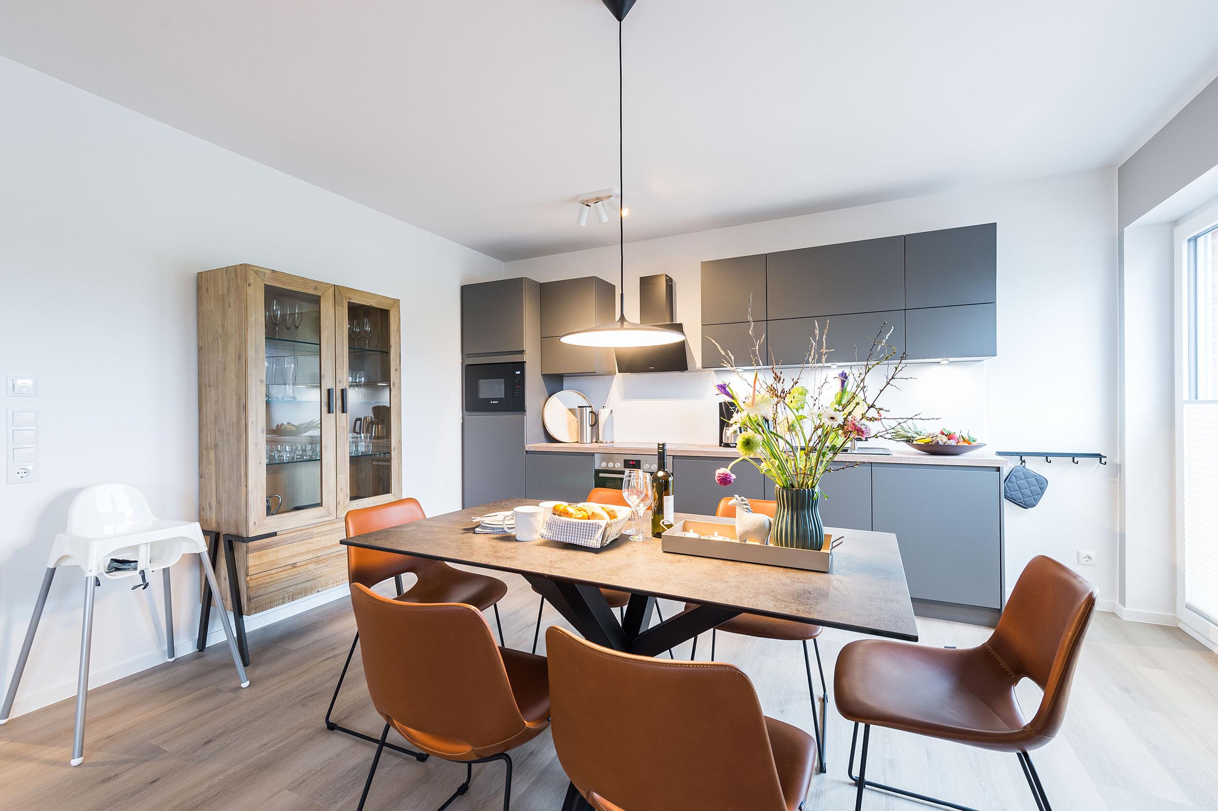 Sie ist für bis zu 4 Personen buchbar (2 Schlafzimmer mit Doppelbetten 180 x 200 cm) (der angegebene Preis bezieht sich immer auf 2 Erwachsene und 2 Kinder, extra Personen können ggf. auf Anfrage dazu gebucht werden) und verfügt über eine gehobene 5-Sterne-Ausstattung: 2 Badezimmer, 1 Sauna, 1 Whirlwanne sowie 1 Terrasse. Die Küche ist komplett ausgestattet und bietet einen großen Esstisch für bis zu 6 Personen. Zudem gibt es einen Geschirrspüler, einen Kühlschrank inkl. Gefrierfach, eine Mikrowelle sowie einen Waschtrockner. Im Wohnbereich erwartet Sie ein 50-Zoll-Smart-TV sowie der Zugang zur großzügigen Terrasse. Die Terrasse ist ebenfalls mit einem Esstisch ausgestattet. Selbstverständlich bieten wir schnelles und kostenfreies WLAN sowie einen PKW-Stellplatz direkt am Haus.