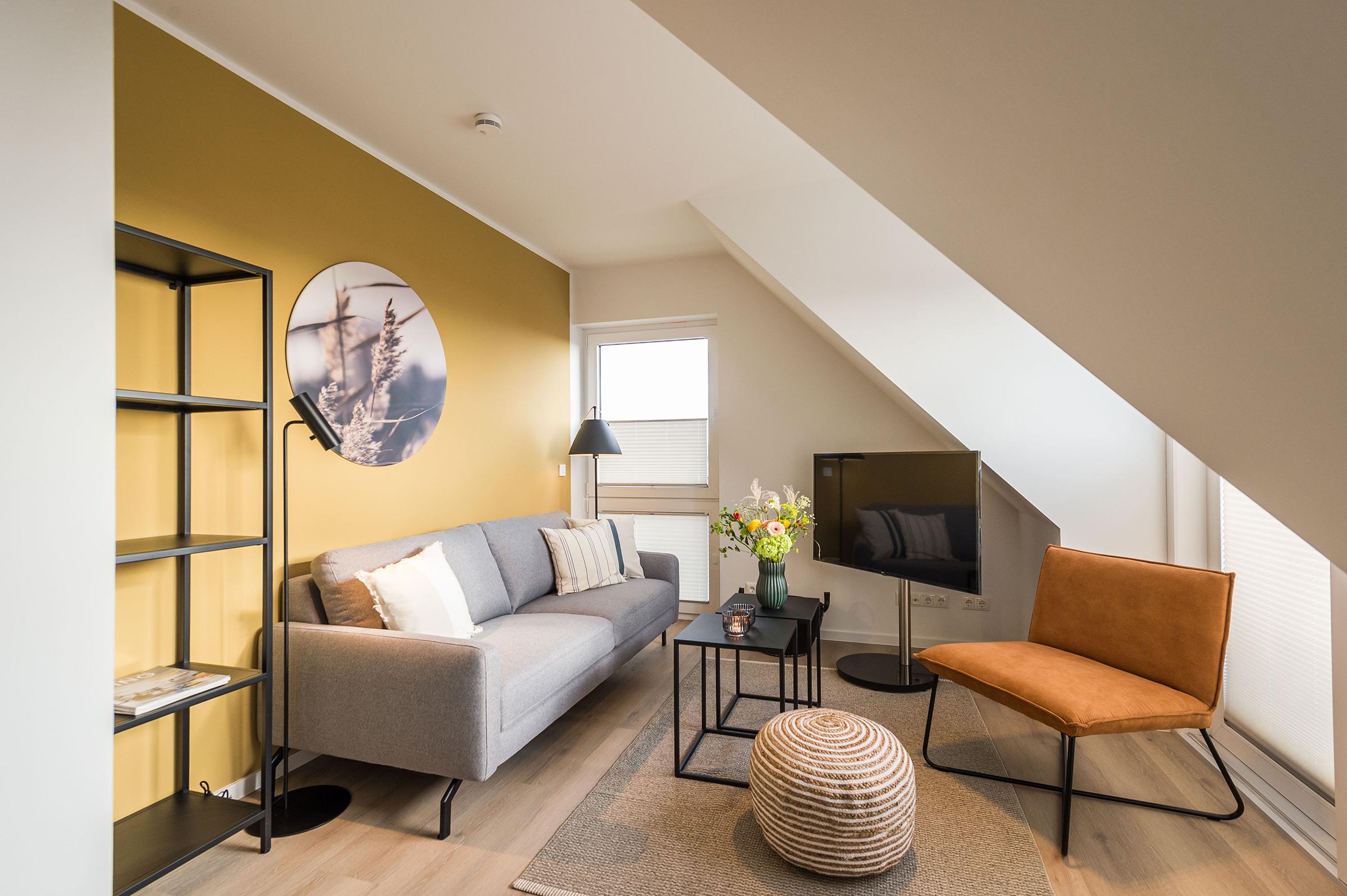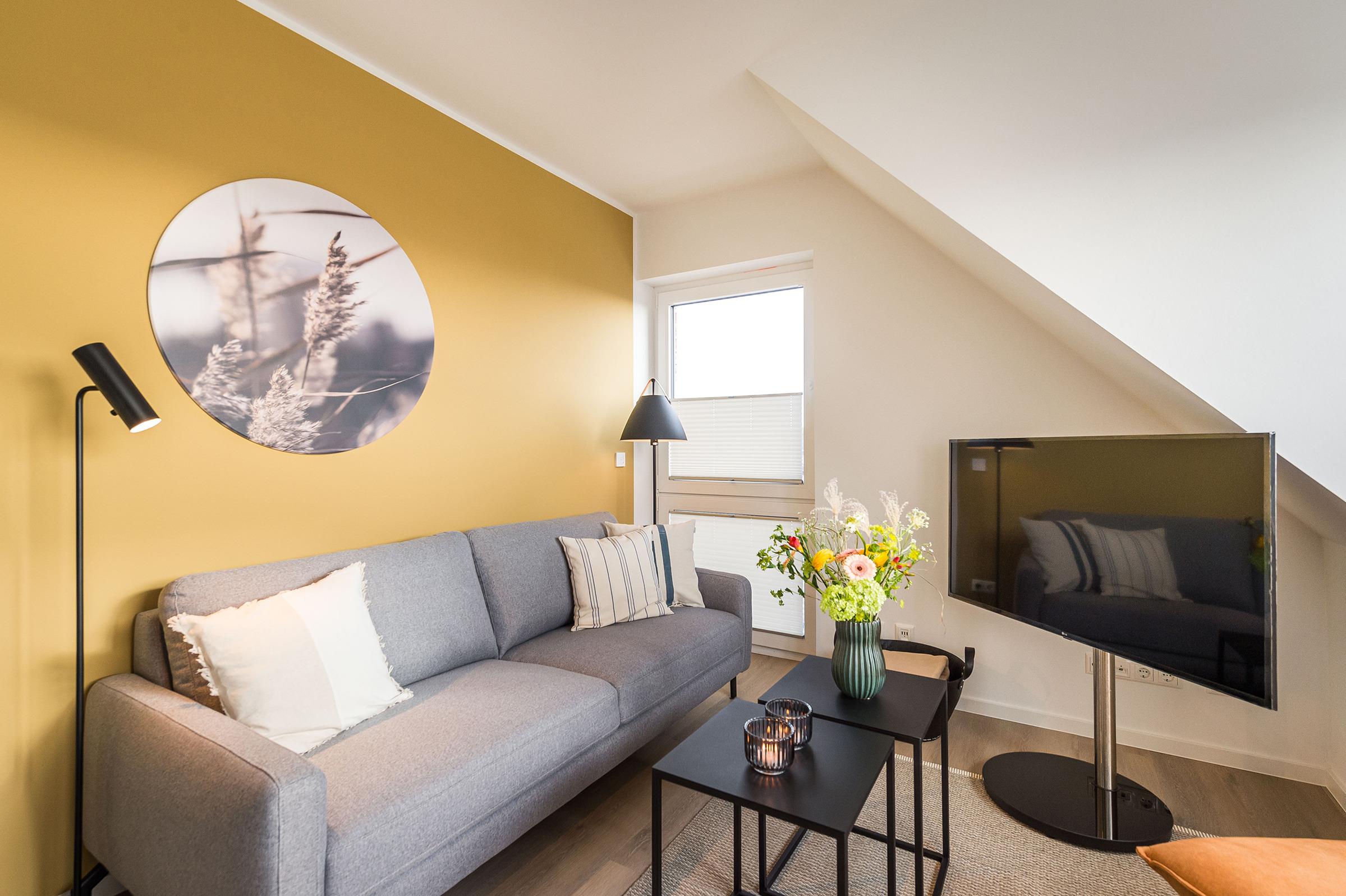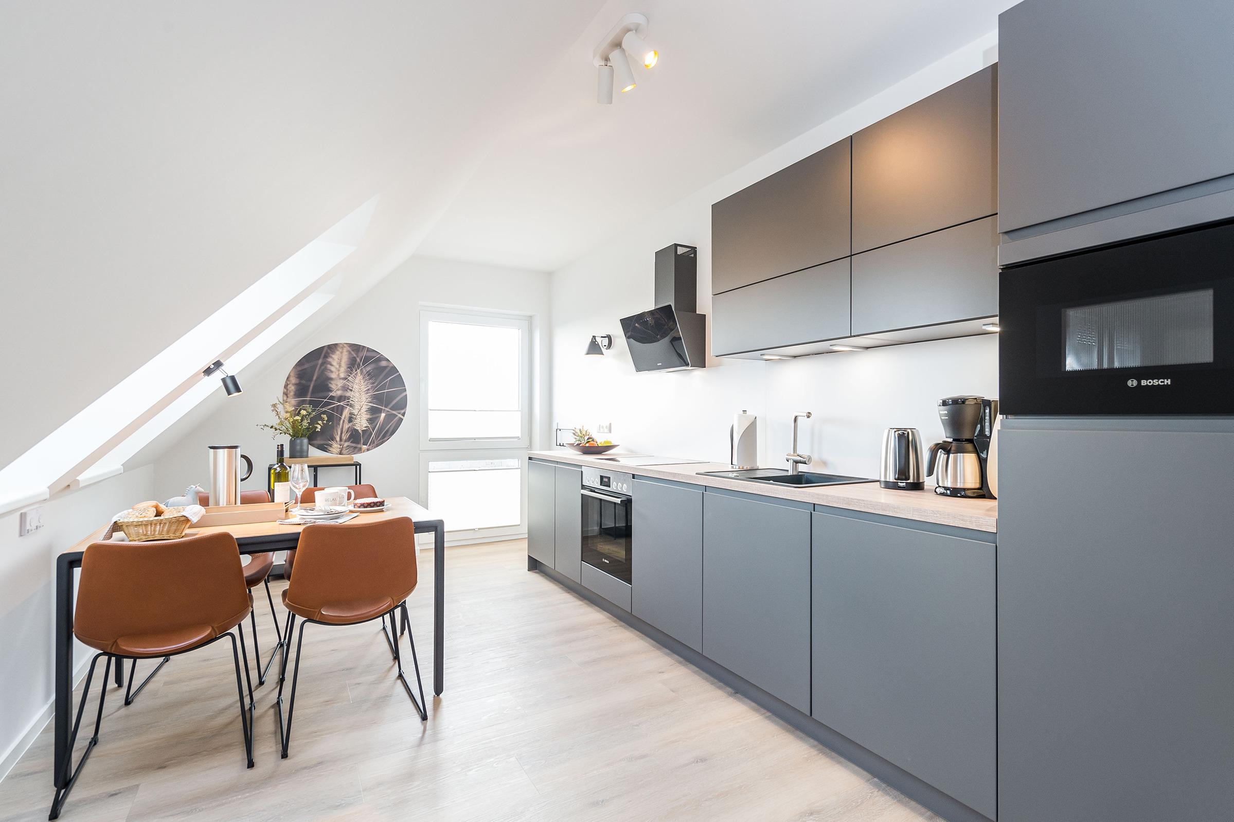 inkl. Gefrierfach, eine Mikrowelle sowie einen Waschtrockner. Im Wohnbereich erwartet Sie ein 50-Zoll-Smart-TV sowie der Zugang zur Dachterrasse. Die Dachterrasse ist ebenfalls mit einem Esstisch ausgestattet und bietet einen herrlichen, frontalen Blick auf die Ostsee. Selbstverständlich bieten wir schnelles und kostenfreies WLAN sowie einen PKW-Stellplatz direkt am Haus. Auf den hauseigenen Parkplätzen stehen Ihnen E-Auto-Ladegeräte (Wallboxen) zur Verfügung (gegen Gebühr). Aufgrund der Allergiker gerechten Ausstattung sind Haustiere nicht erlaubt.
