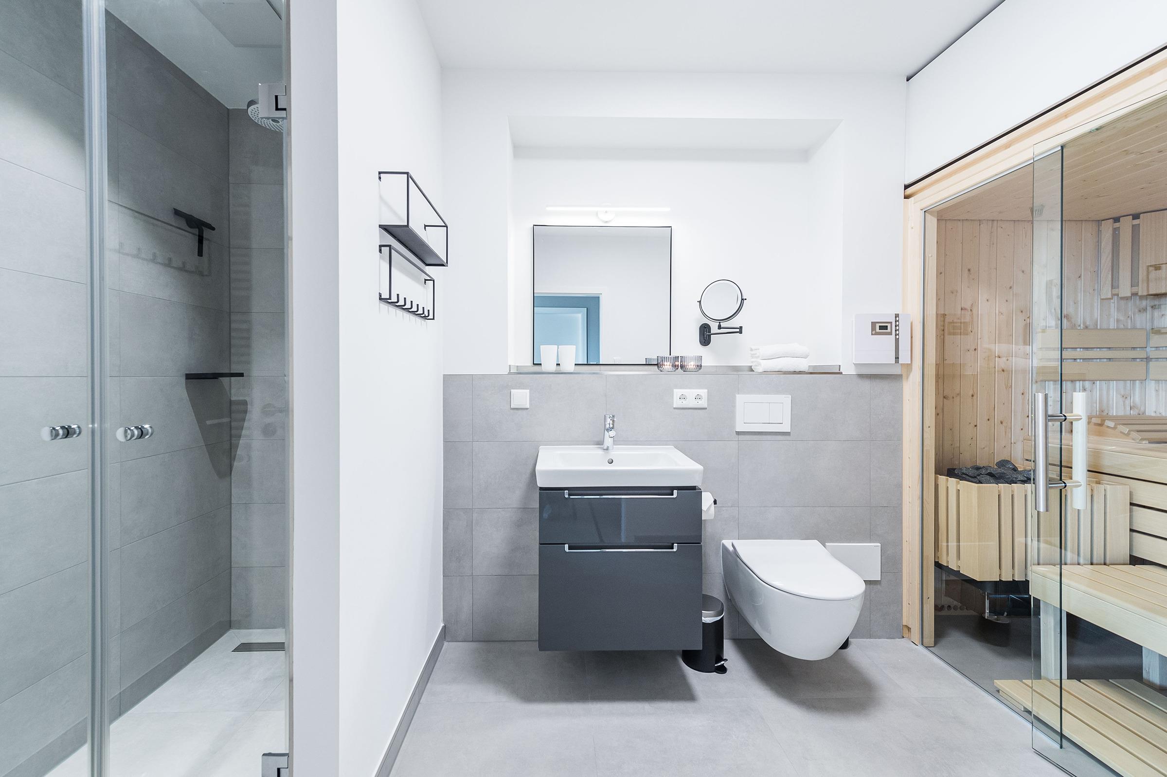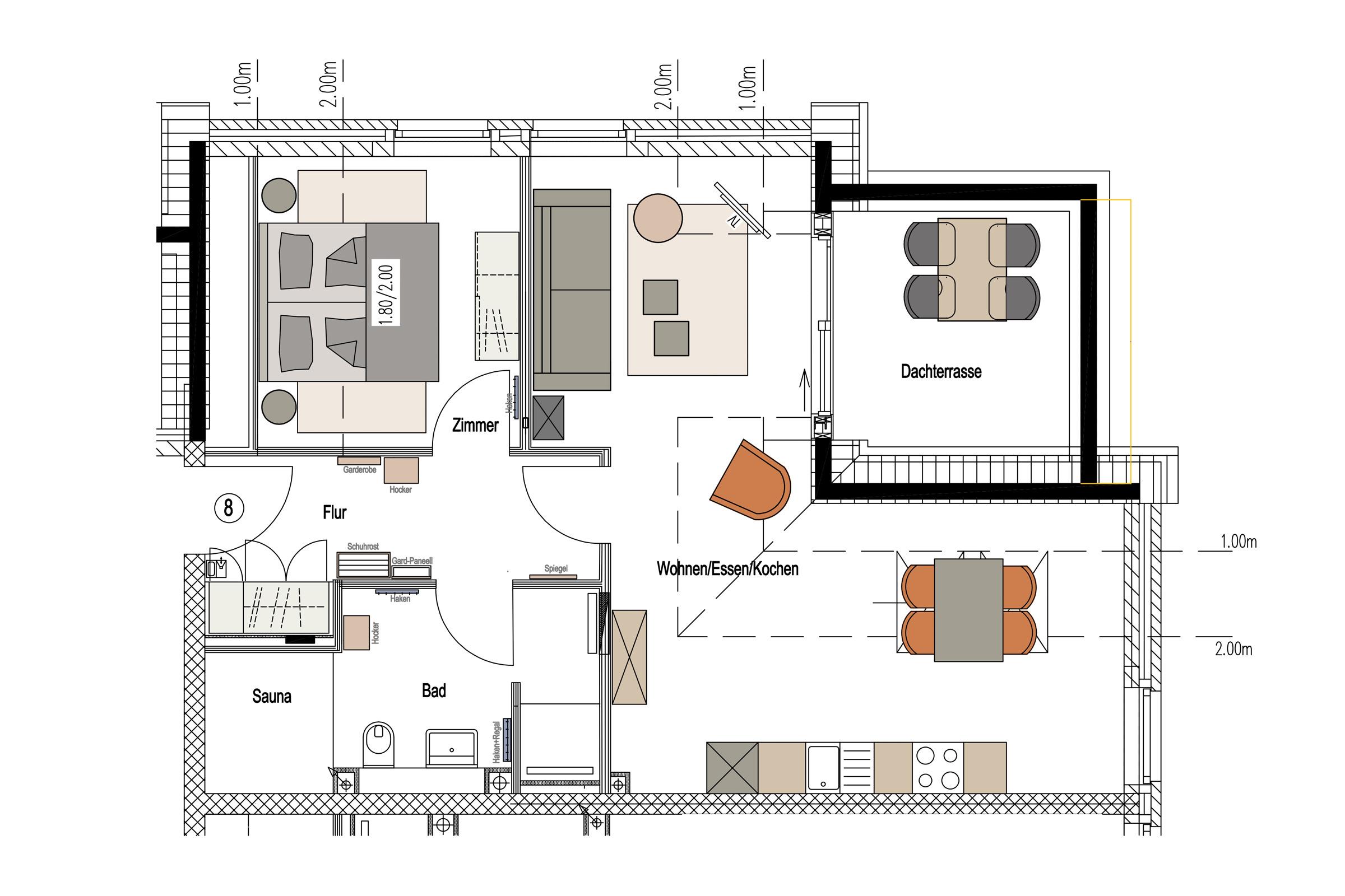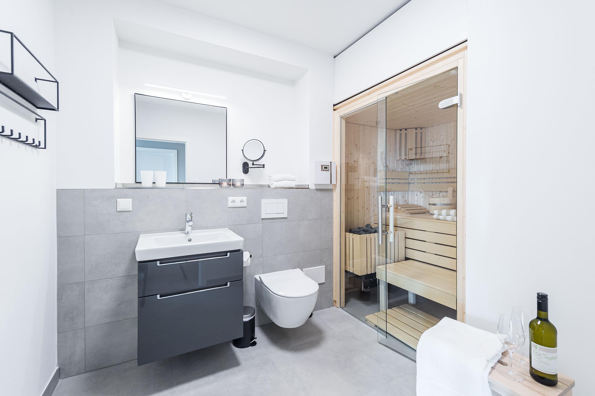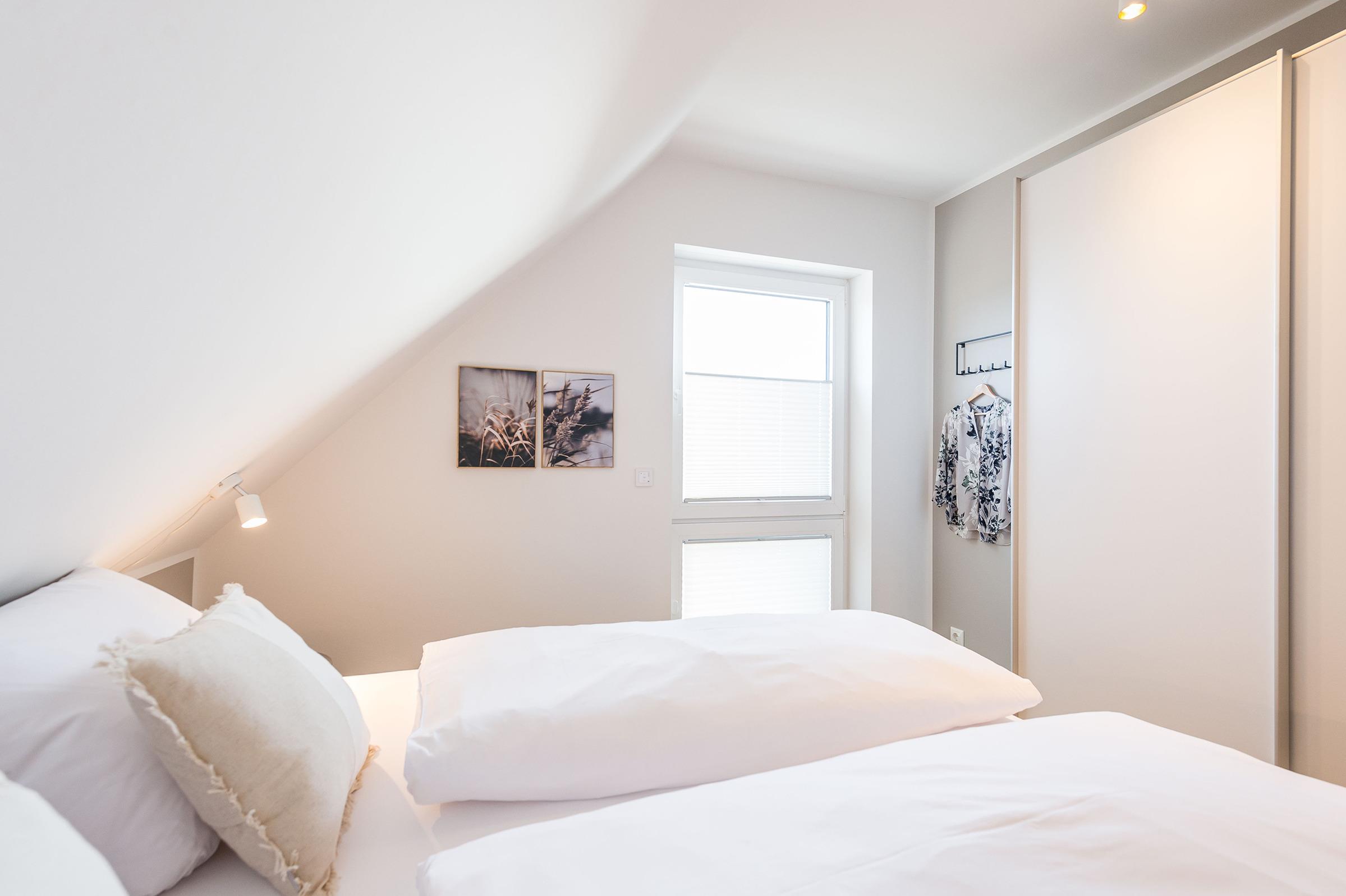 Sie ist für bis zu 2 Personen buchbar (1 Schlafzimmer mit Doppelbett 180 x 200 cm) und verfügt über eine gehobene 5-Sterne-Ausstattung: 1 Badezimmer, 1 Sauna sowie 1 Dachterrasse (frontaler Meerblick). Die Küche ist komplett ausgestattet und bietet zudem einen Esstisch für bis zu 4 Personen. Zudem gibt es einen Geschirrspüler, einen Kühlschrank