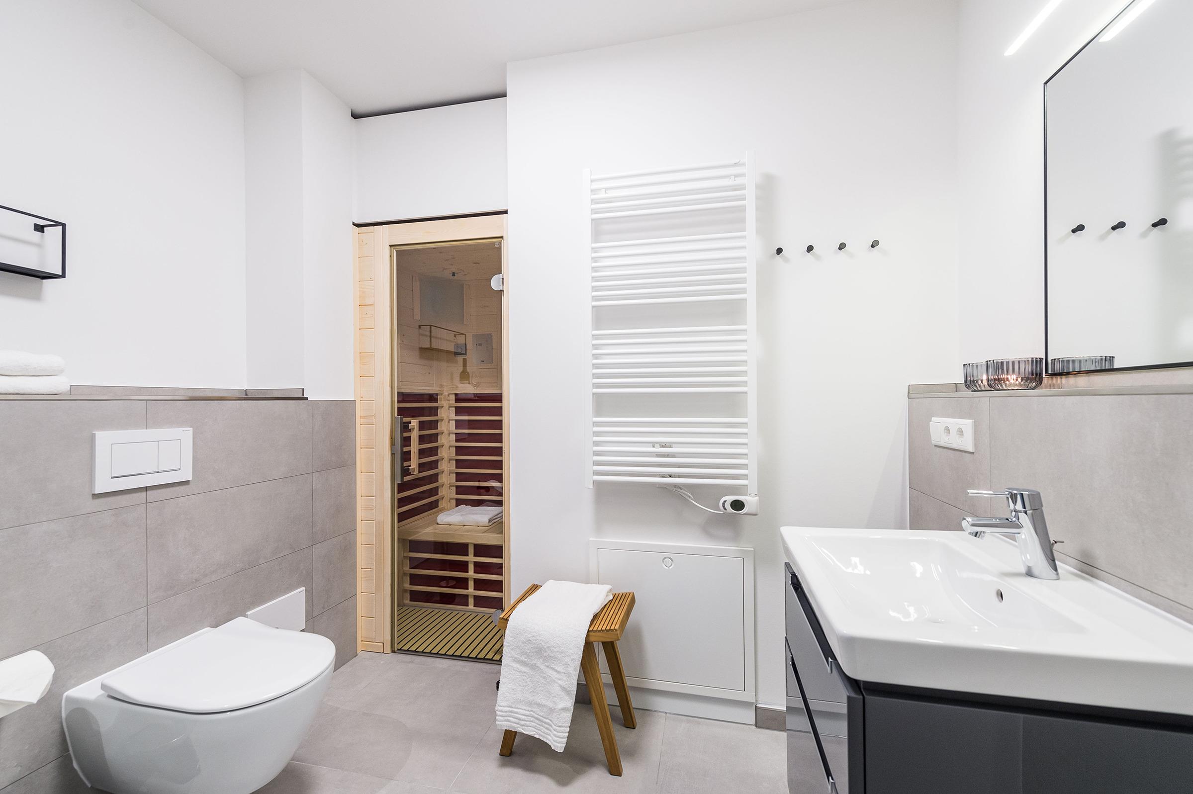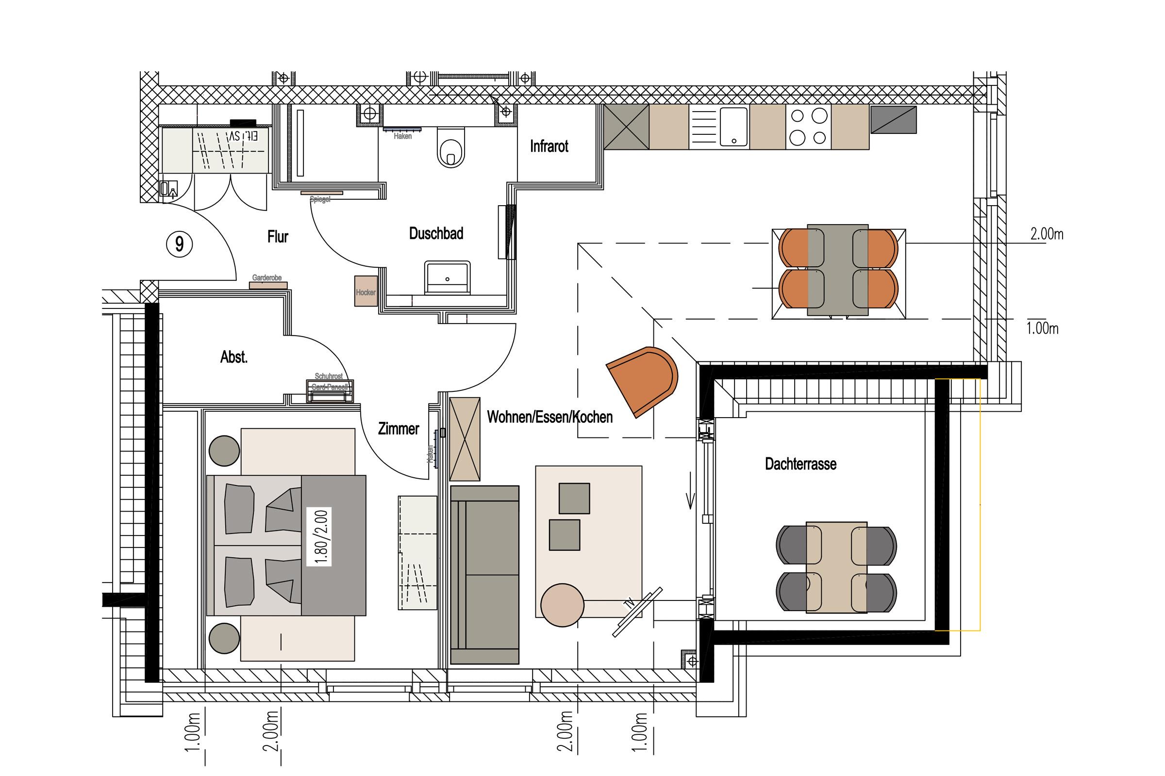 Sie ist für bis zu 2 Personen buchbar (1 Schlafzimmer mit Doppelbett 180 x 200 cm) und verfügt über eine gehobene 5-Sterne-Ausstattung: 1 Badezimmer, 1 Infrarotkabine sowie 1 Dachterrasse (frontaler Meerblick). Die Küche ist komplett ausgestattet und bietet zudem einen Esstisch für bis zu 4 Personen. Zudem gibt es einen Geschirrspüler, einen