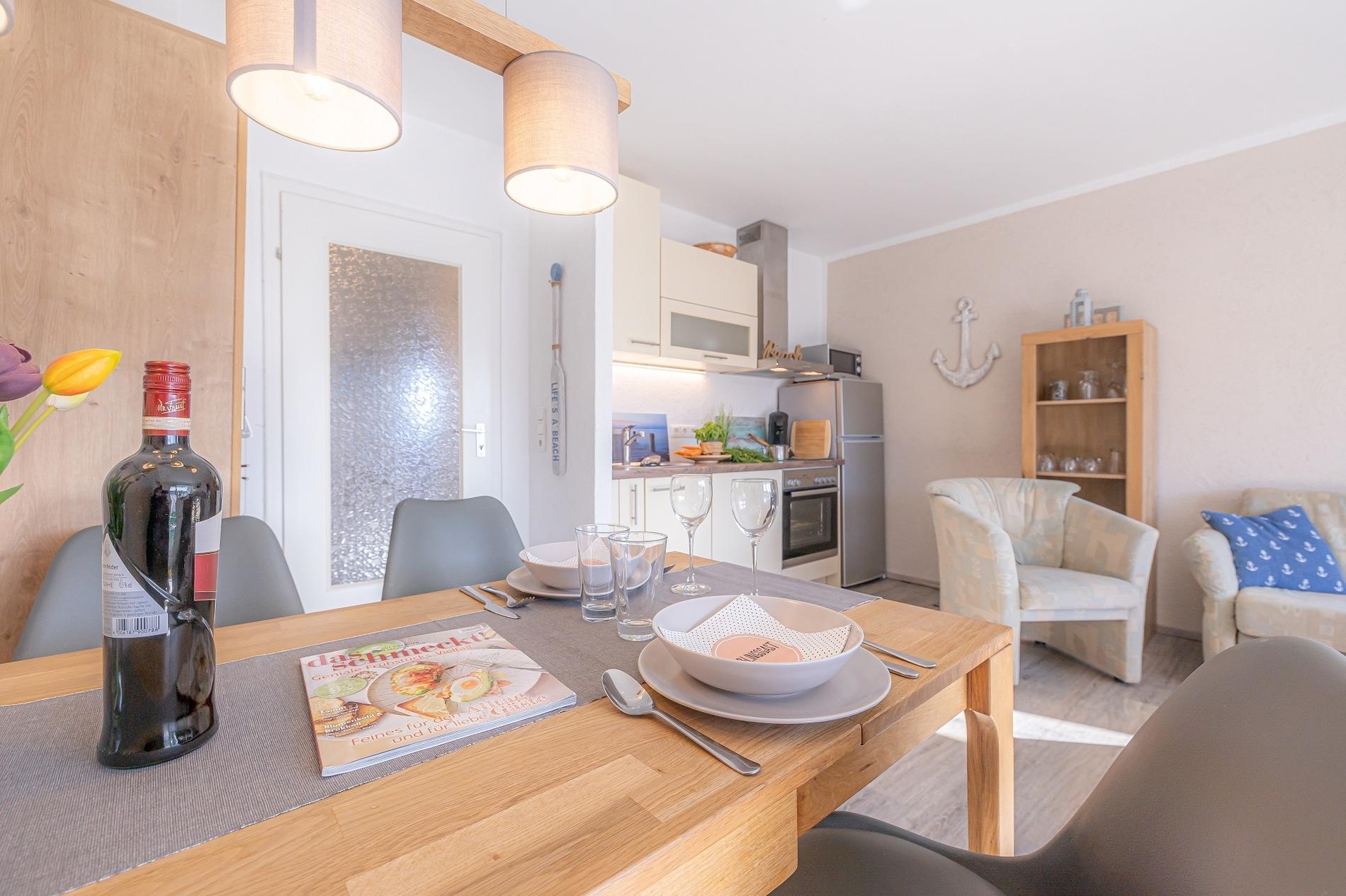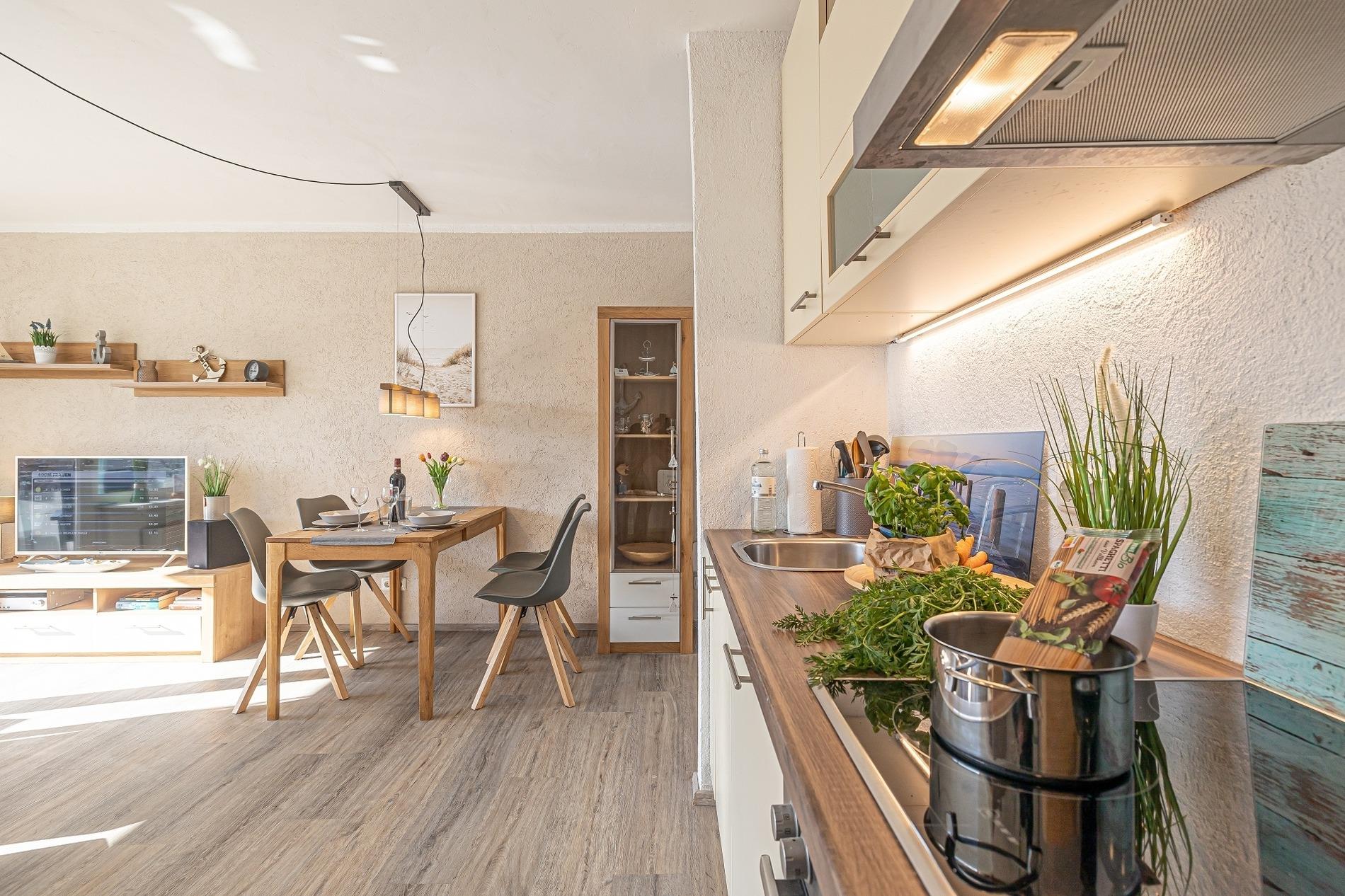 Die gut ausgestattete Küche verfügt über eine Spülmaschine, Cerankochfeld, Backofen, Kühlschrank mit Gefrierfach und diverse Elektrogeräte.
