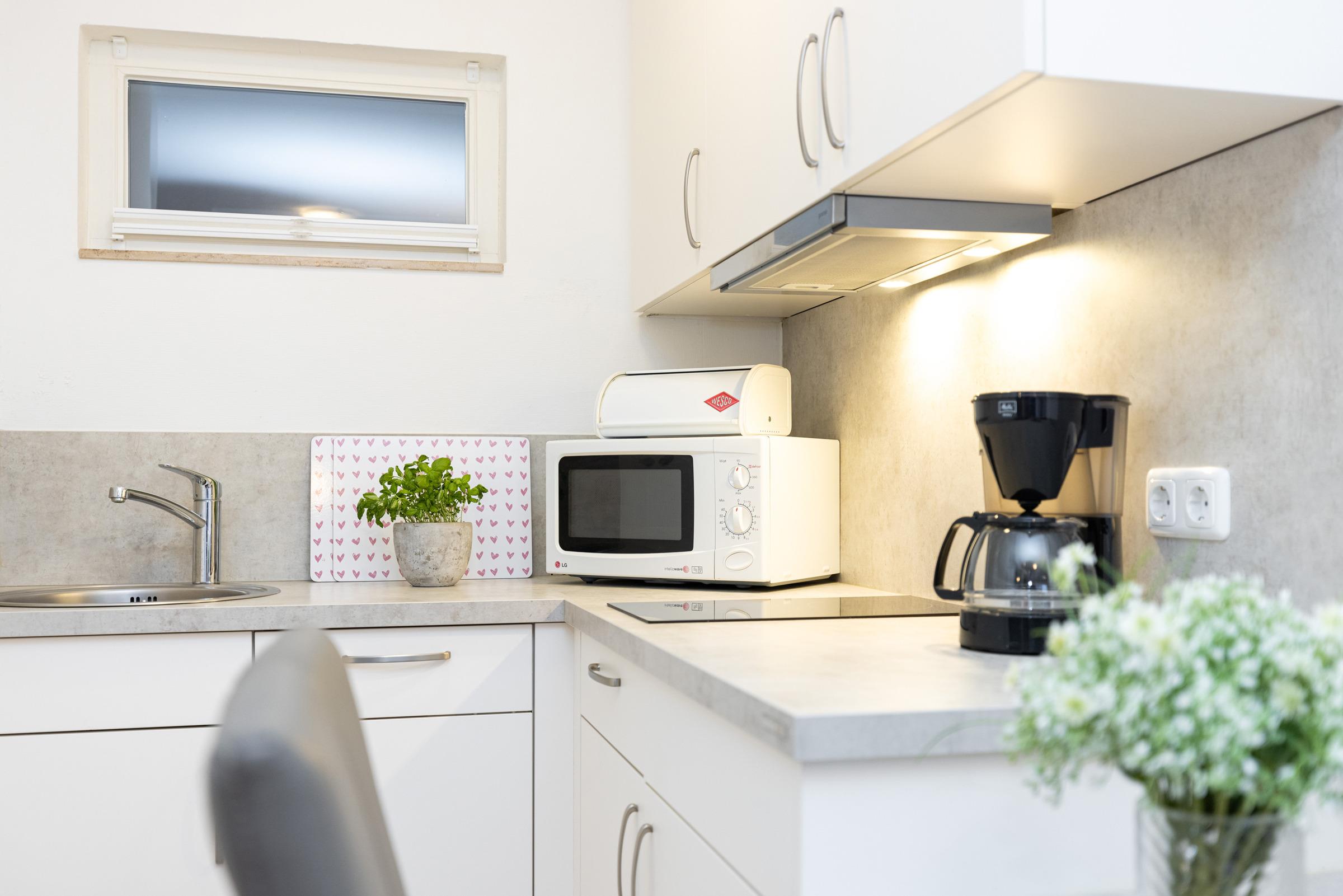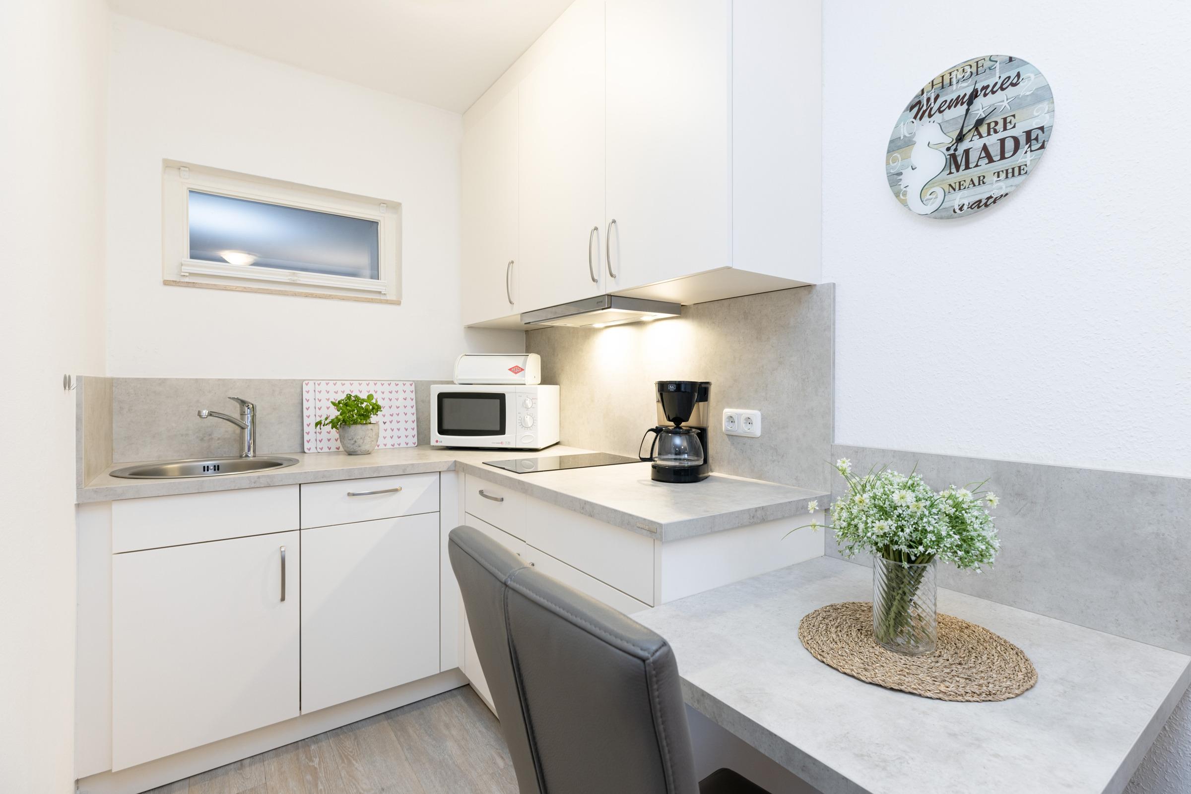 Die angrenzende Küche ist mit einem Kühlschrank mit Eisfach, einer Mikrowelle, einem Ceran-Kochfeld, einer Filterkaffeemaschine und einem Wasserkocher ausgestattet.