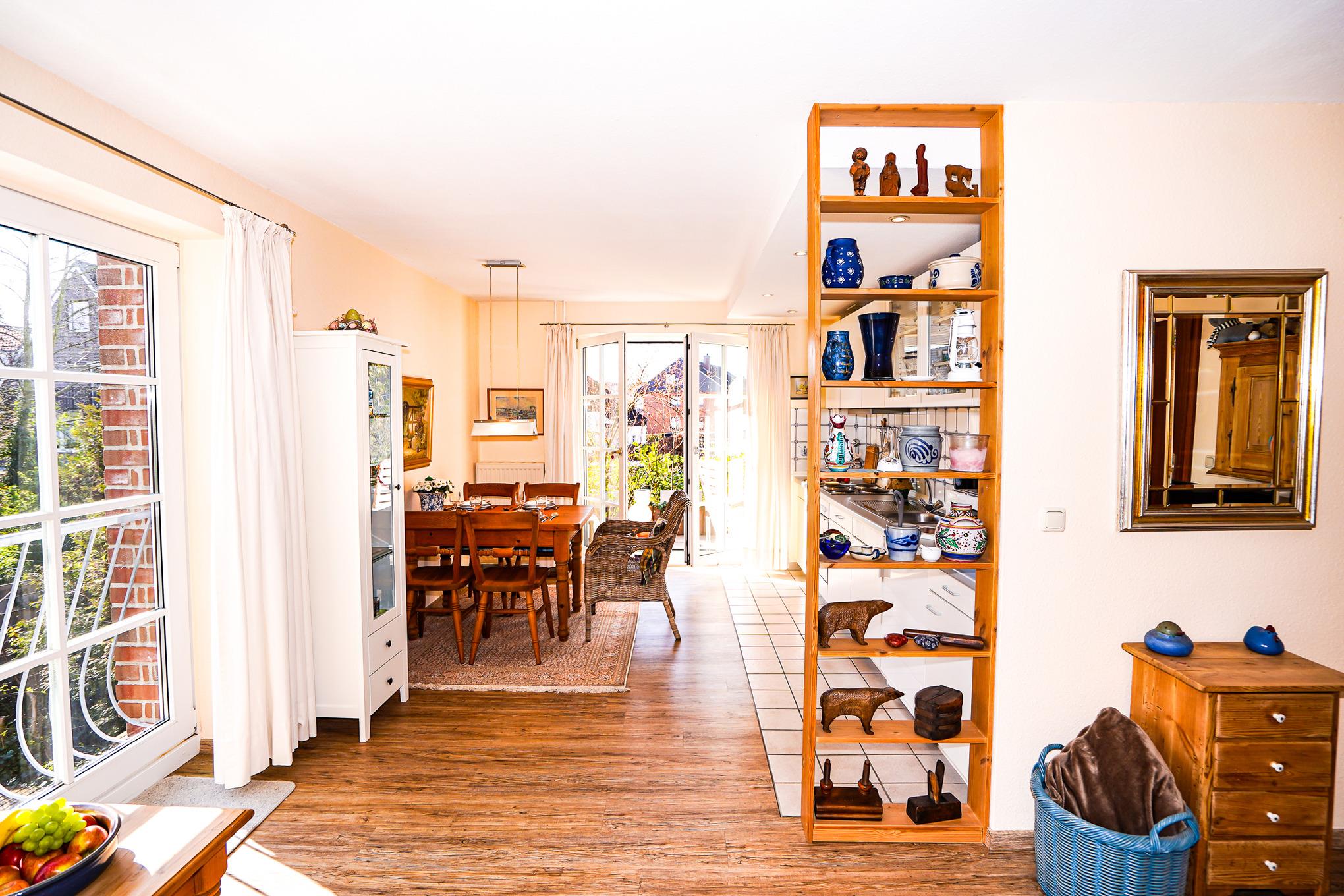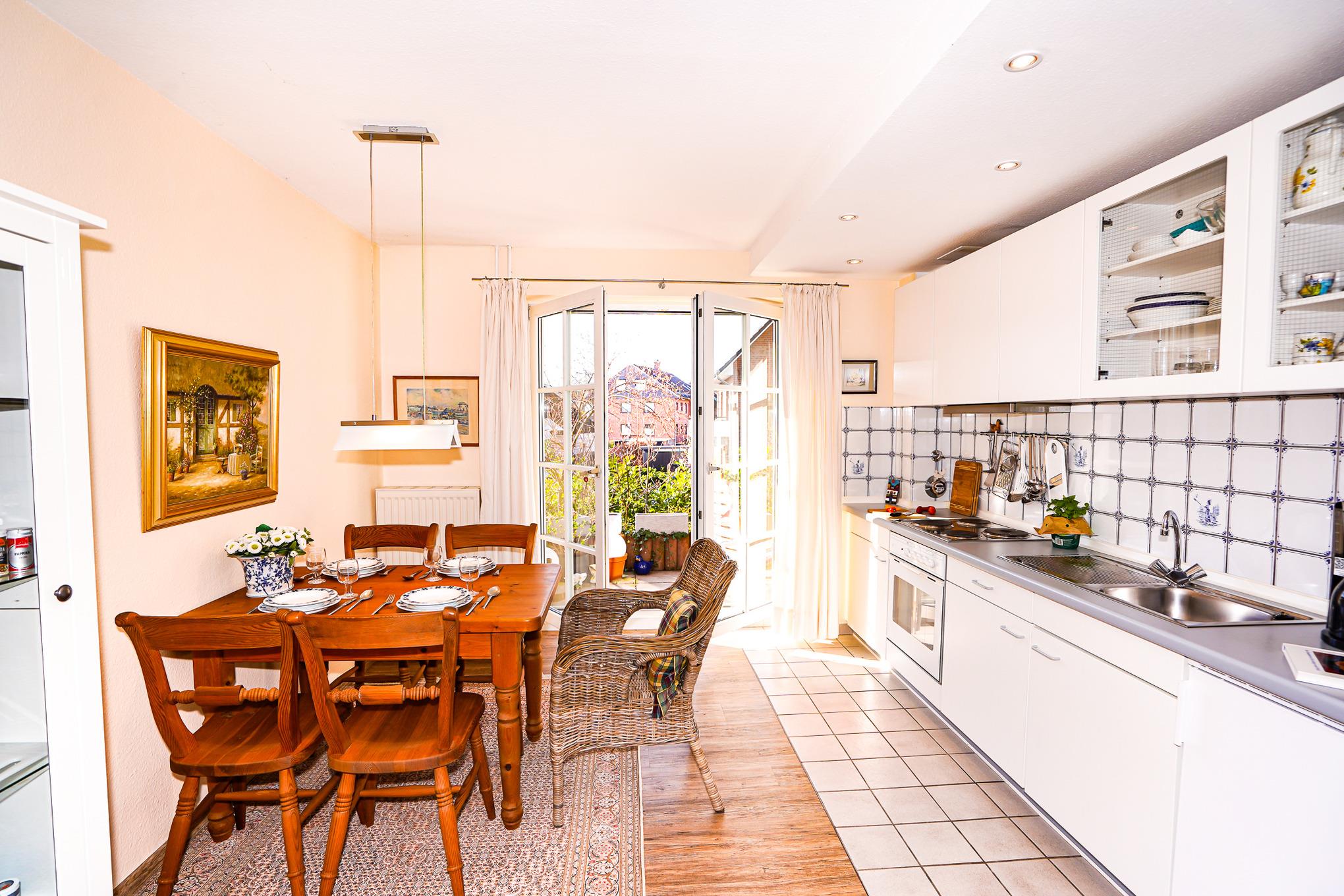 Vom Wohn-/Essbereich mit integrierter und gut ausgestatteter Küche geht es direkt auf die kleine Terrasse.