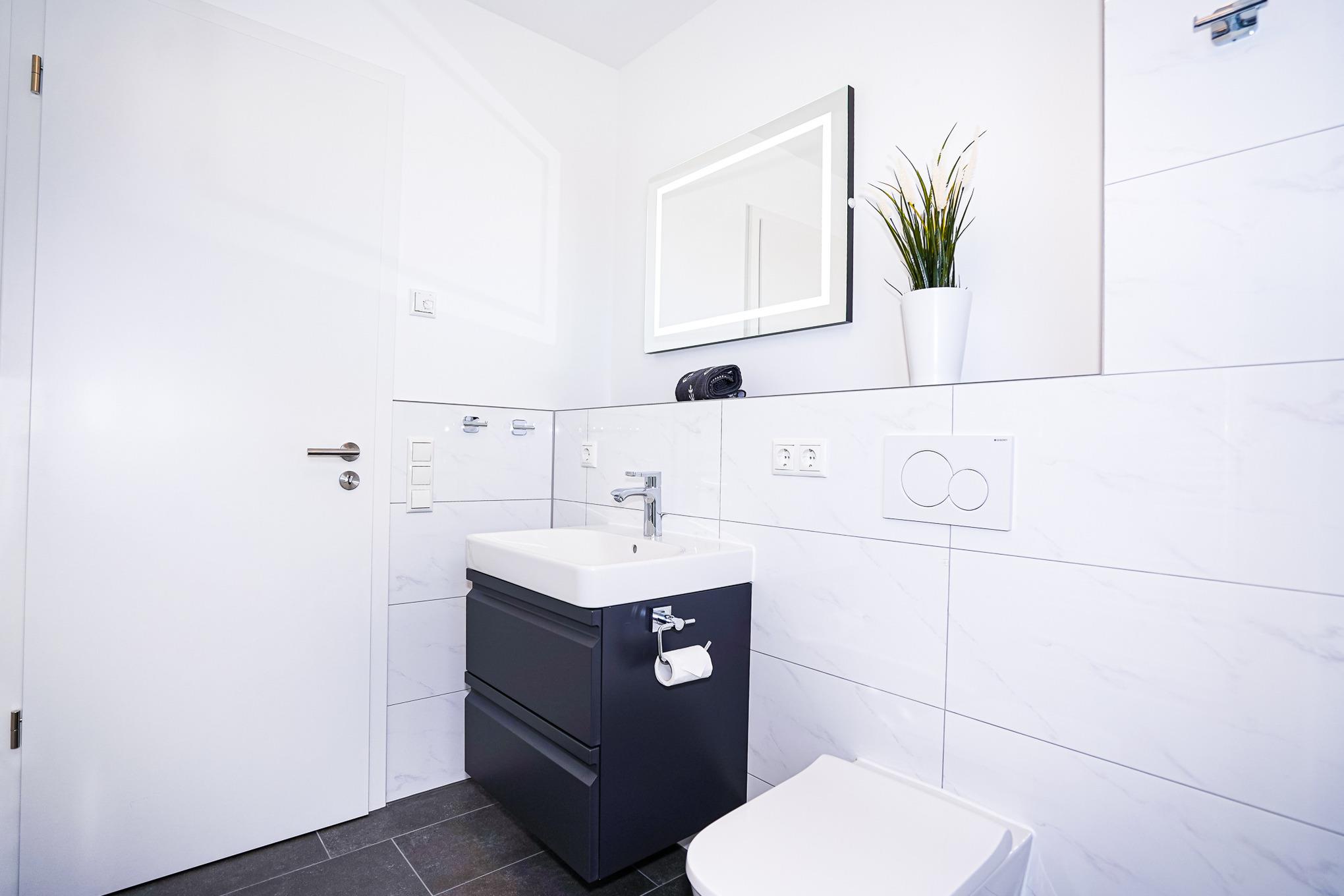 Im modernen Badezimmer mit Tageslicht finden Sie eine Fußbodenheizung, ein Handtuchheizkörper und eine bodengleiche Dusche mit Ablagemöglichkeiten. Highlight ist hier eine Waschmaschine inkl. Trocknerfunktion, welche Ihnen kostenlos zur Verfügung steht.
