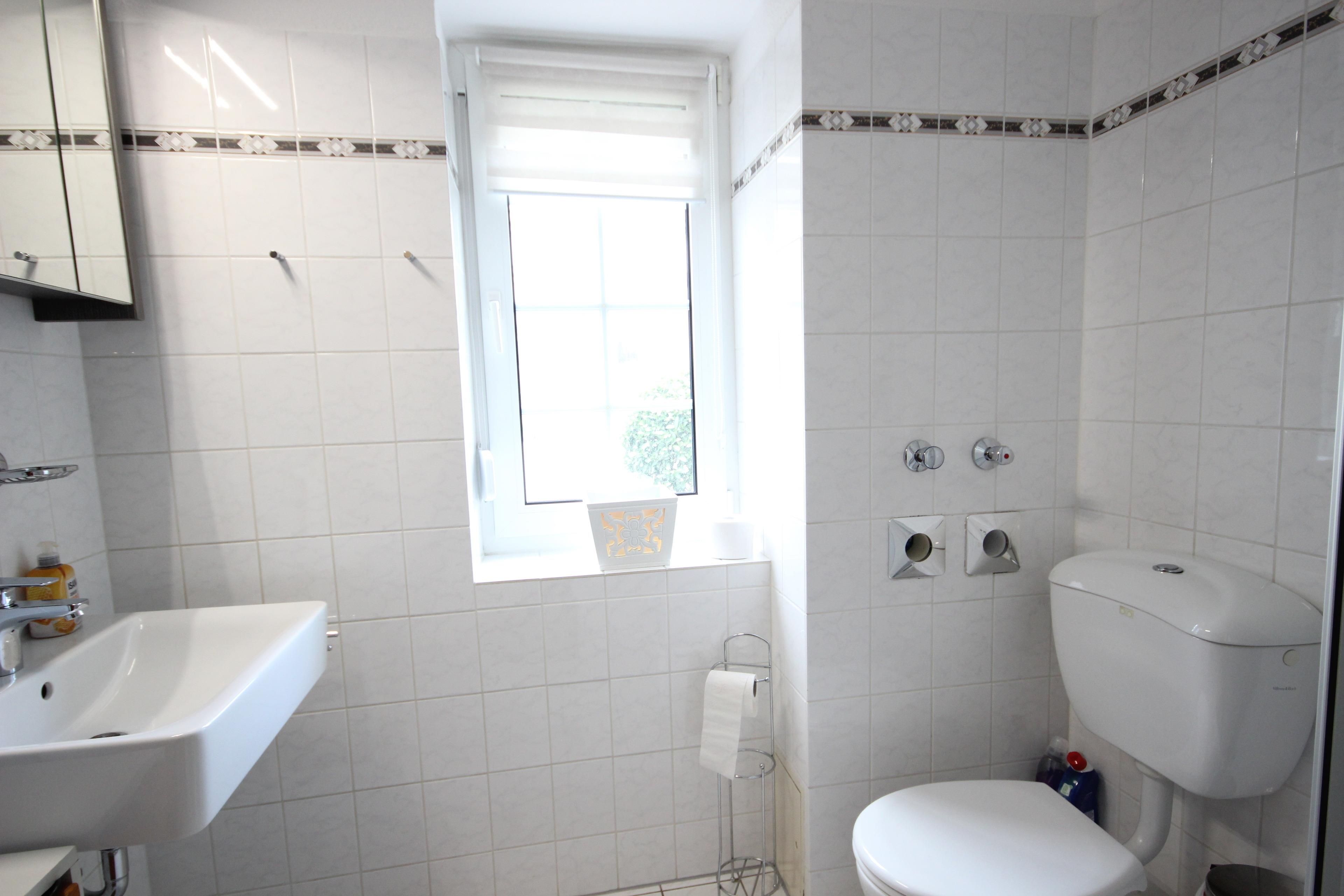 Hell gefliestes Tageslicht-Bad mit WC, Waschbecken und Duschkabine.