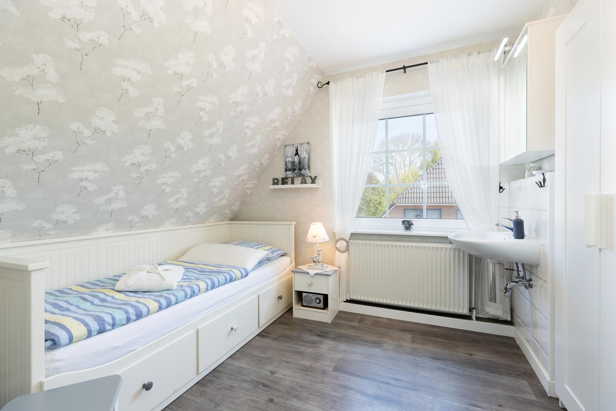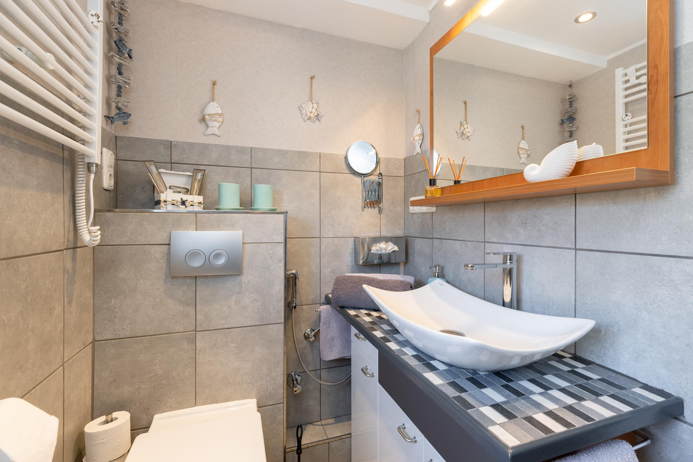 Im Duschbad (OG) stehen Kosmetikspiegel, Föhn und und bei Buchung des Wäsche-Sets neben Handtüchern auch Bettwäsche, Geschirrtücher und Duschmatte bereit. Die Betten sind bei Anreise dann selbstverständlich bereits bezogen. Im Erdgeschoss gibt es ein separates Gästebad mit WC und Waschtisch.
