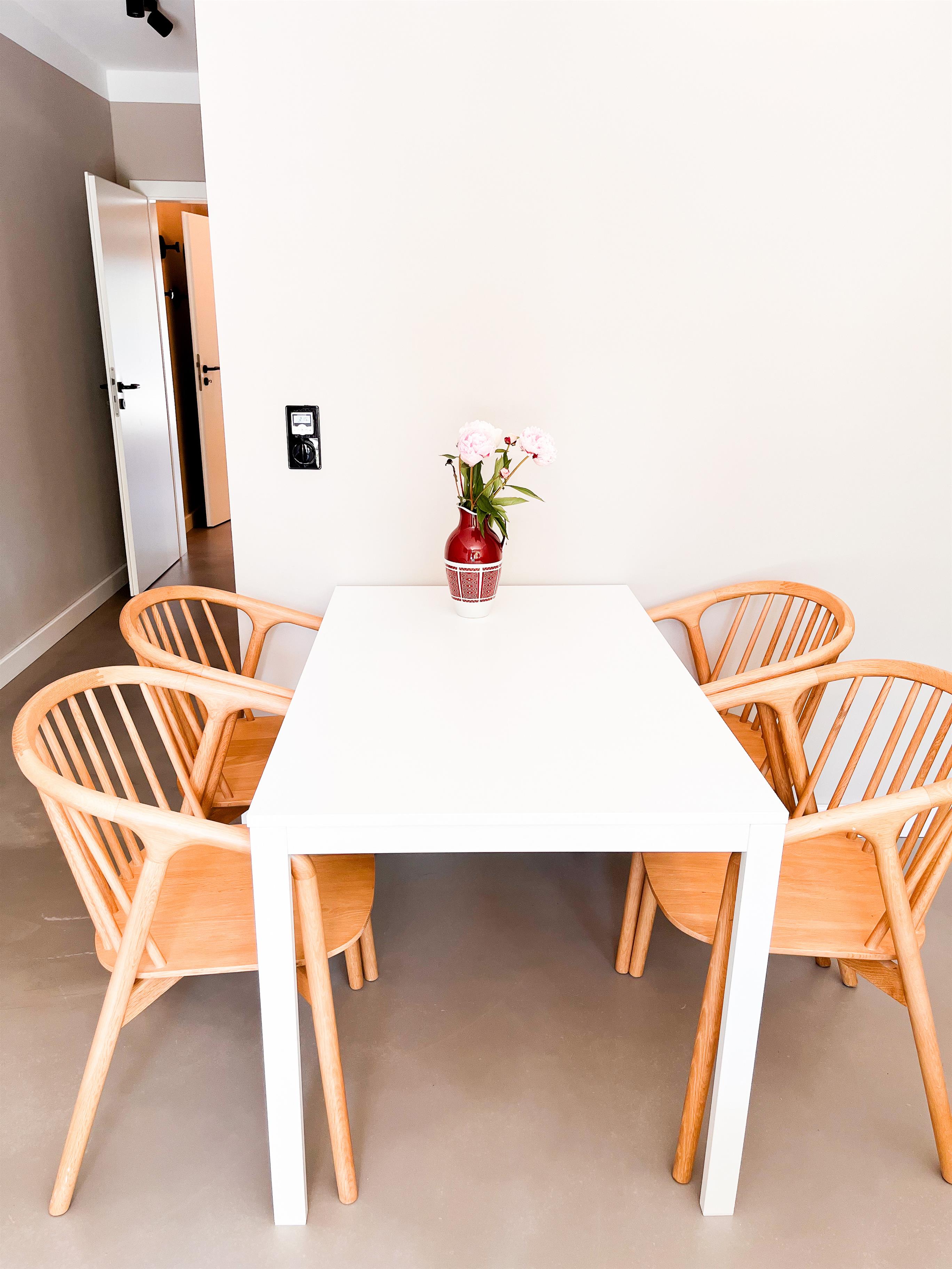 ein Essplatz mit Stühlen, ein großer TV & Kleiderschrank. Hier haben Sie Zugang zur sonnigen, möblierten Terrasse (aktuell noch Gemeinschaftsterrasse).